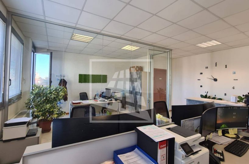 L’immobile è suddiviso in tre vani mediante pareti in cartongesso e pannelli di vetro, vi è un servizio, una cantina uso archivio e di un garage.