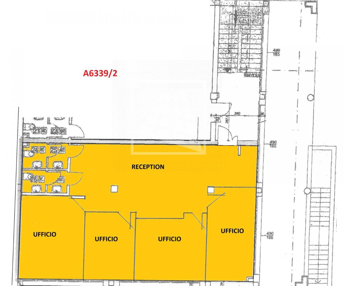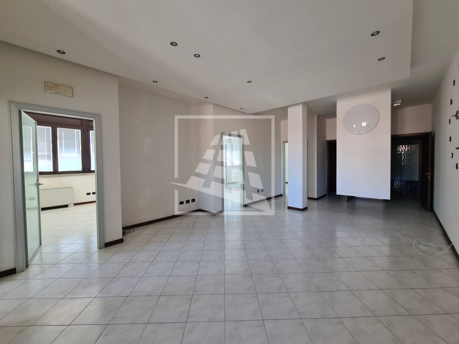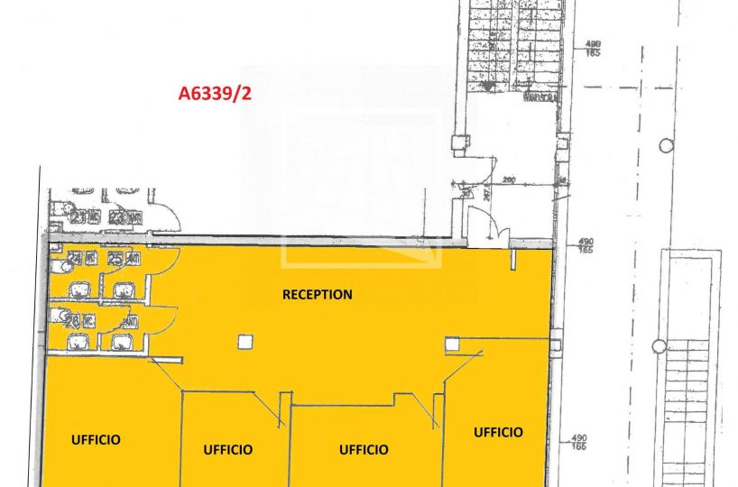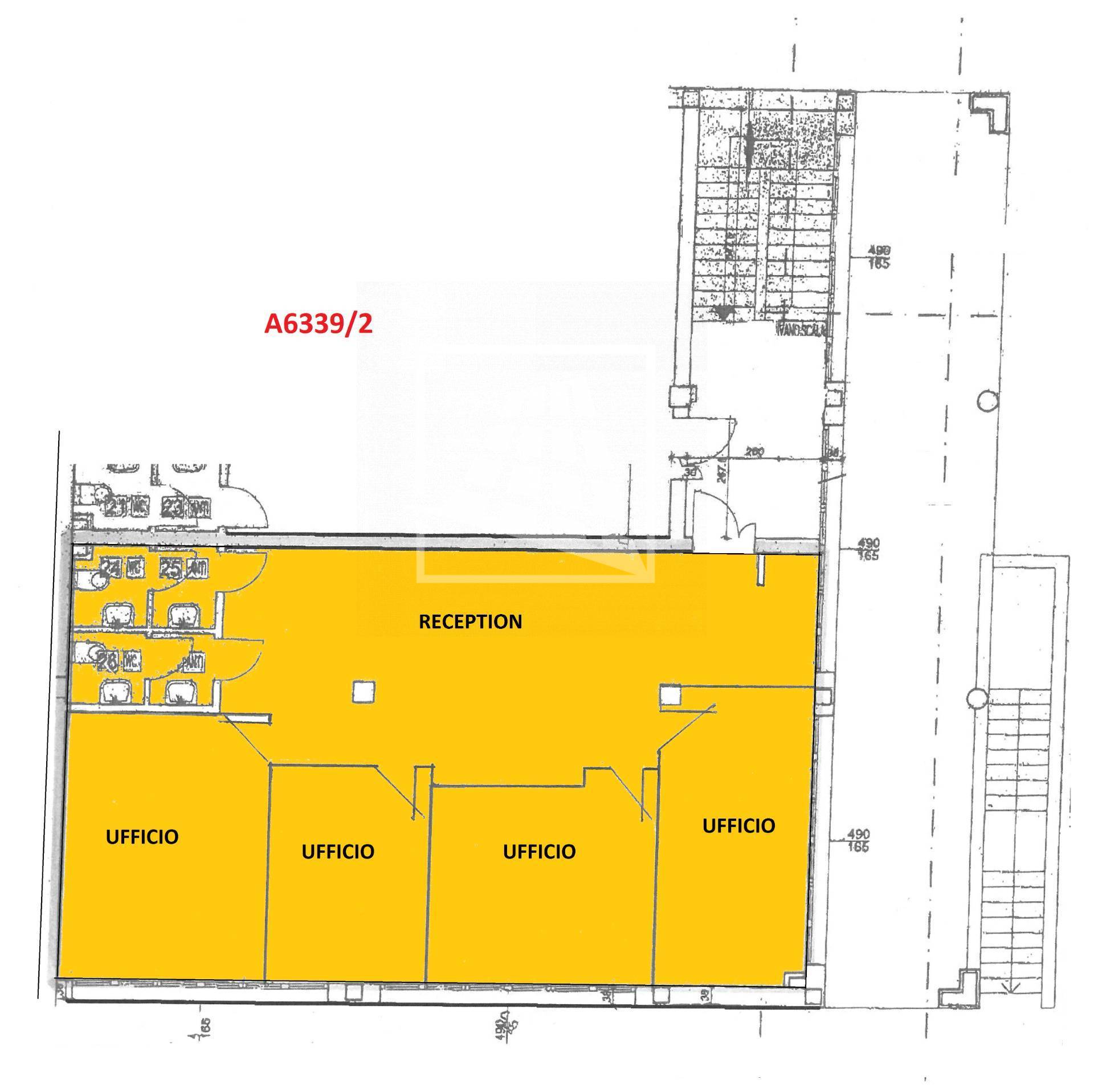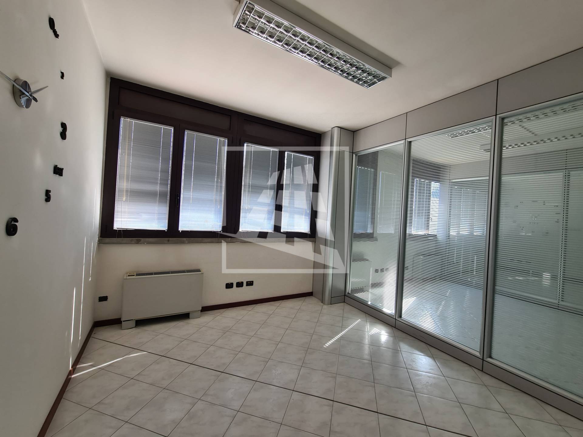 L’ingresso è indipendente, con ampia reception/sala attesa e quattro vani ricavate mediante pareti attrezzate mobili e cartongesso, doppi servizi con antibagno.