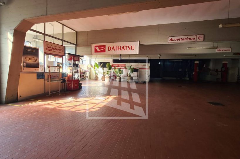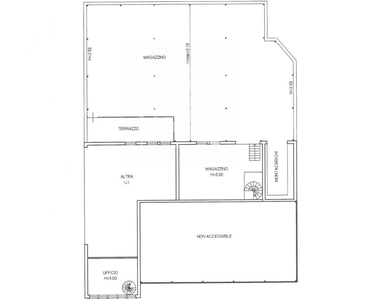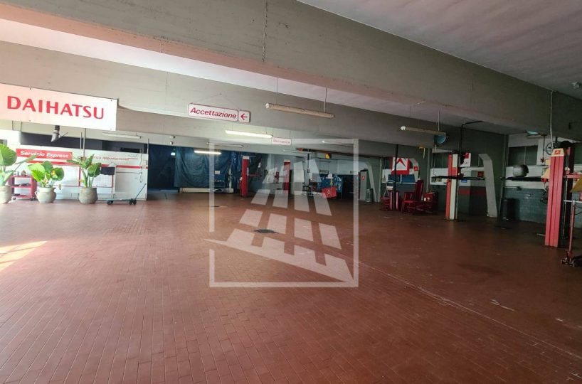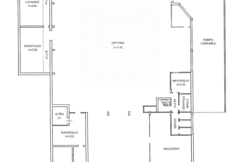 • piano seminterrato accessibile tramite rampa di mq 670 per altezza m 3,50 con officina, magazzino, servizi, centrale termica, ripostigli e lavaggio, sono presenti cinque portoni indipendenti.