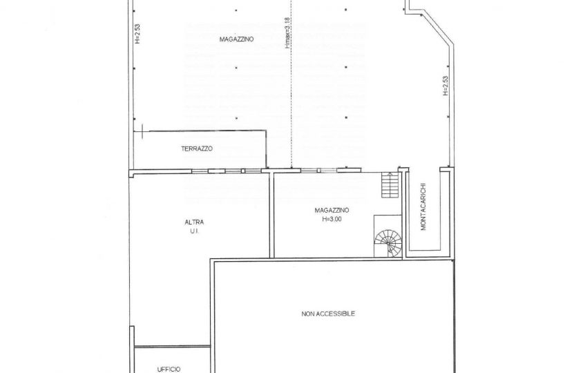 • piano primo di mq 445, di cui magazzino con montacarichi di mq 359 per altezza m 2,53, altro magazzino con altezza m 3,00 e ufficio.