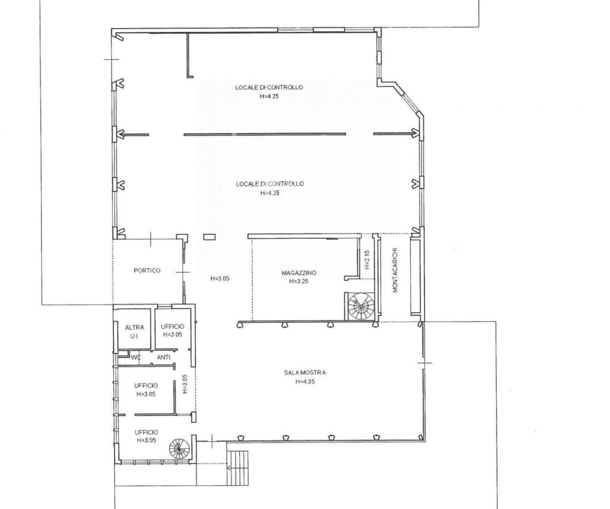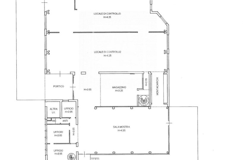 • piano rialzato di mq 595 con sala mostra e magazzino altezza m 4,35, deposito altezza m 3,25 e uffici, due portoni indipendenti e accessi pedonali.