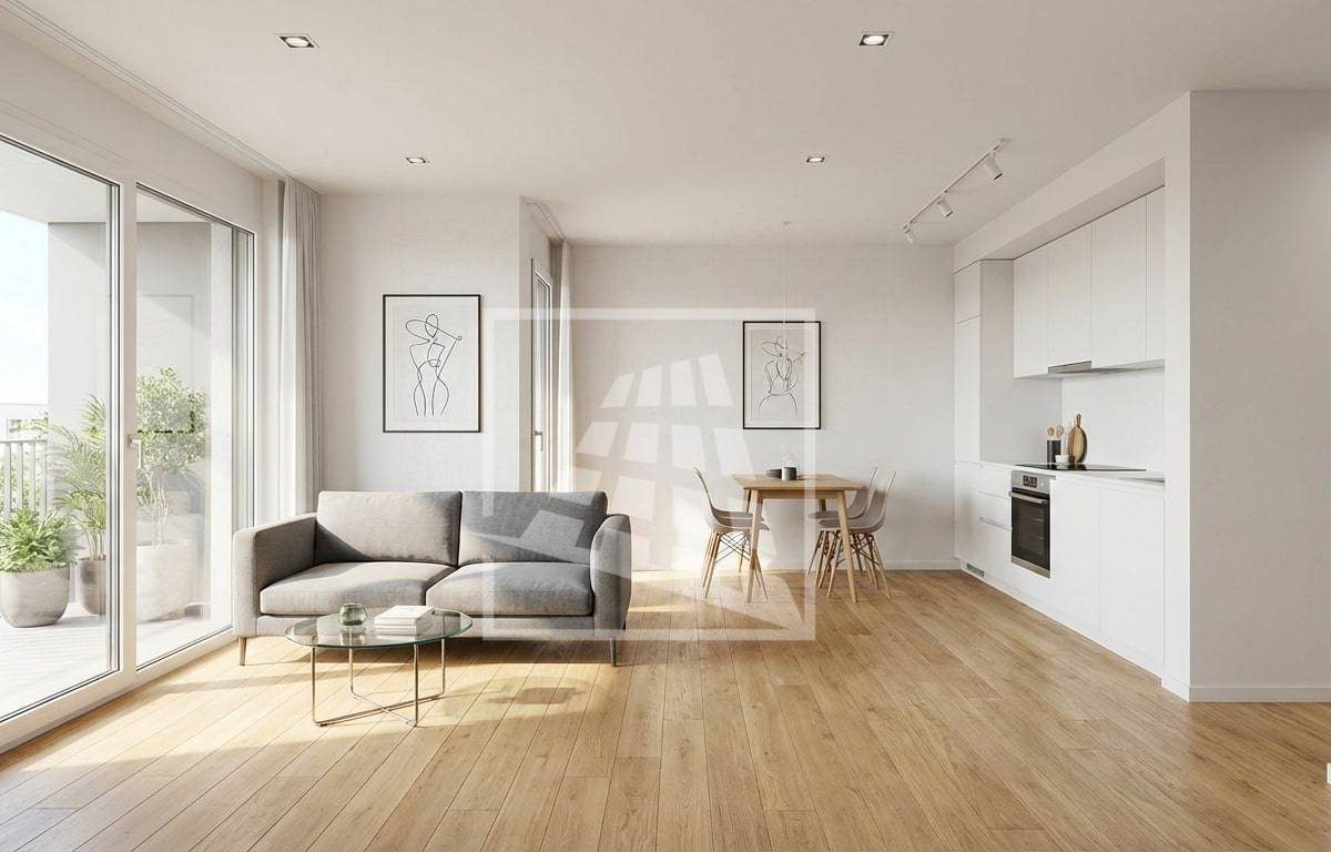 si compone di: ingresso su soggiorno con angolo cottura e balcone, disimpegno, bagno finestrato e una camera matrimoniale.