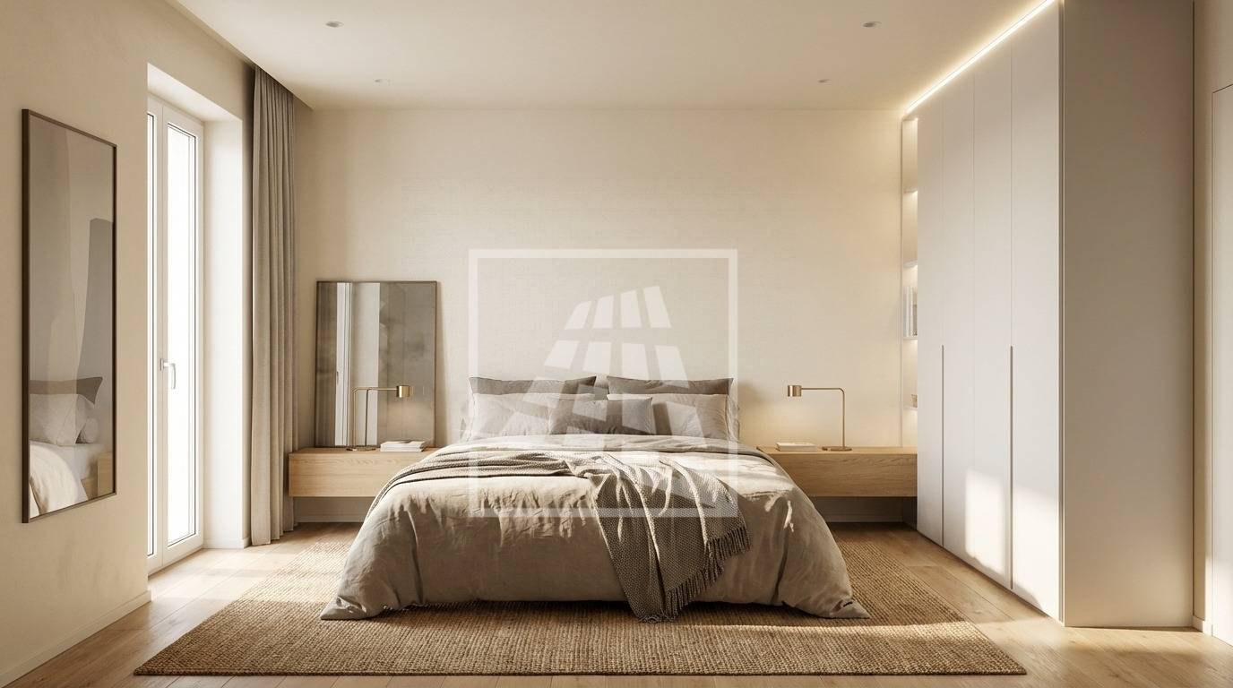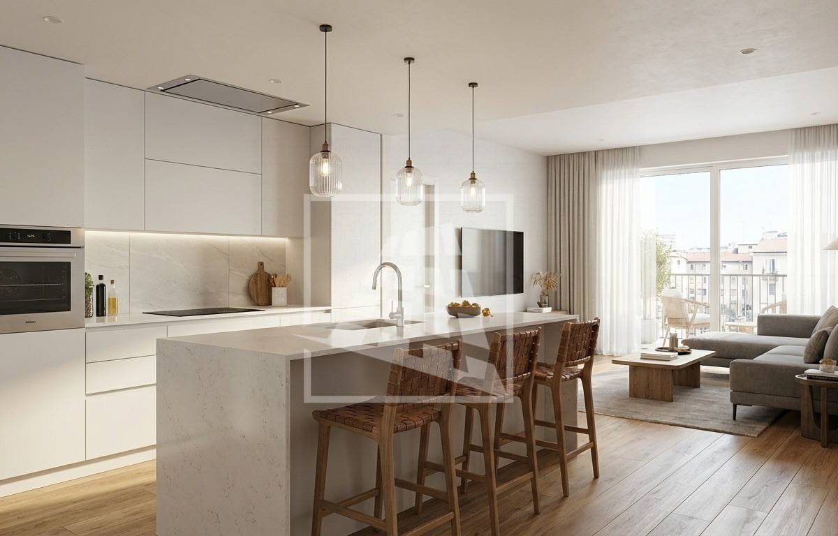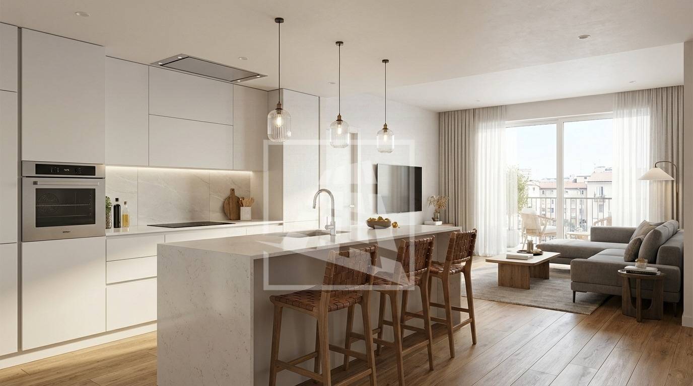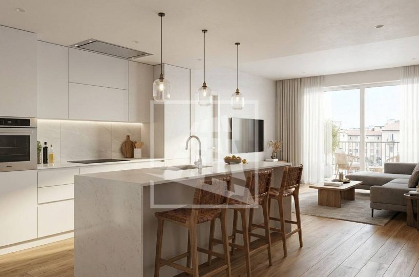 Ingresso su soggiorno/sala da pranzo con cucina a vista e grande terrazzo di 27 mq, disimpegno che separa la zona notte: una camera da letto matrimoniale e bagno finestrato.