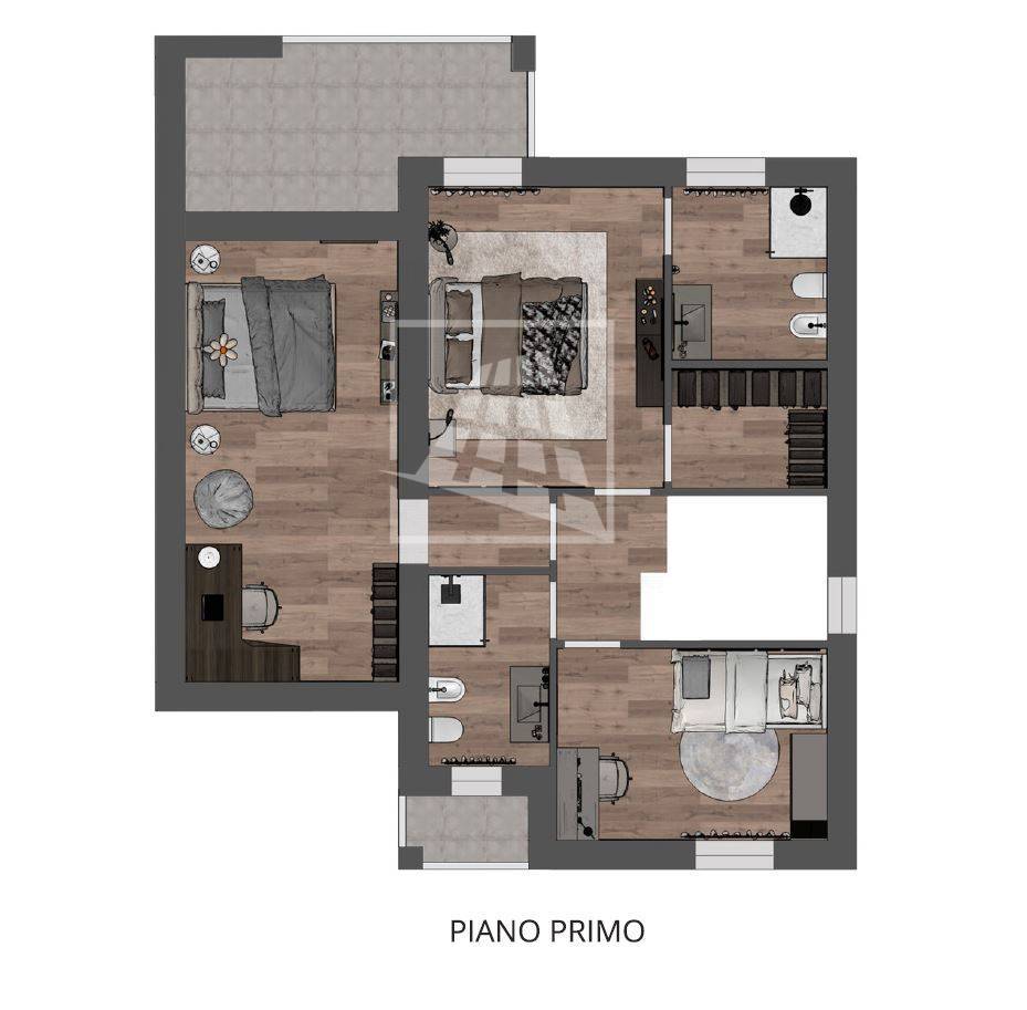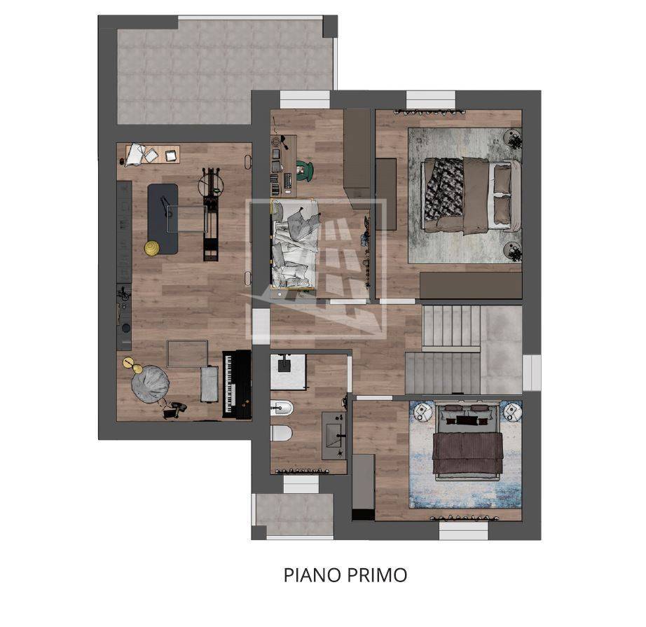 Vi è la possibilità inoltre di realizzare una cucina open space nella zona giorno e dotare il piano superiore del terzo bagno ridisponendo le camere: un camera matrimoniale con guardaroba ed una camera singola.