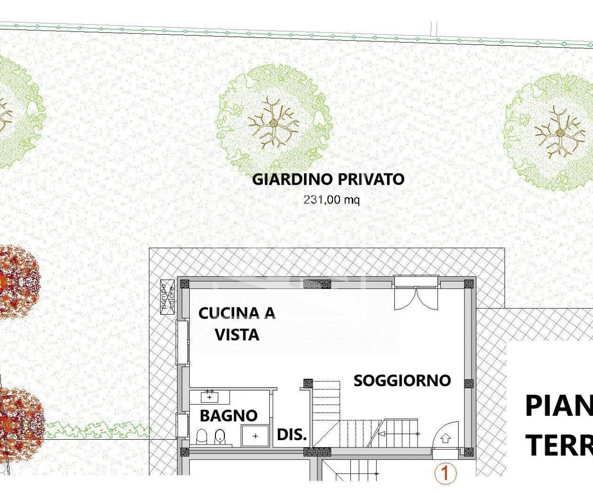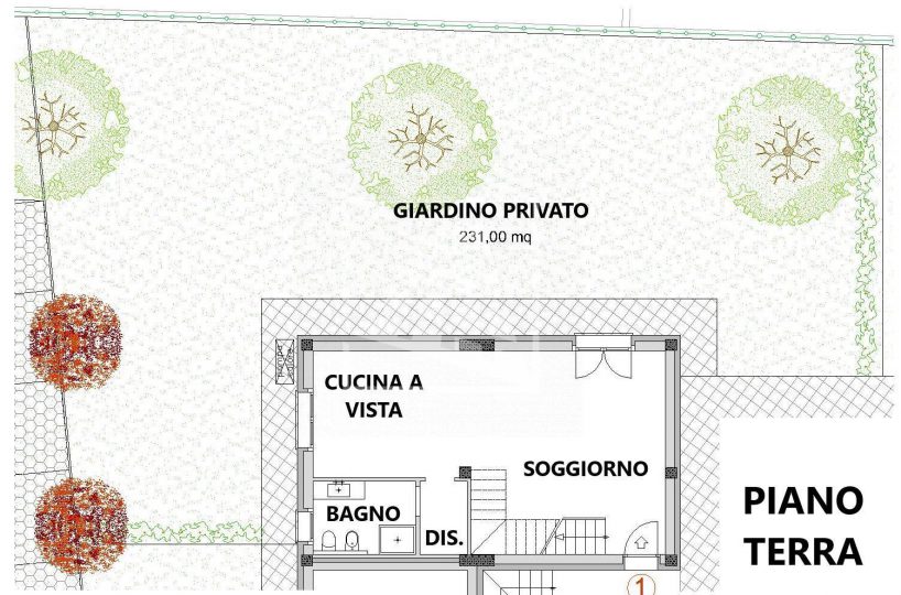 L’unità, disposta su due livelli, è composta al piano terra da un’ampia zona giorno studiata per consentire la massima vivibilità dell’abitazione che comprende un salone con cucina a vista, con accesso diretto all’ampio giardino, disimpegno e bagno di servizio con finestra.