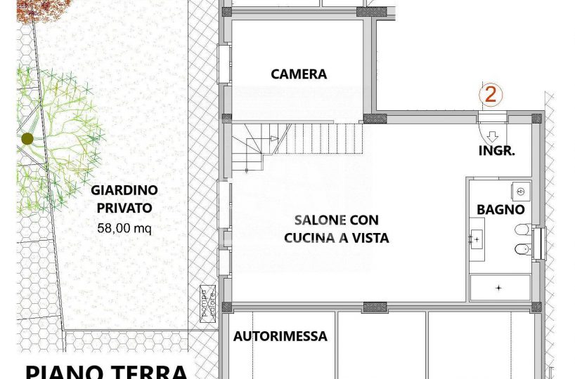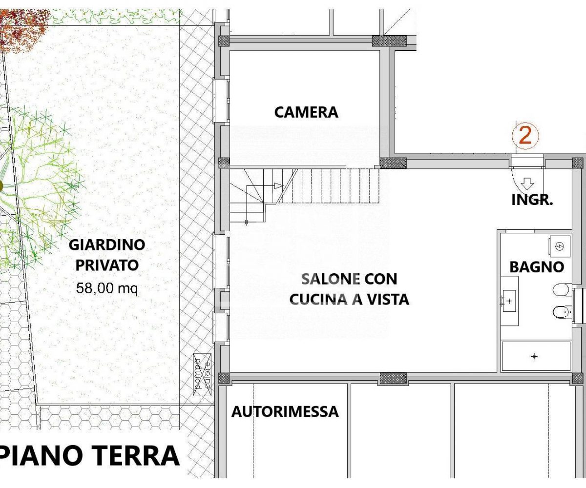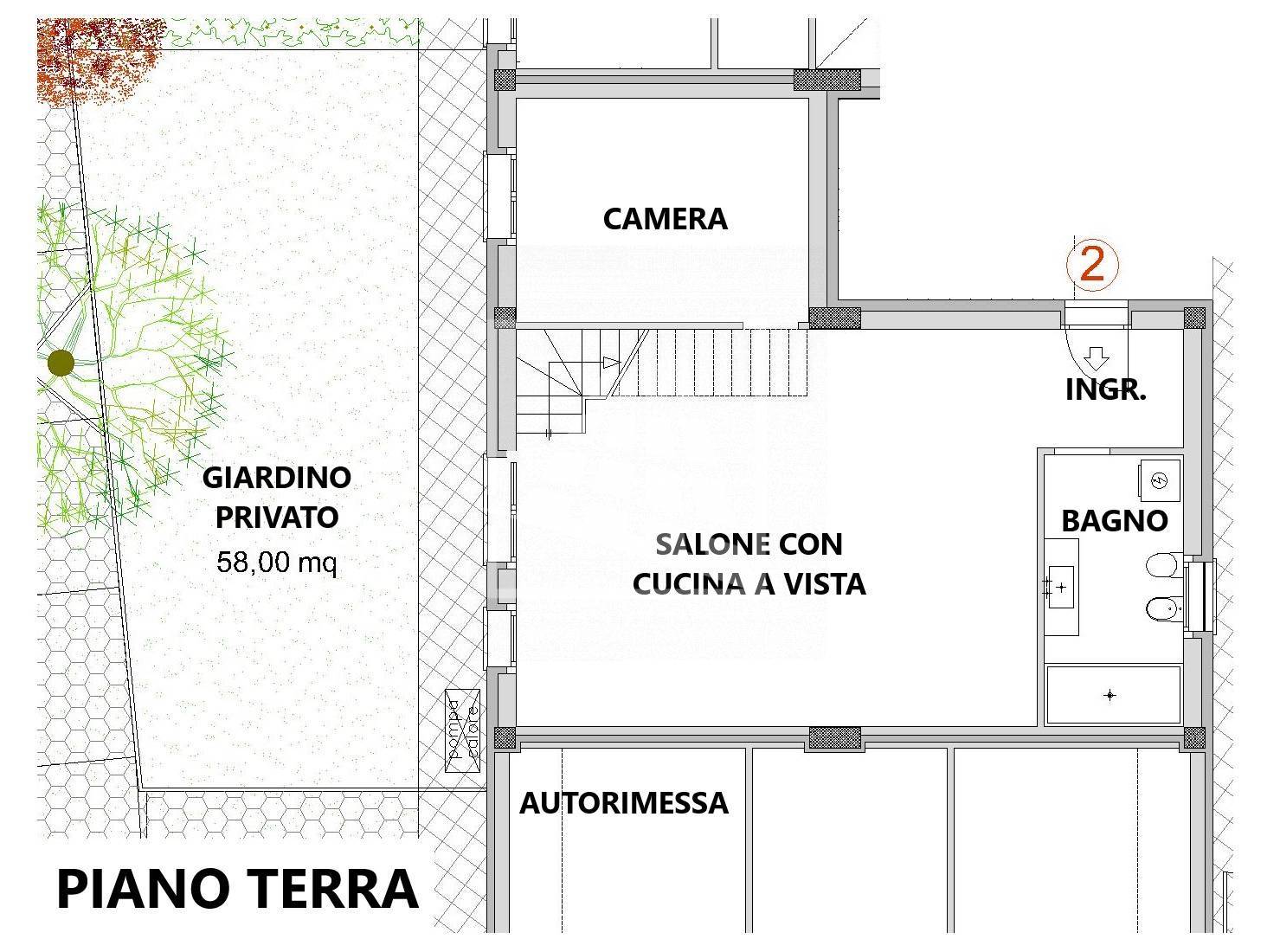 L’unità, disposta su due livelli, è composta al piano terra da un’ampia zona giorno con ingresso, salone con cucina a vista e accesso diretto al giardino, bagno di servizio con finestra e una camera da letto.