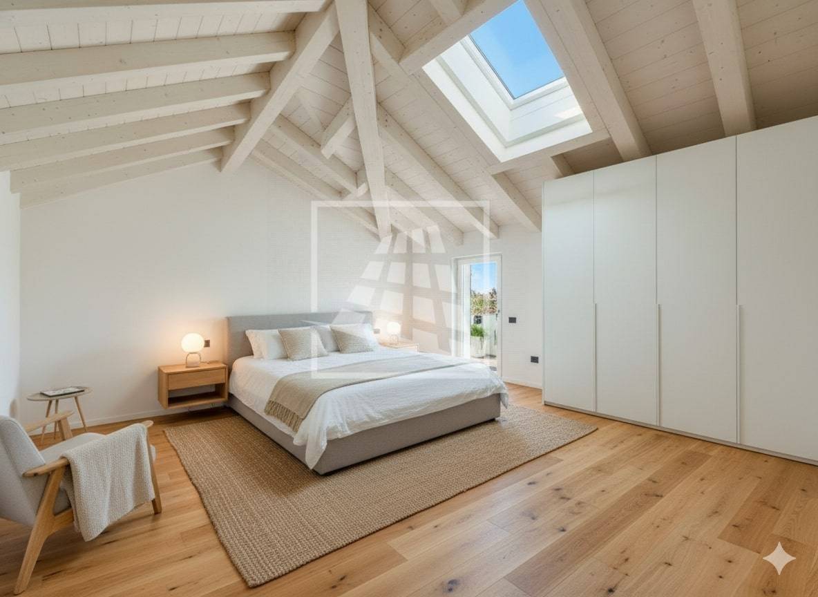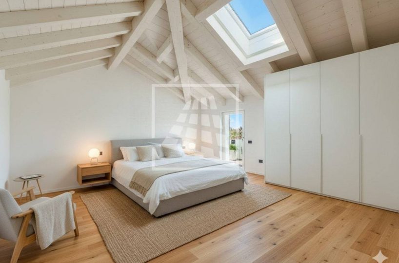 La zona notte è funzionale e ben distribuita, ospitando due camere da letto matrimoniali, ciascuna con cabina armadio, e un bagno finestrato, con la possibilità di ricavare un secondo bagno.