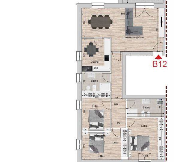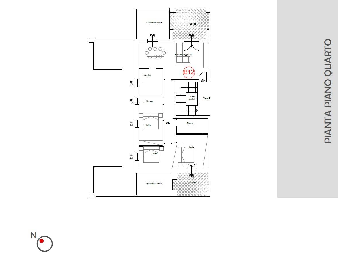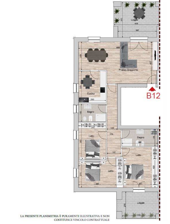 L’immobile è così disposto: Ingresso su soggiorno/sala da pranzo con loggia, cucina abitabile; la zona notte si compone di tre camere da letto, due bagni di cui uno cieco e seconda loggia.