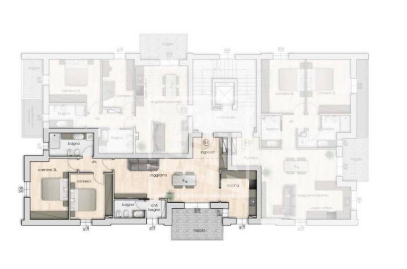 Appartamento di nuova costruzione, con oltre 100 mq di superficie, situato al primo piano ed inserito in un elegante edificio di due piani servito da ascensore condominiale.