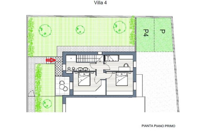 Al piano primo si trova la zona notte, composta da una camera padronale completa di balcone privato, una seconda camera matrimoniale, una stanza singola ideale anche come studio e un ulteriore bagno finestrato.