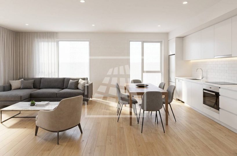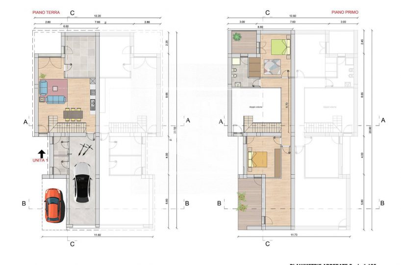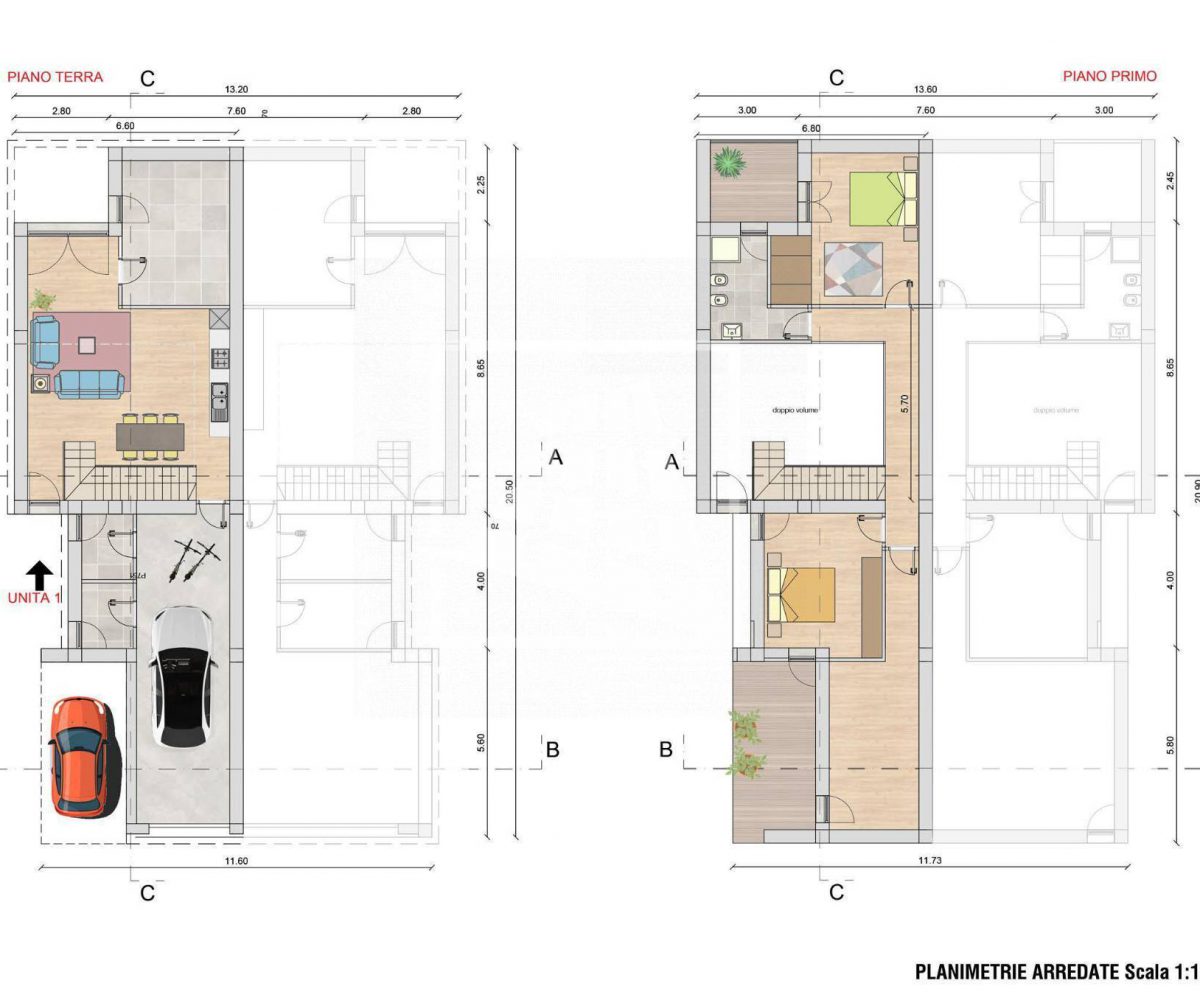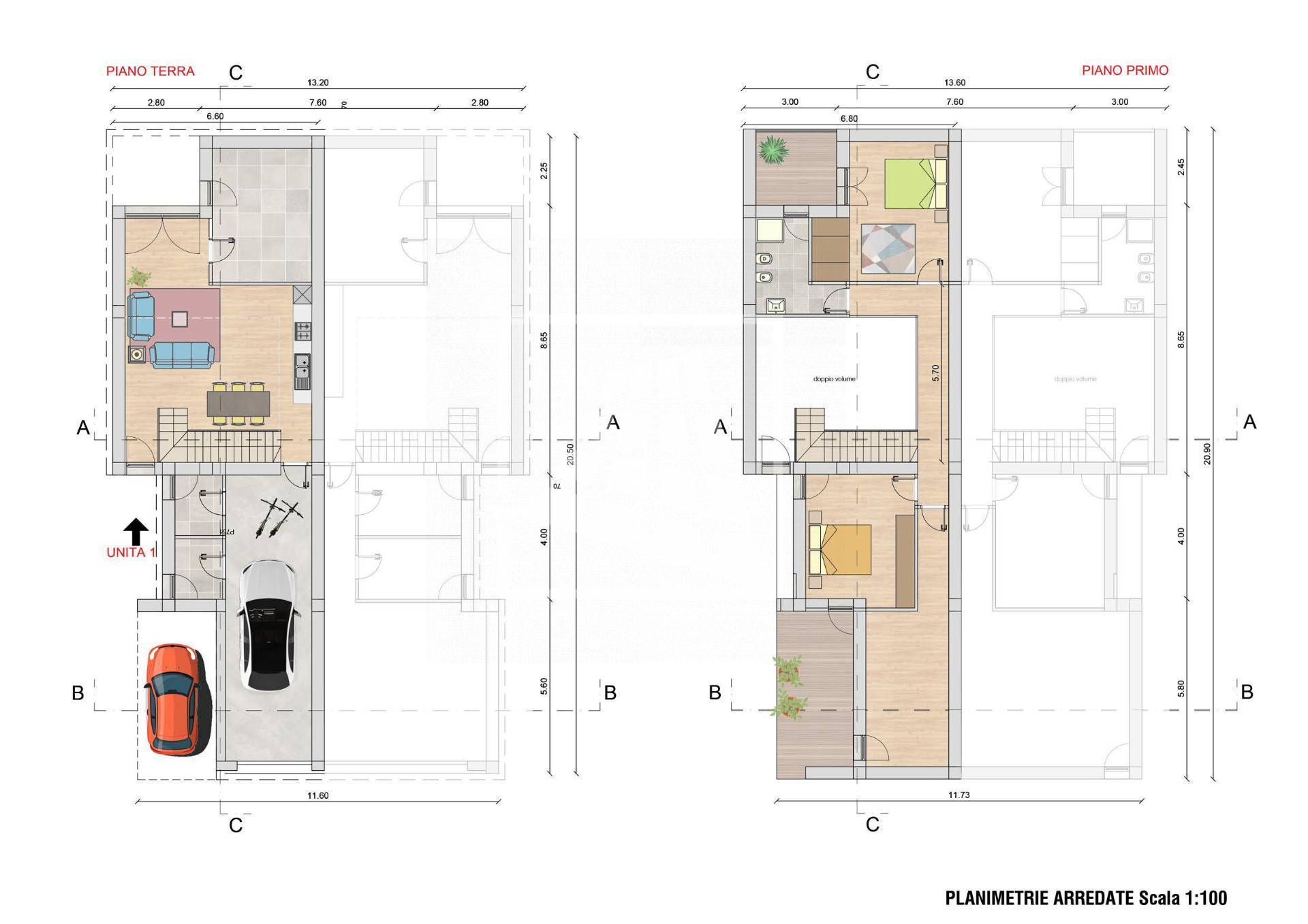 Il progetto architettonico si distingue per l’eleganza degli spazi interni: al piano terra, la zona giorno è dominata da un ampio soggiorno con angolo cottura caratterizzato da un suggestivo doppio volume, che dona luminosità e respiro all’intero ambiente.