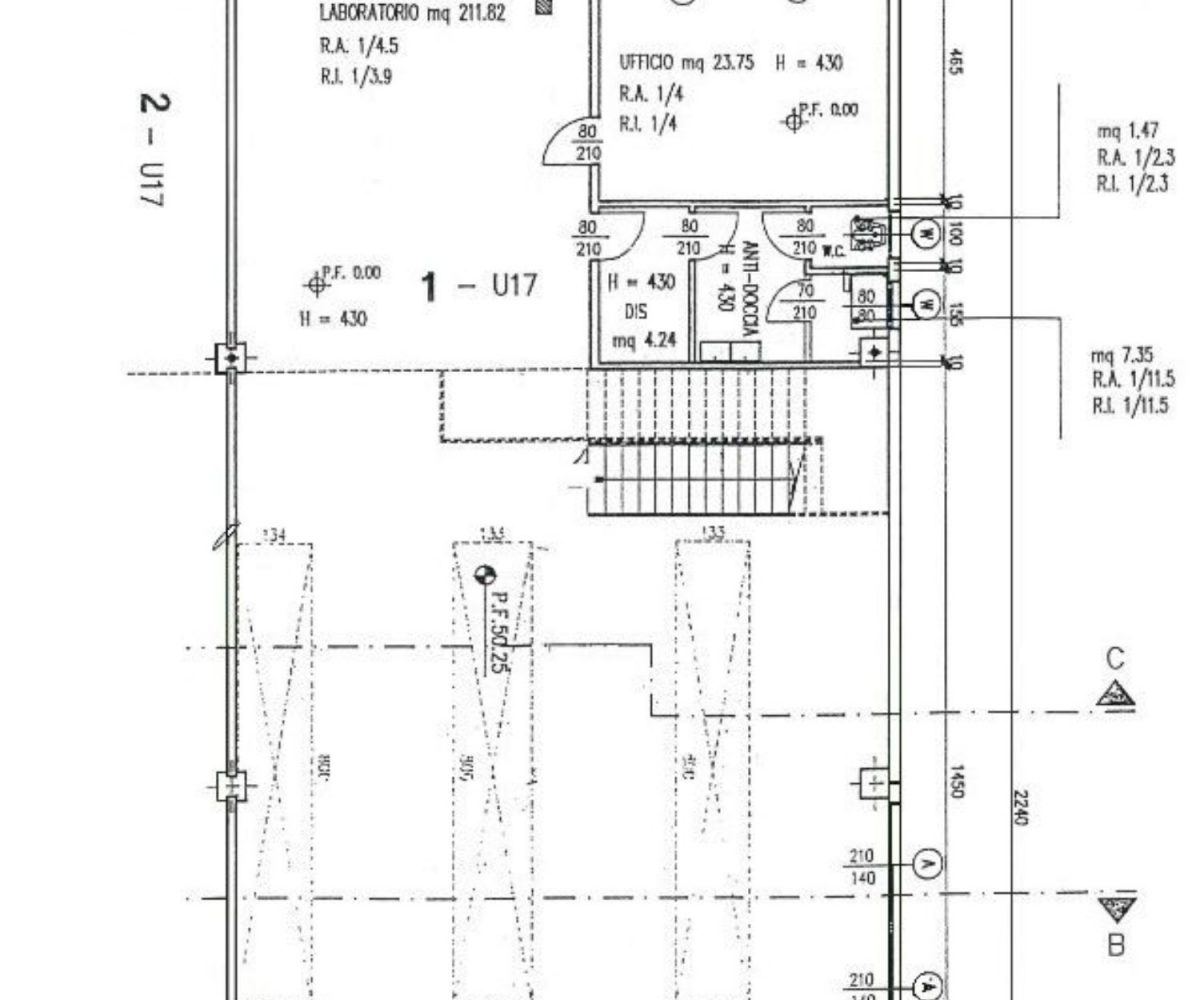 - zona uffici di mq 126 dislocati su due livelli collegati tramite scala, con spogliatoi, doppi servizi e doccia. Riscaldamento e raffrescamento con ventilconvettori, corpi illuminanti e rete dati.