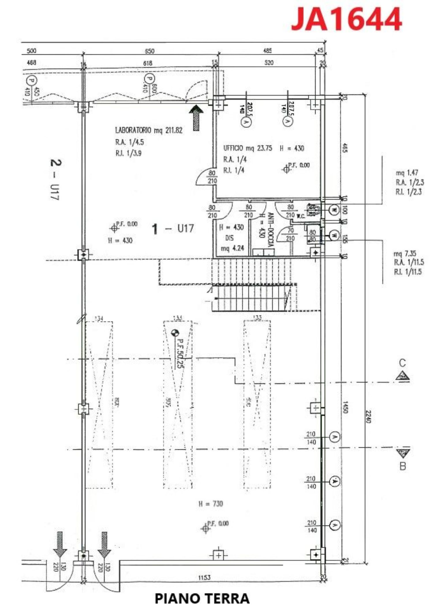 - zona produzione/magazzino di mq 224 per altezza m 6,50 con un portone carraio e una porta pedonale contrapposta, prese 220 e 380, riscaldamento e corpi illuminanti.
