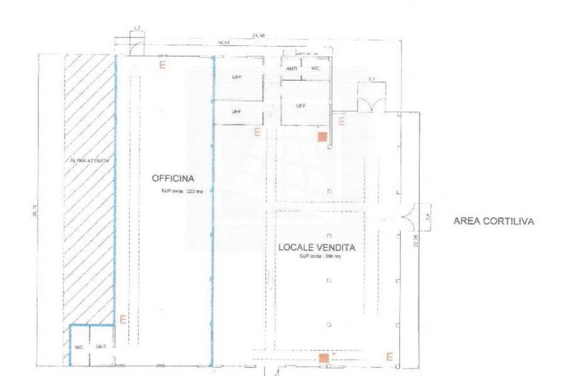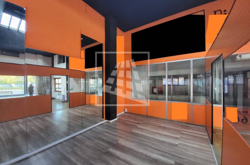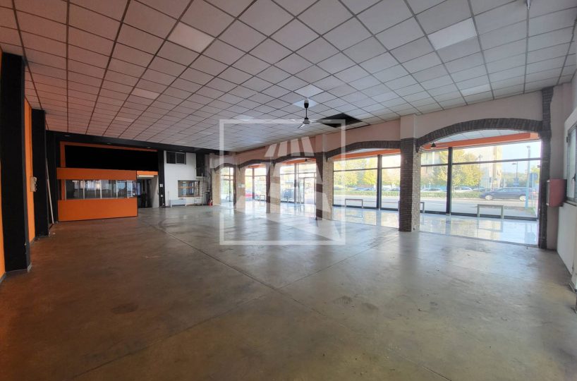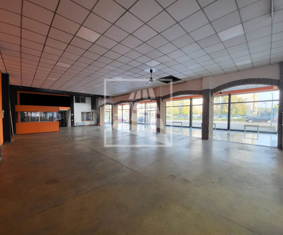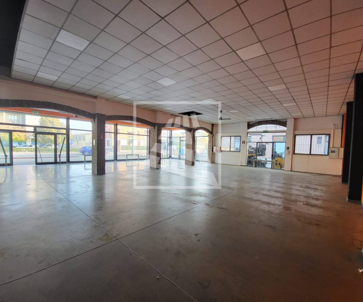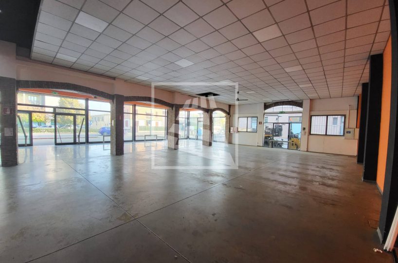 mq 398 hanno destinazione d’uso vendita, con un importante open space munito di sette grandi vetrine, per una massima visibilità , e uffici divisi in vani da pannelli.