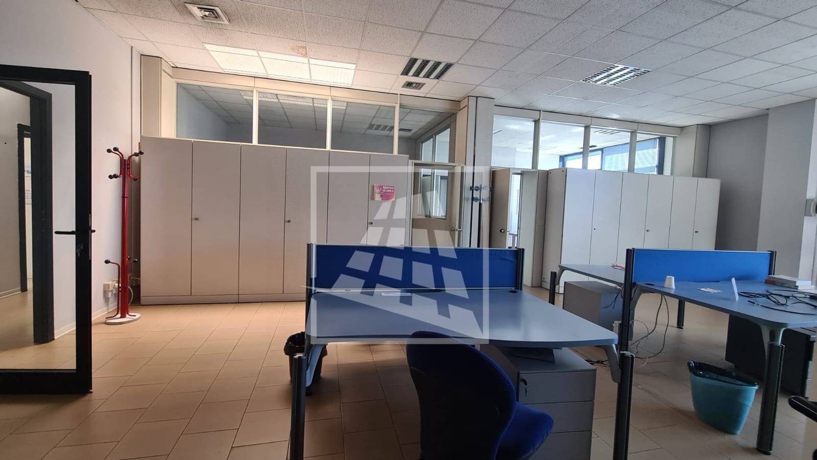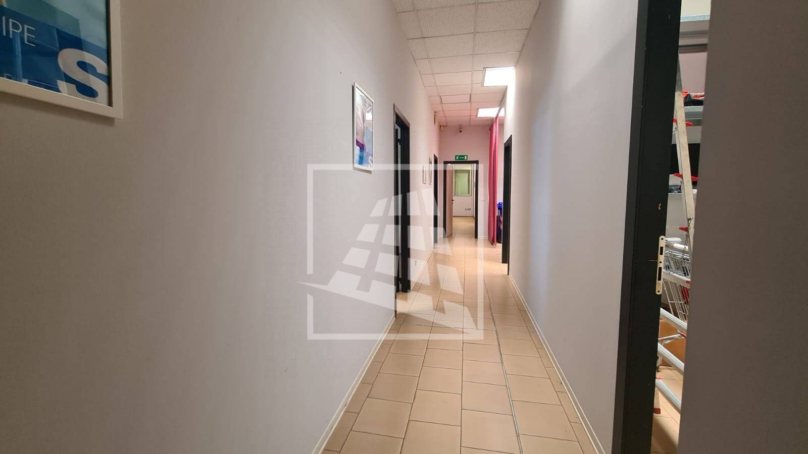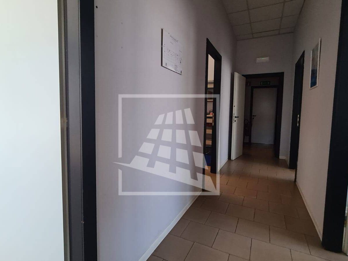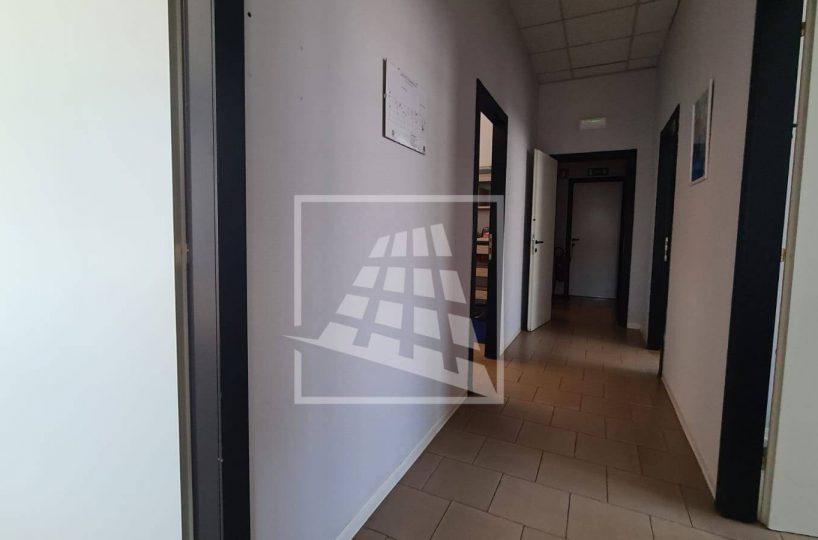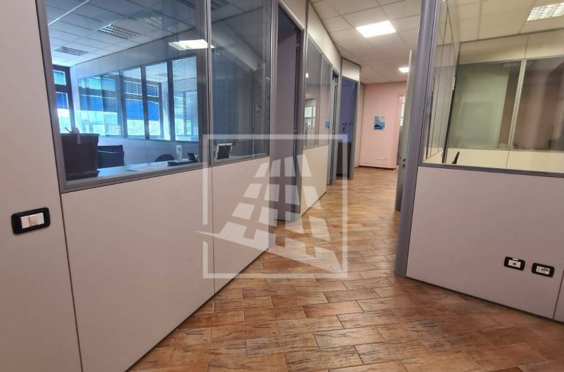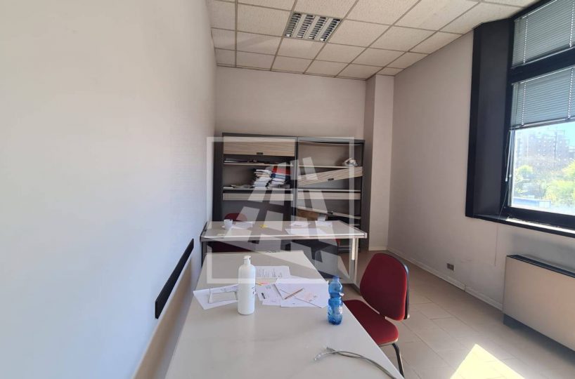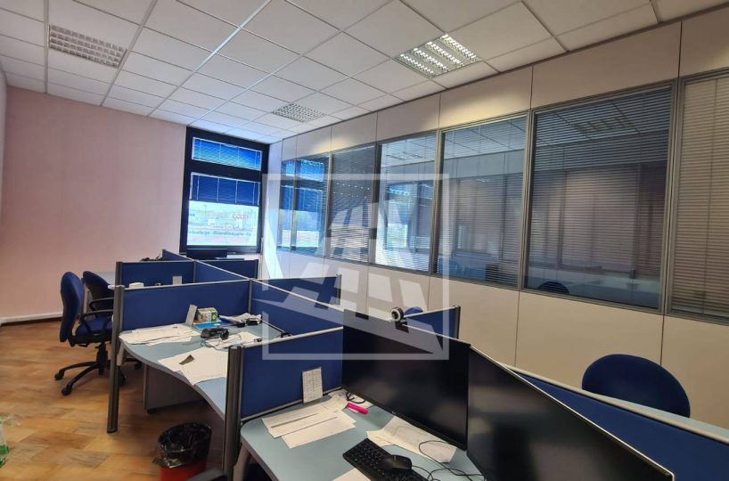 Lo spazio è già diviso in numerosi vani da pareti attrezzate e pannelli, vi è un’ampia sala riunioni, una sala ristoro, sala server, archivi e cinque servizi con antibagno.