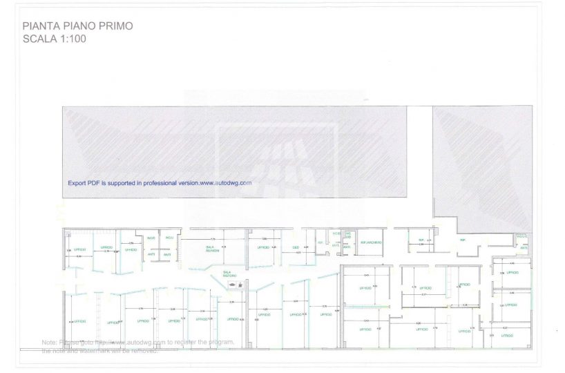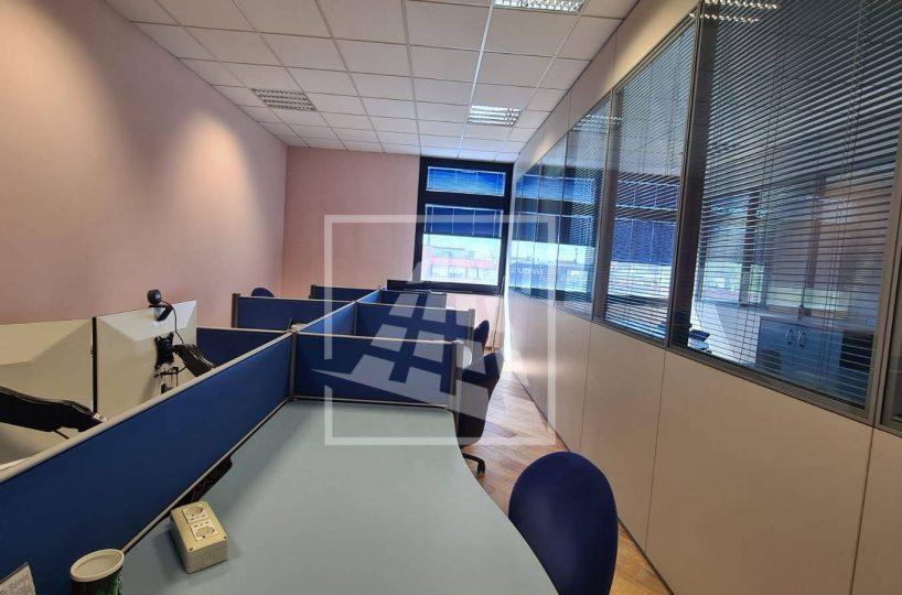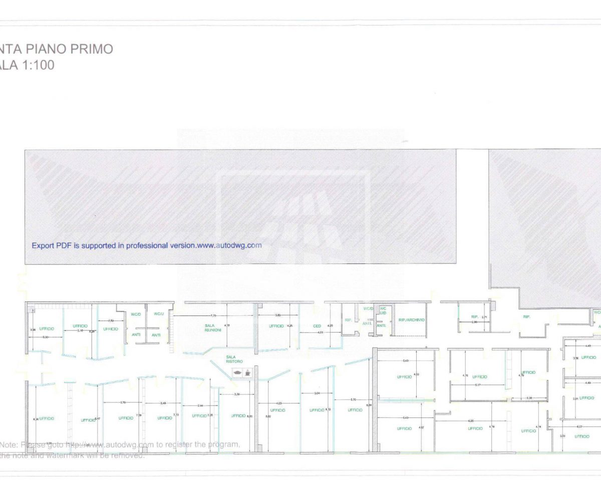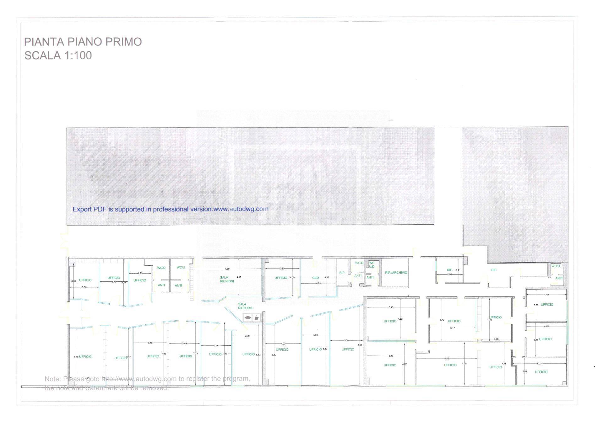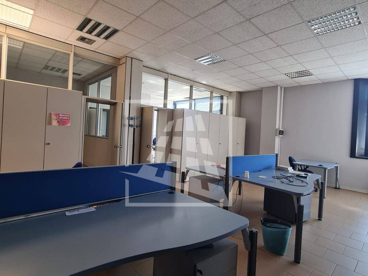 Lo spazio è già diviso in numerosi vani da pareti attrezzate e pannelli, vi è un’ampia sala riunioni, una sala ristoro, sala server, archivi e cinque servizi con antibagno.