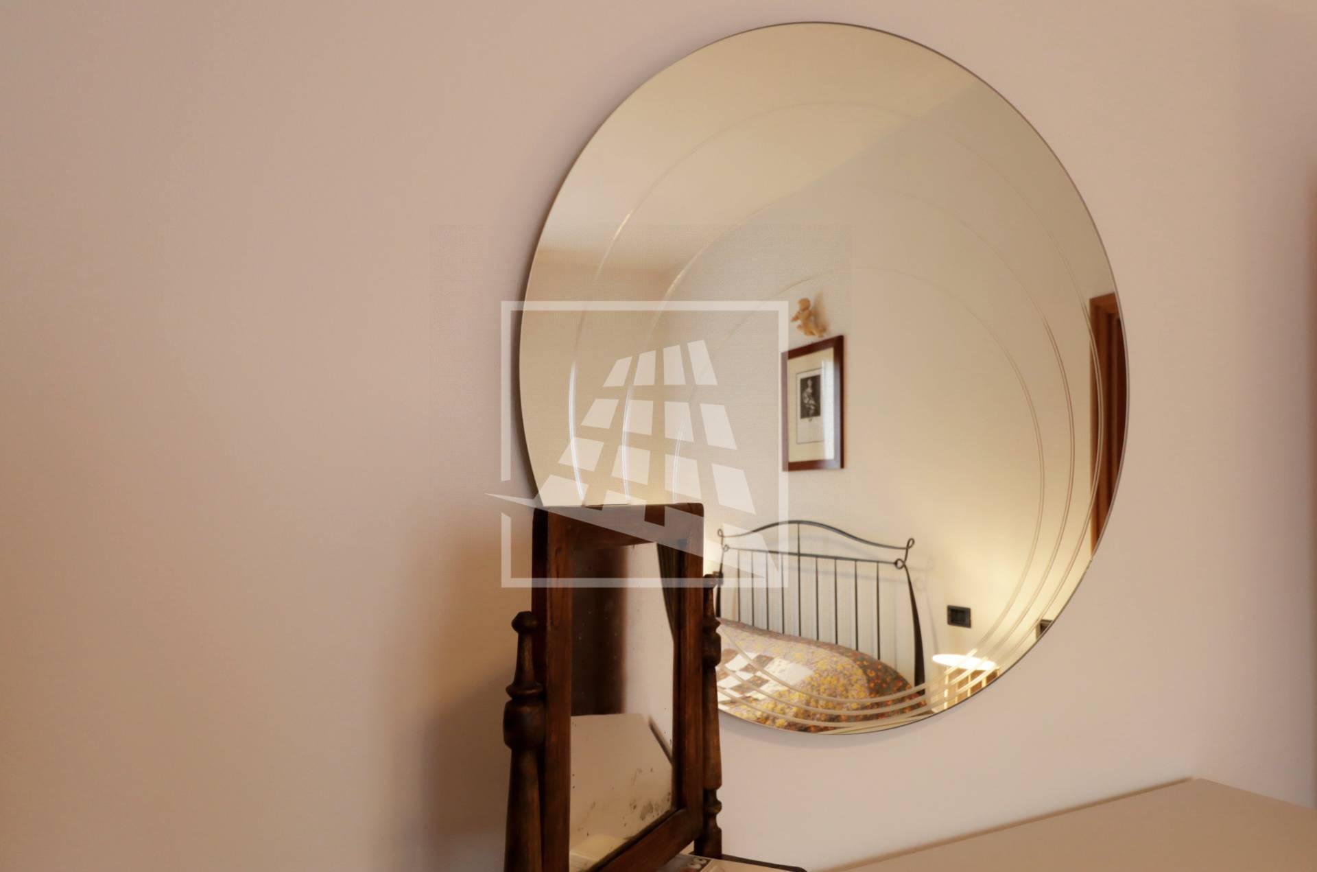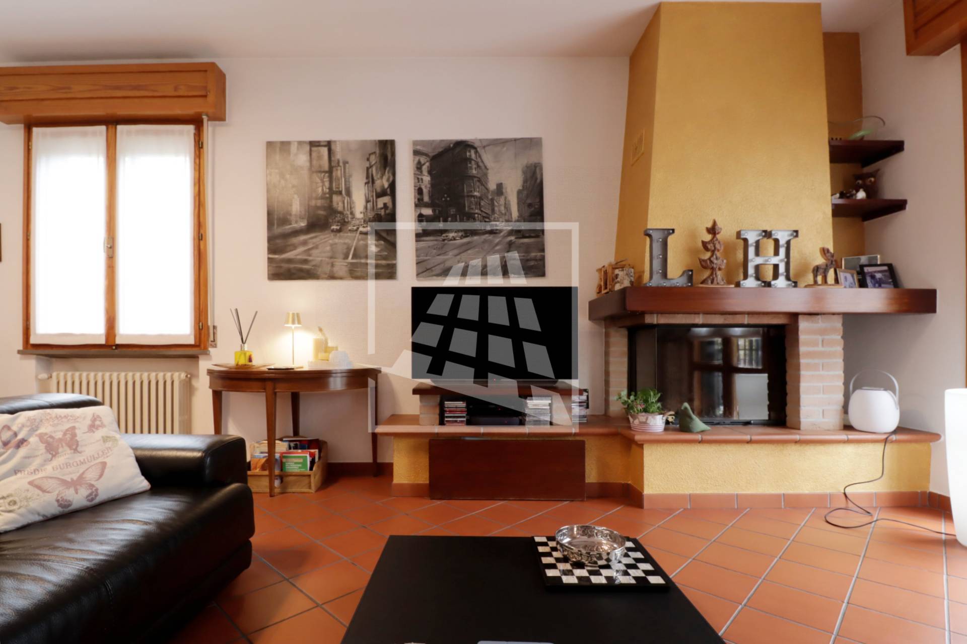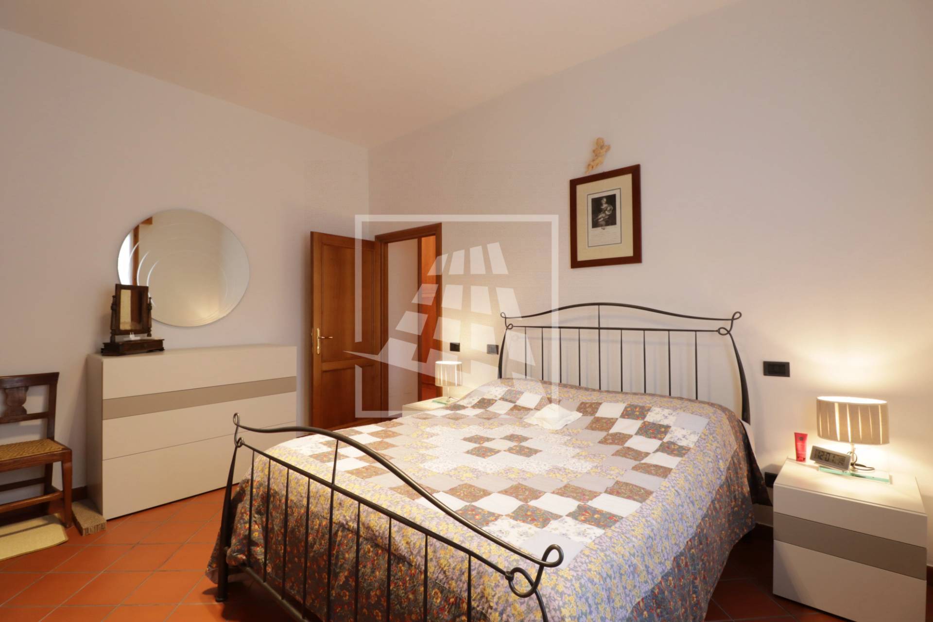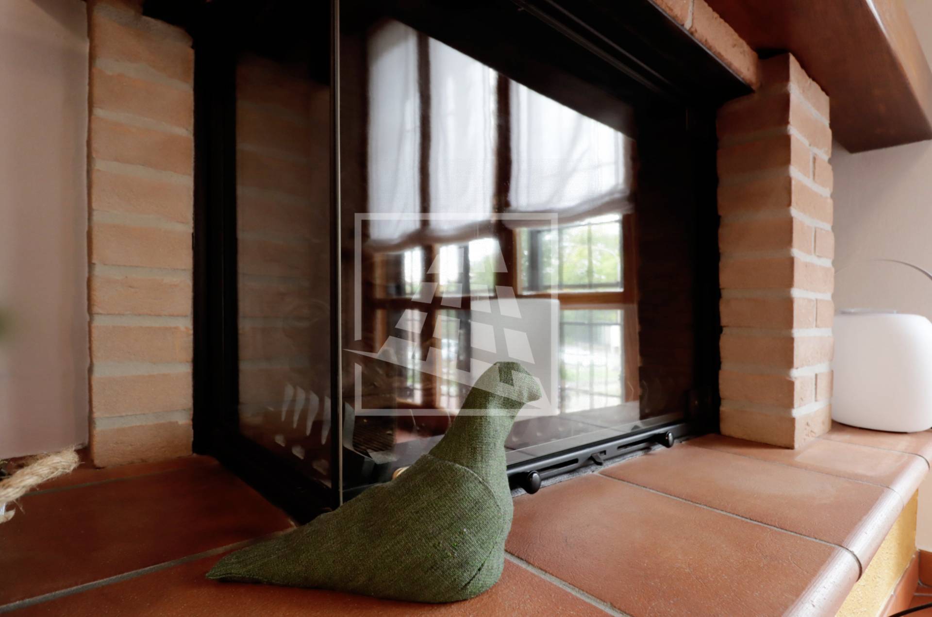 Al piano superiore si sviluppa l’abitazione principale, caratterizzata da ambienti spaziosi e ben distribuiti: l’ingresso conduce a un ampio soggiorno con camino, una spaziosa cucina abitabile, due camere da letto, uno studio, un bagno dalle generose dimensioni e una pratica lavanderia.