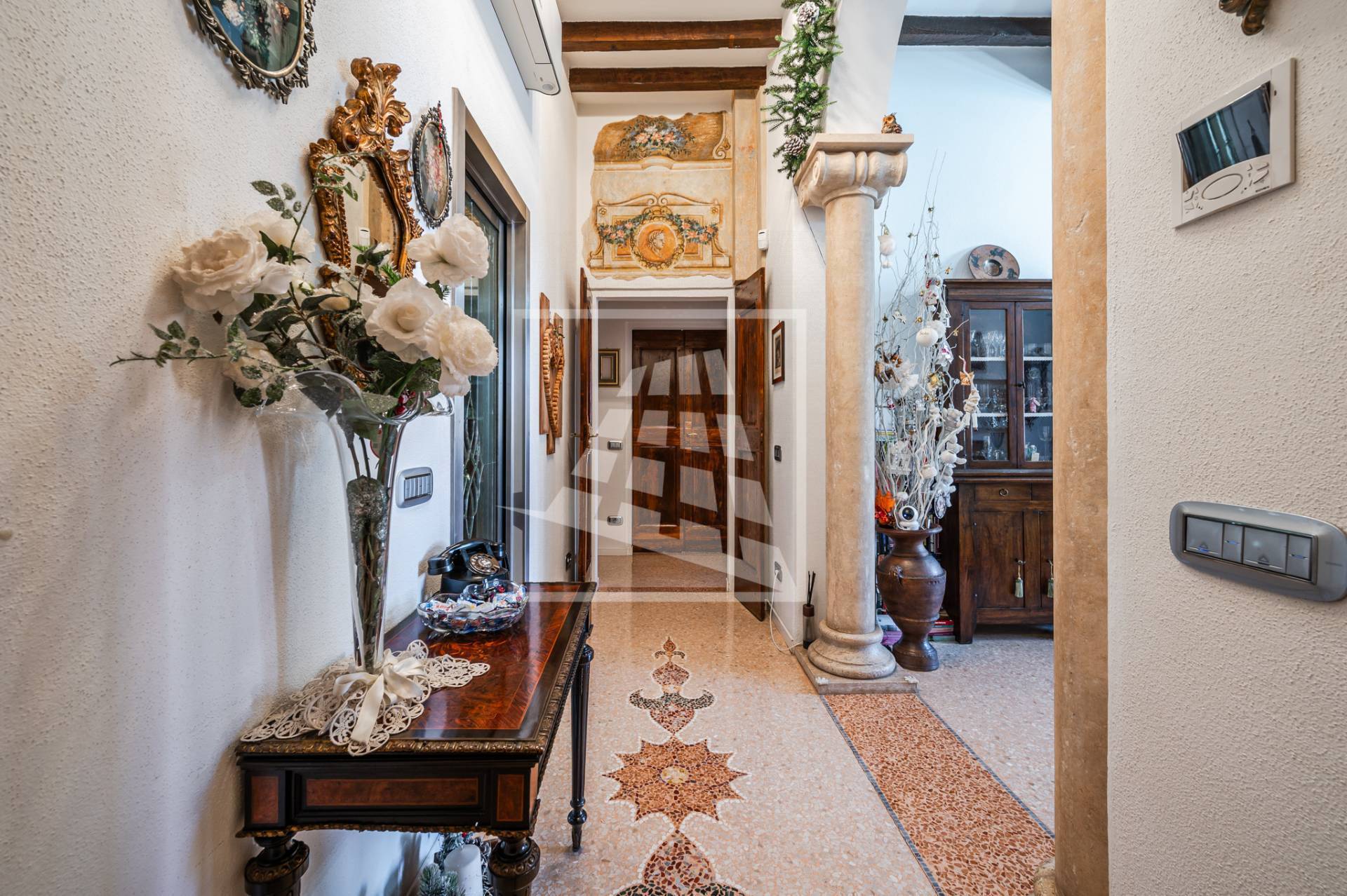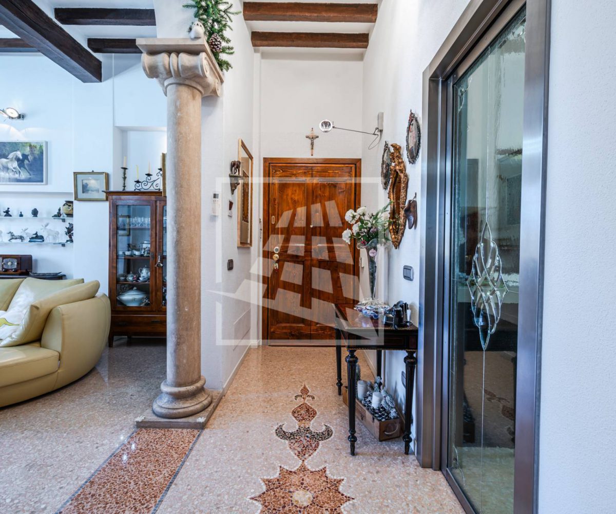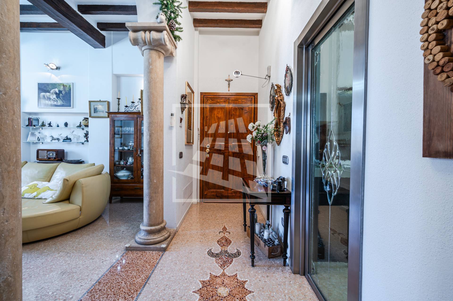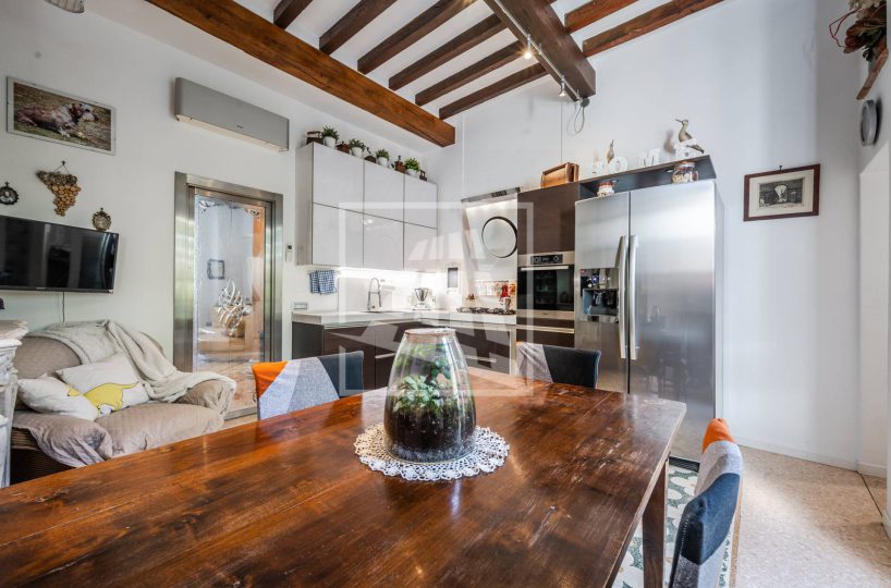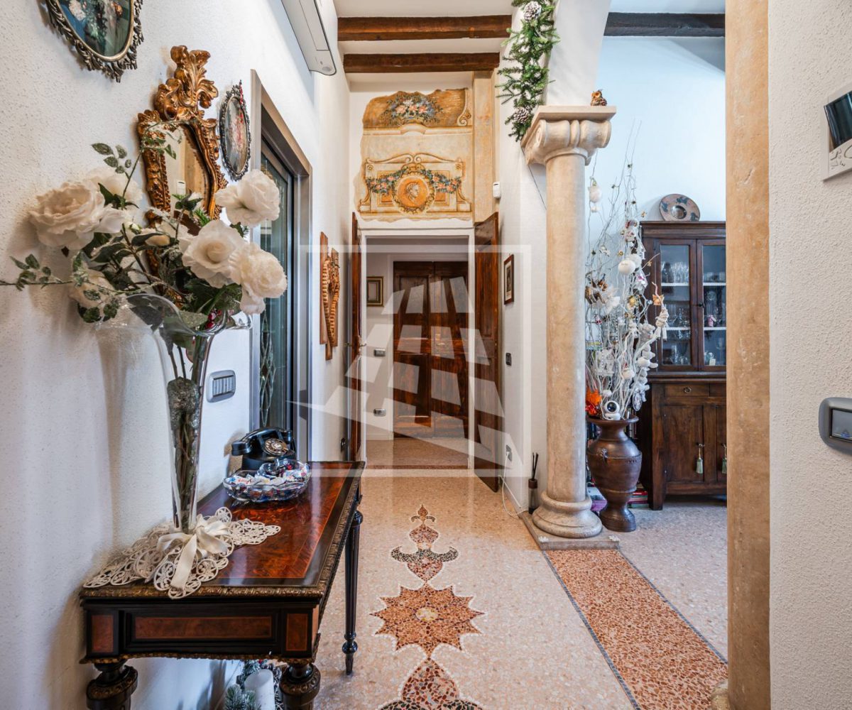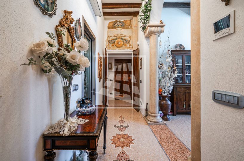 Internamente è composto da ingresso con arco e colonne in pietra originali, ampio soggiorno caratterizzato da travi in legno a vista, soffitti alti 3.20 m e dettagli preziosi come il pavimento storico in mosaico seminato veneziano, elementi che donano forte personalità agli ambienti; la cucina è invece moderna, dal design lineare e funzionale, ma arricchita da un camino in pietra e pavimenti originali, esternamente si trova poi un terrazzo angolare riservato e ombreggiato da tende solari bioclimatiche con chiusura elettrica, uno spazio ideale per momenti di relax all’aperto.