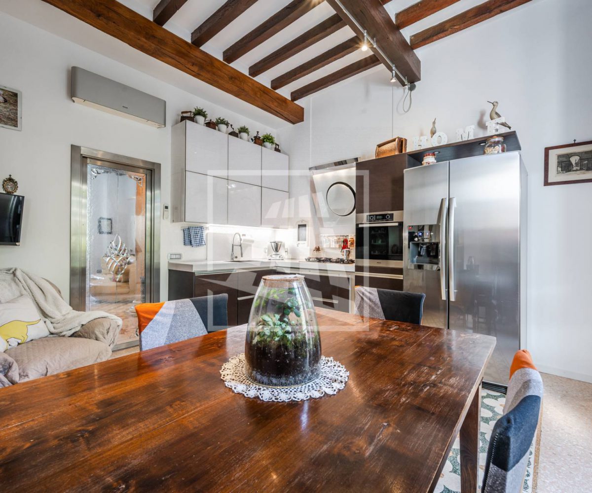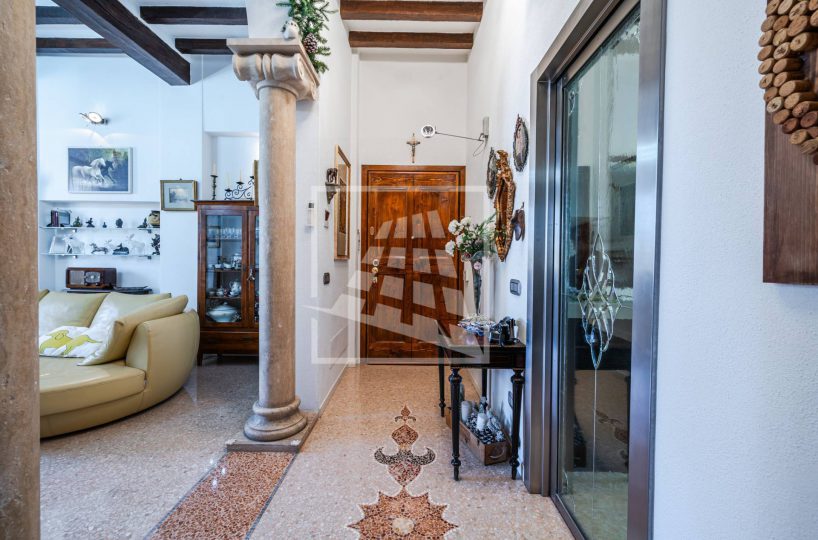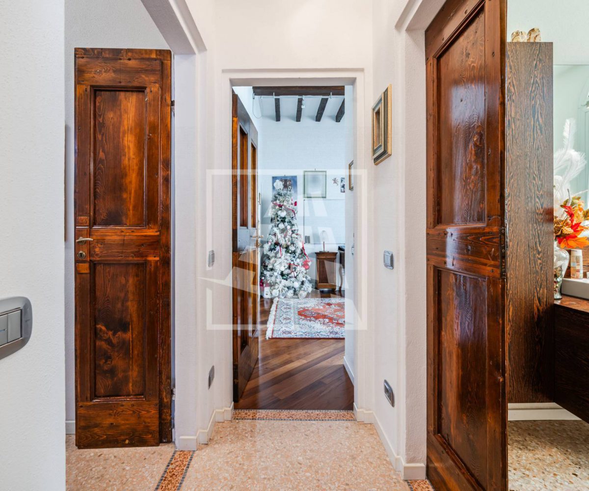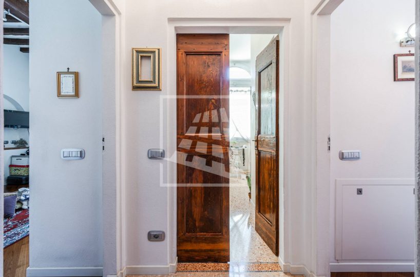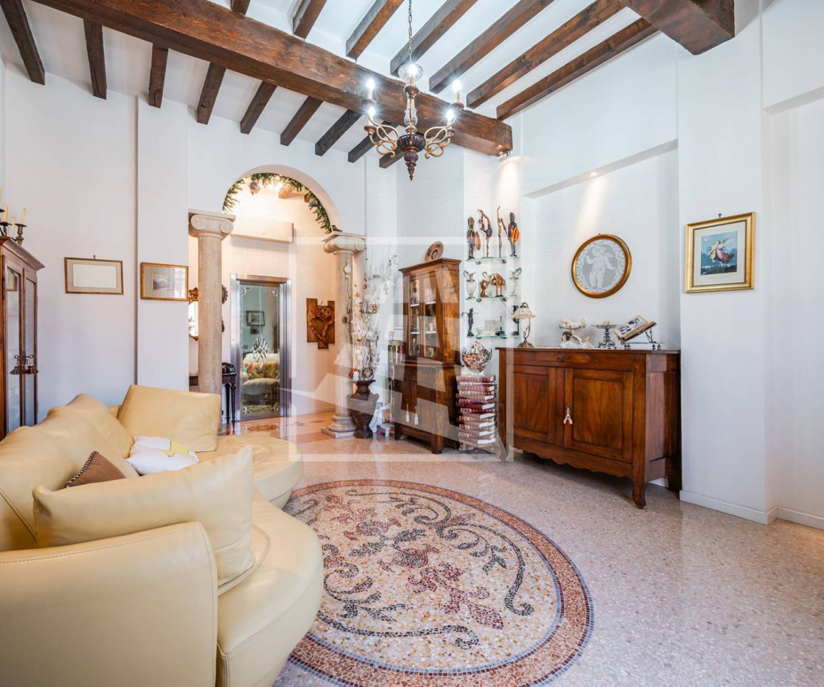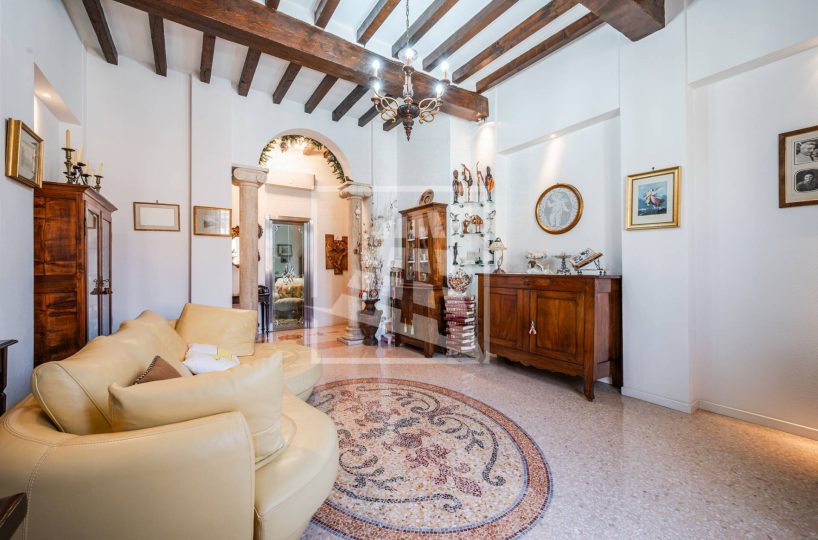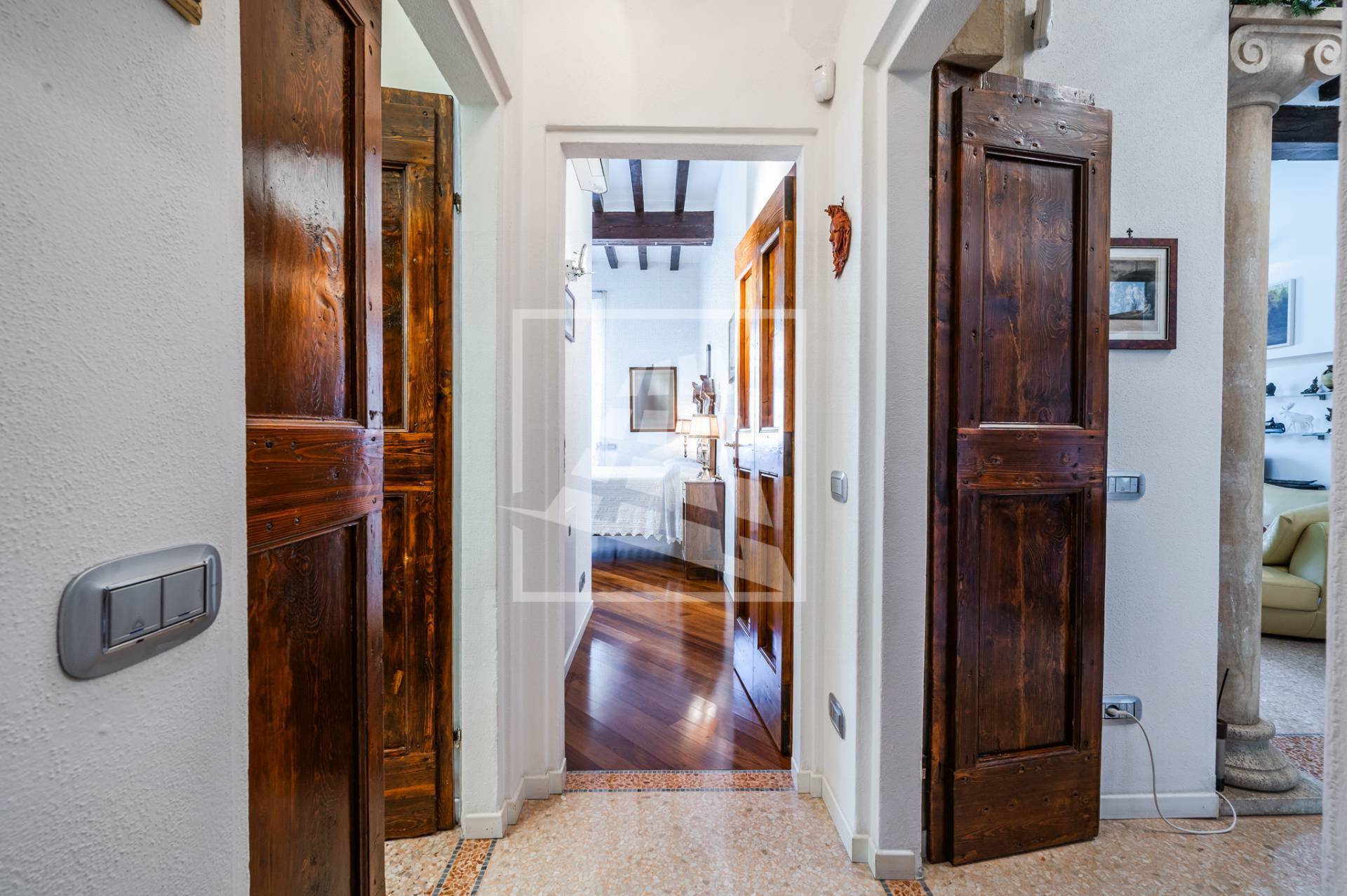 Internamente è composto da ingresso con arco e colonne in pietra originali, ampio soggiorno caratterizzato da travi in legno a vista, soffitti alti 3.20 m e dettagli preziosi come il pavimento storico in mosaico seminato veneziano, elementi che donano forte personalità agli ambienti; la cucina è invece moderna, dal design lineare e funzionale, ma arricchita da un camino in pietra e pavimenti originali, esternamente si trova poi un terrazzo angolare riservato e ombreggiato da tende solari bioclimatiche con chiusura elettrica, uno spazio ideale per momenti di relax all’aperto.