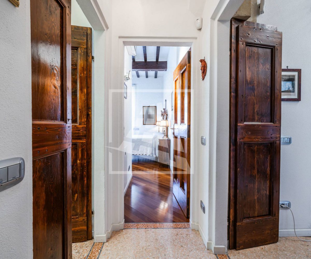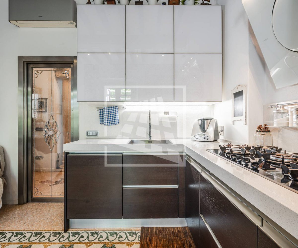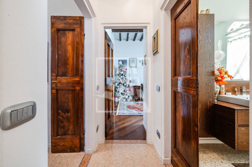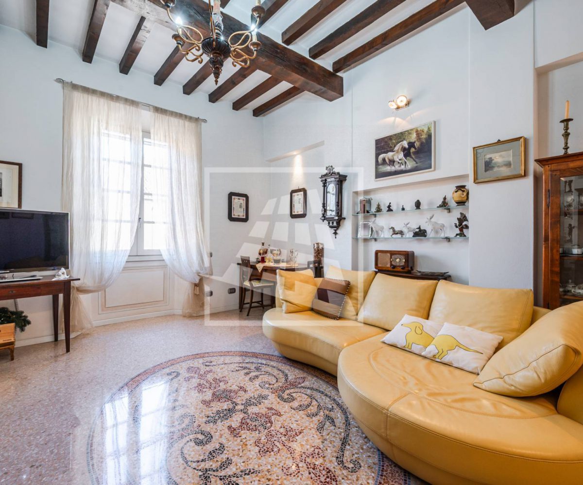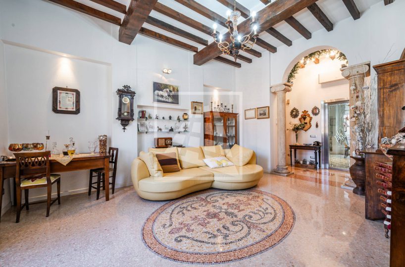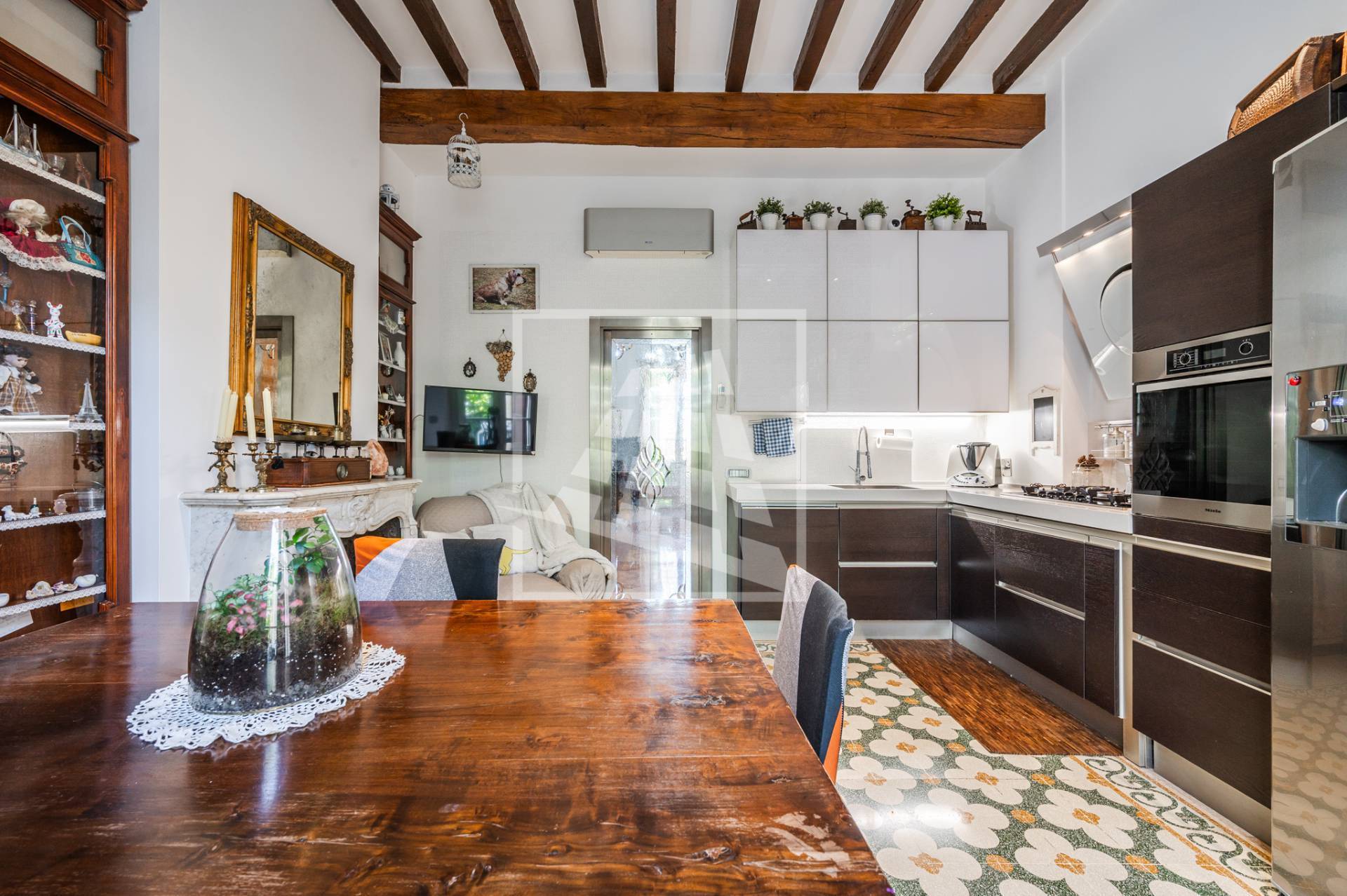 Internamente è composto da ingresso con arco e colonne in pietra originali, ampio soggiorno caratterizzato da travi in legno a vista, soffitti alti 3.20 m e dettagli preziosi come il pavimento storico in mosaico seminato veneziano, elementi che donano forte personalità agli ambienti; la cucina è invece moderna, dal design lineare e funzionale, ma arricchita da un camino in pietra e pavimenti originali, esternamente si trova poi un terrazzo angolare riservato e ombreggiato da tende solari bioclimatiche con chiusura elettrica, uno spazio ideale per momenti di relax all’aperto.
