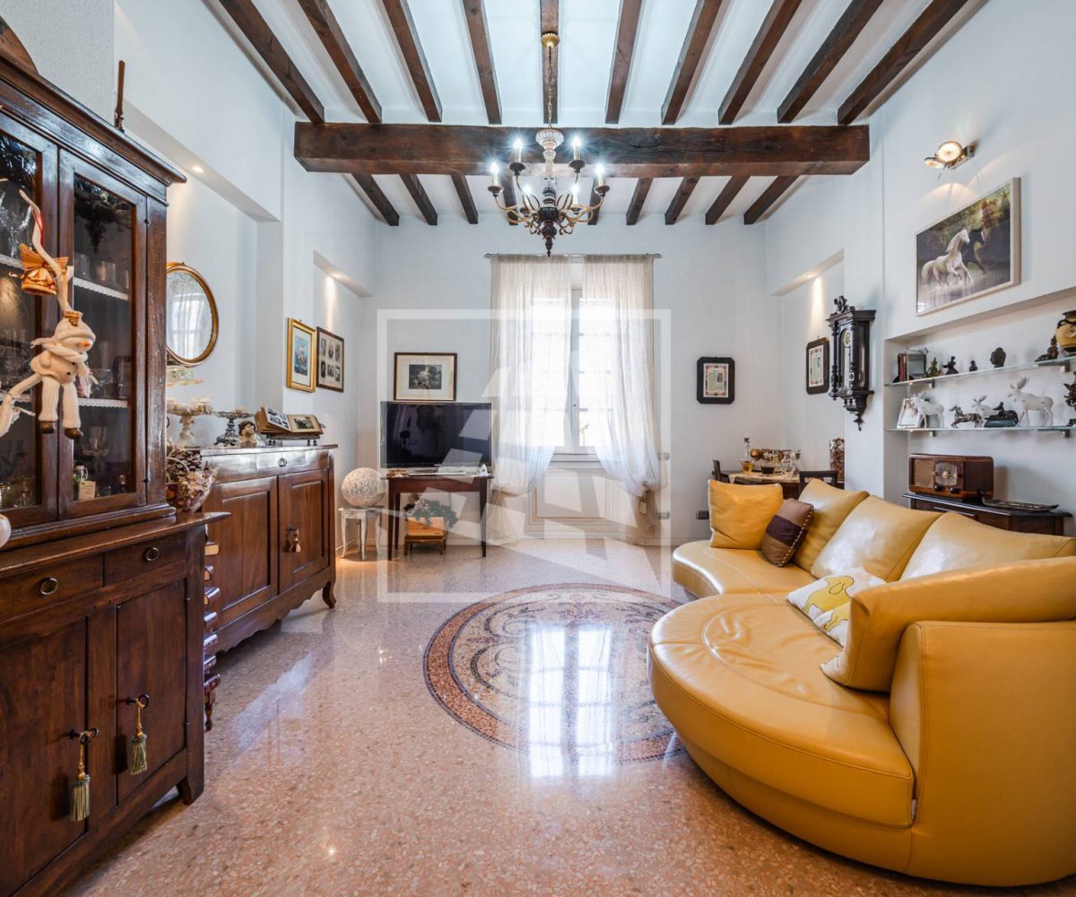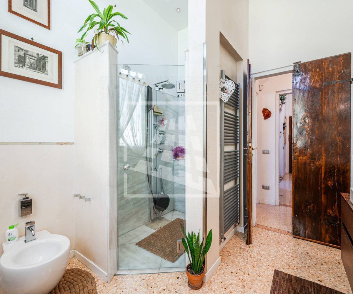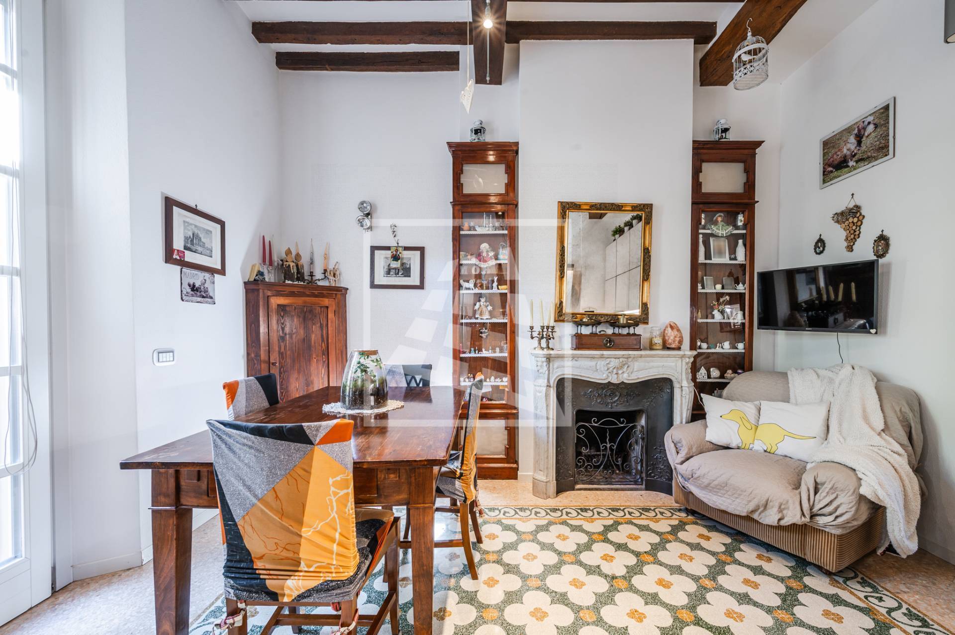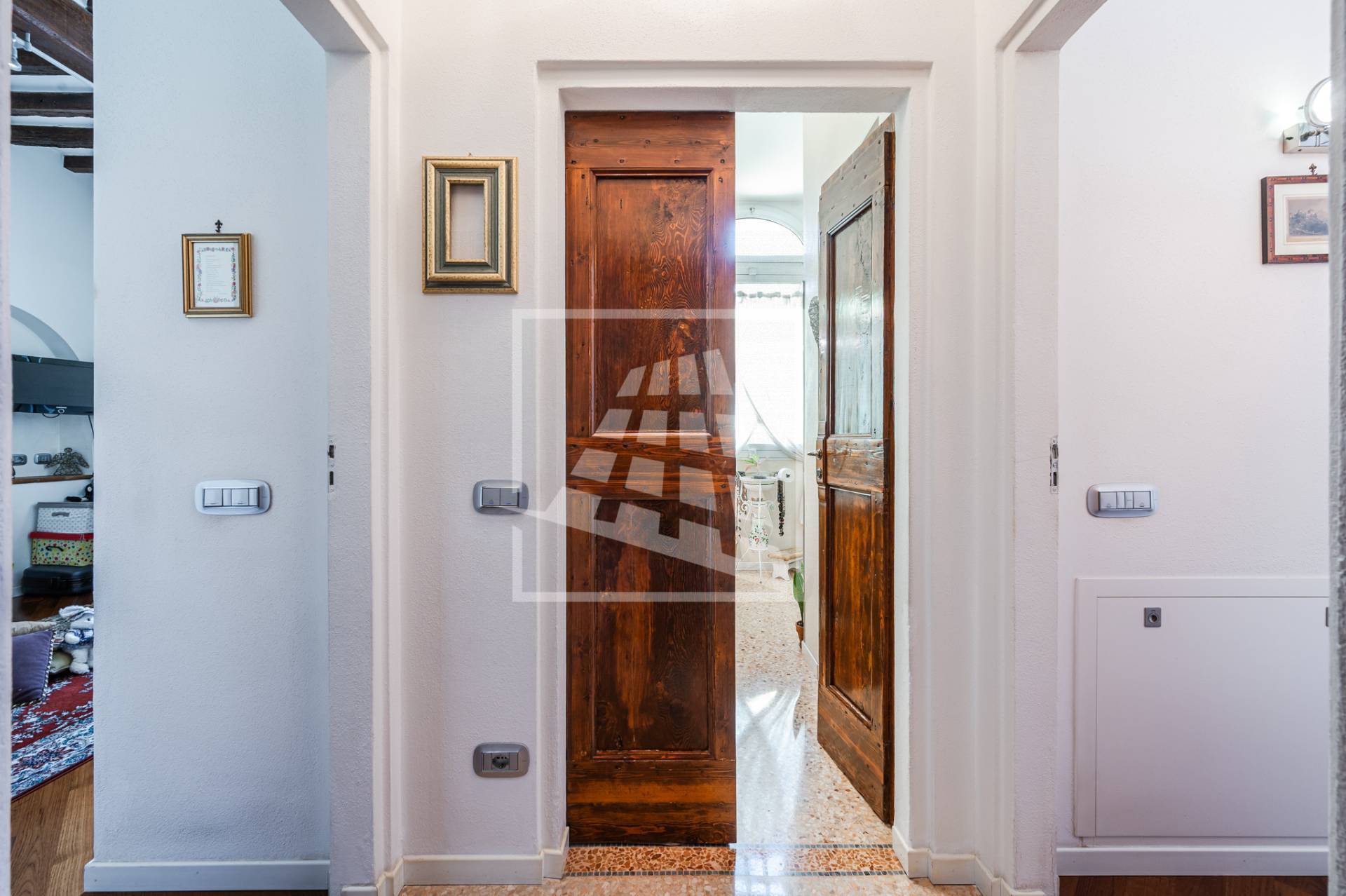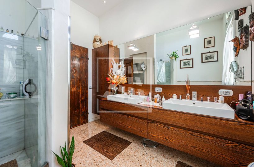 Internamente è composto da ingresso con arco e colonne in pietra originali, ampio soggiorno caratterizzato da travi in legno a vista, soffitti alti 3.20 m e dettagli preziosi come il pavimento storico in mosaico seminato veneziano, elementi che donano forte personalità agli ambienti; la cucina è invece moderna, dal design lineare e funzionale, ma arricchita da un camino in pietra e pavimenti originali, esternamente si trova poi un terrazzo angolare riservato e ombreggiato da tende solari bioclimatiche con chiusura elettrica, uno spazio ideale per momenti di relax all’aperto.