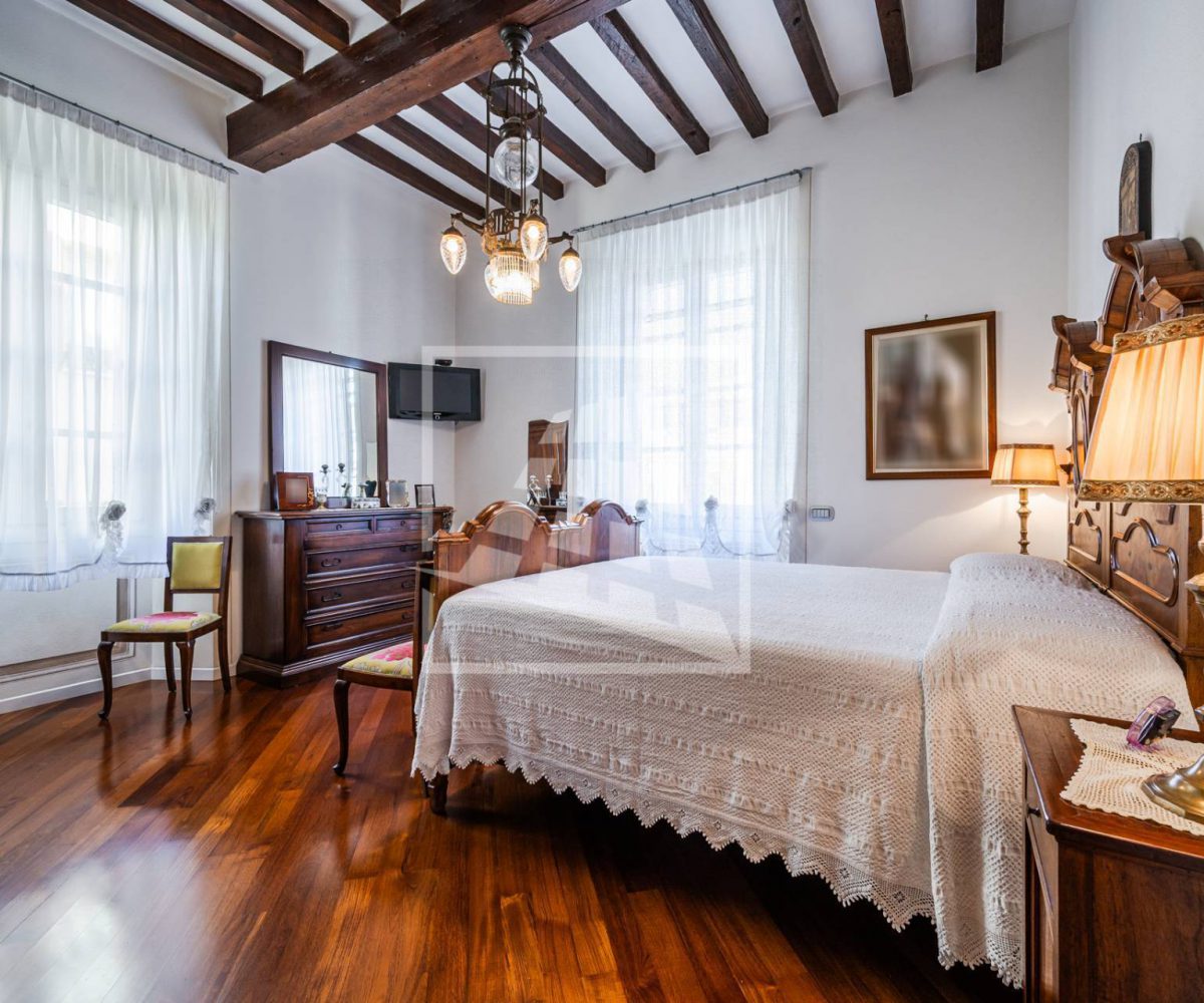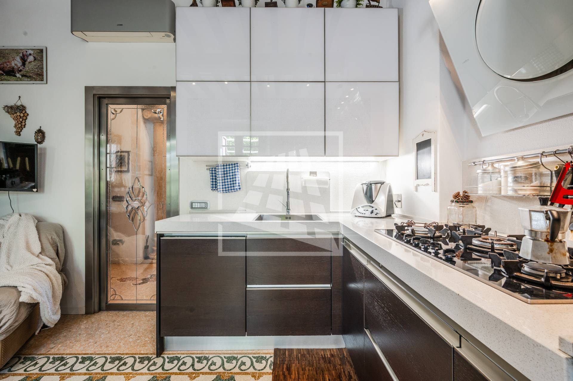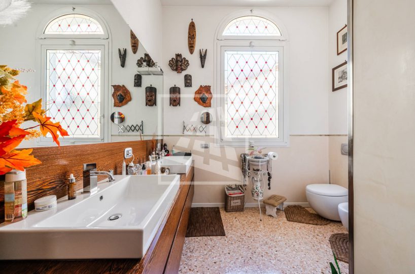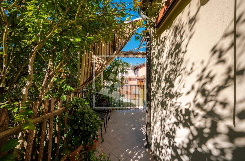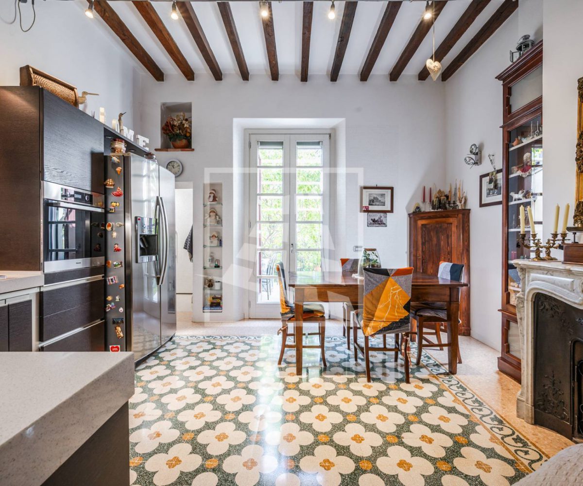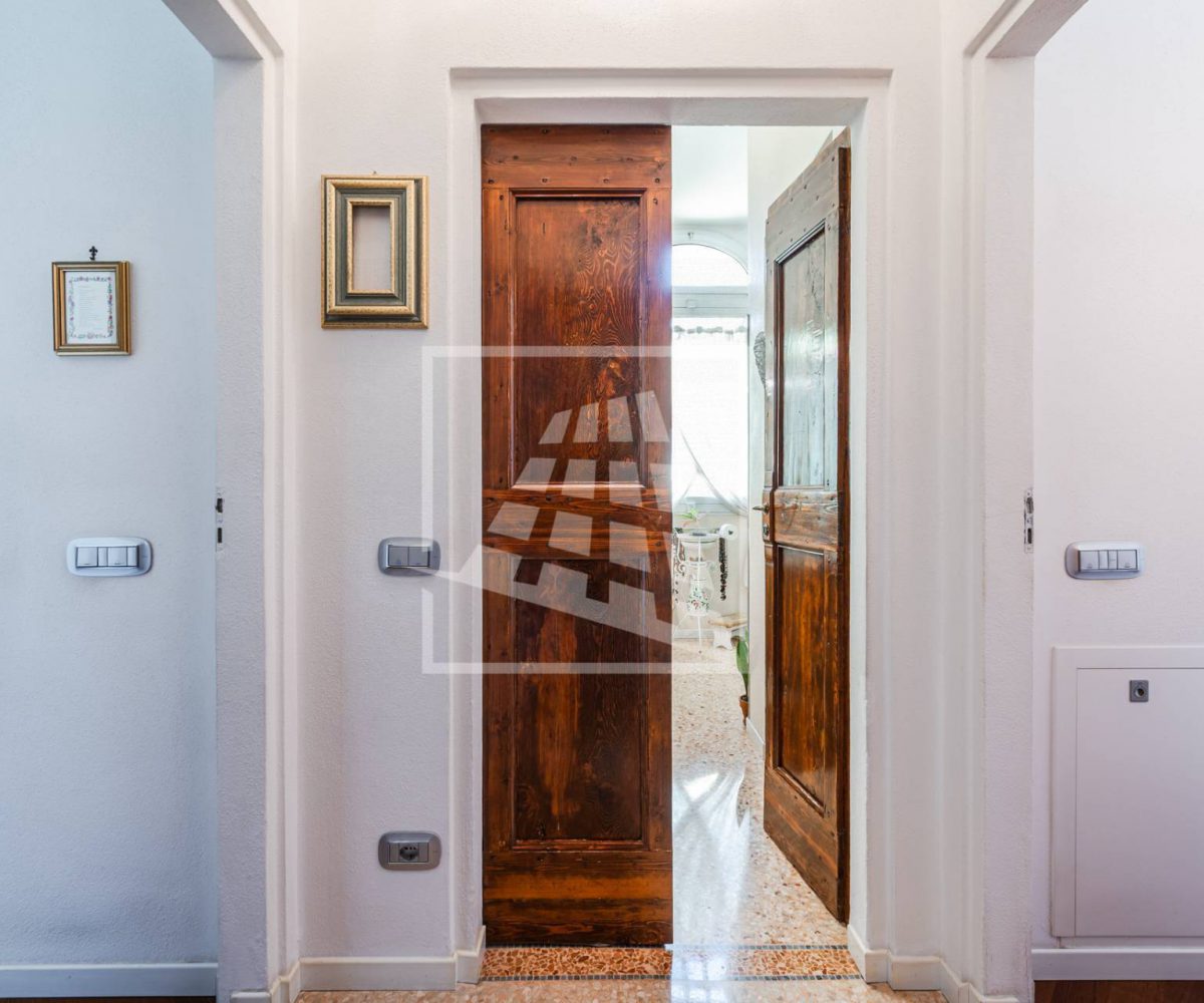 Internamente è composto da ingresso con arco e colonne in pietra originali, ampio soggiorno caratterizzato da travi in legno a vista, soffitti alti 3.20 m e dettagli preziosi come il pavimento storico in mosaico seminato veneziano, elementi che donano forte personalità agli ambienti; la cucina è invece moderna, dal design lineare e funzionale, ma arricchita da un camino in pietra e pavimenti originali, esternamente si trova poi un terrazzo angolare riservato e ombreggiato da tende solari bioclimatiche con chiusura elettrica, uno spazio ideale per momenti di relax all’aperto.