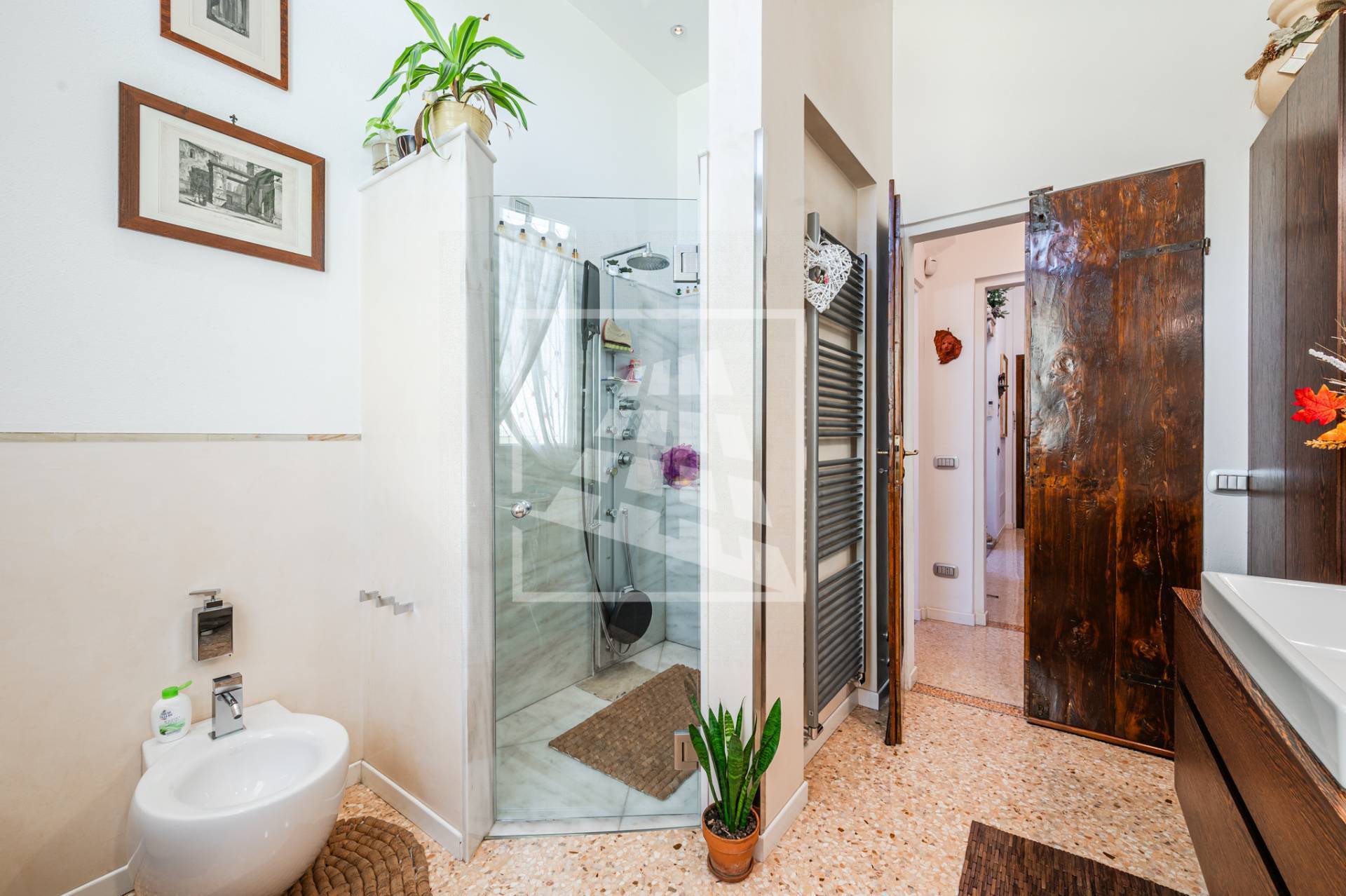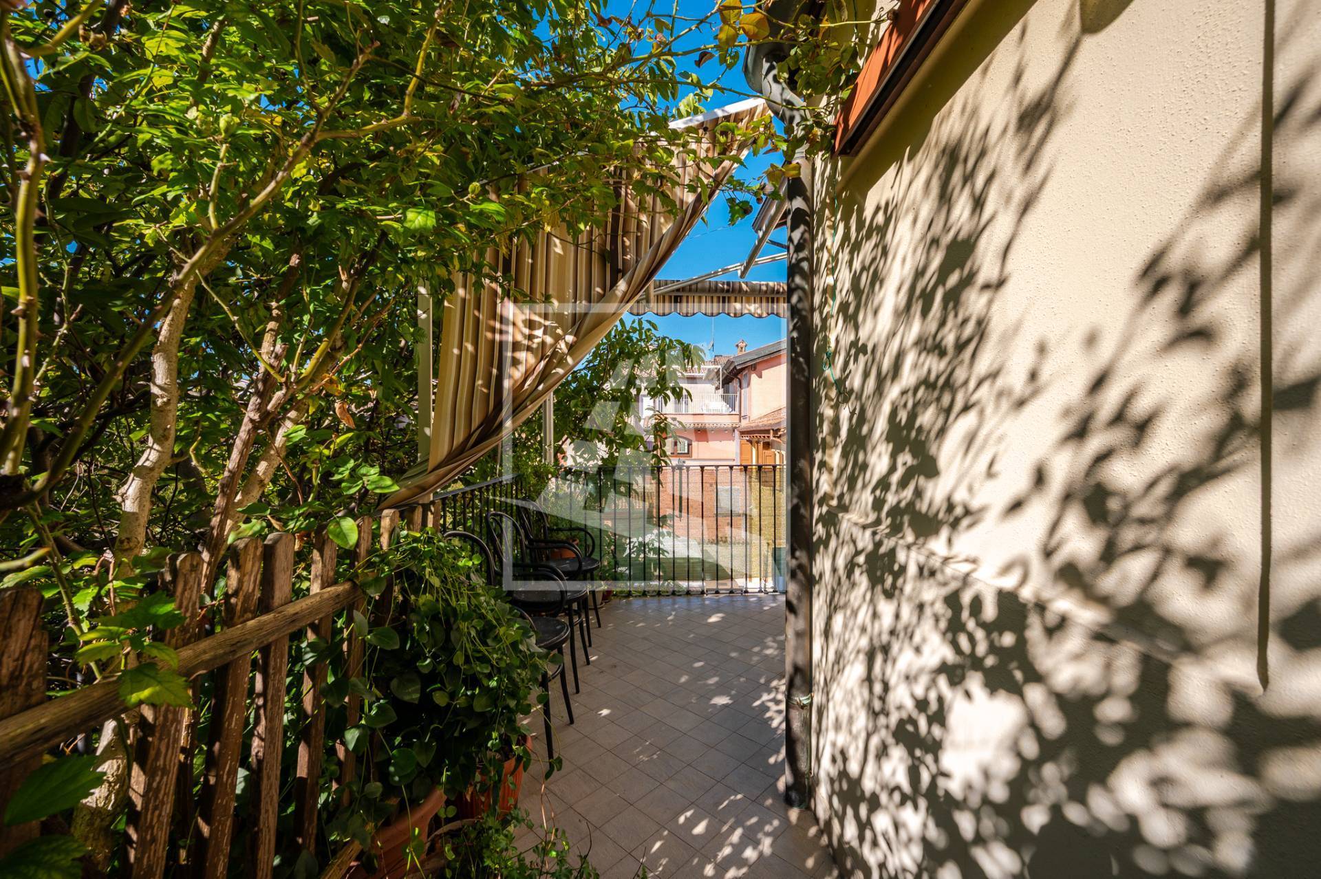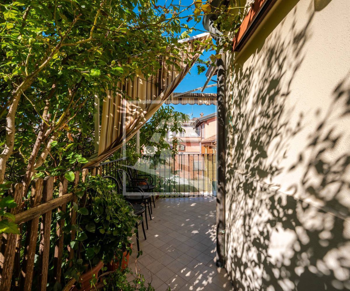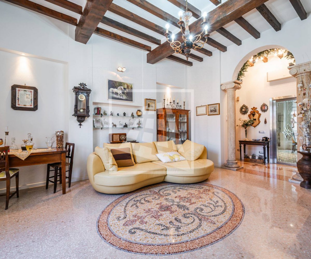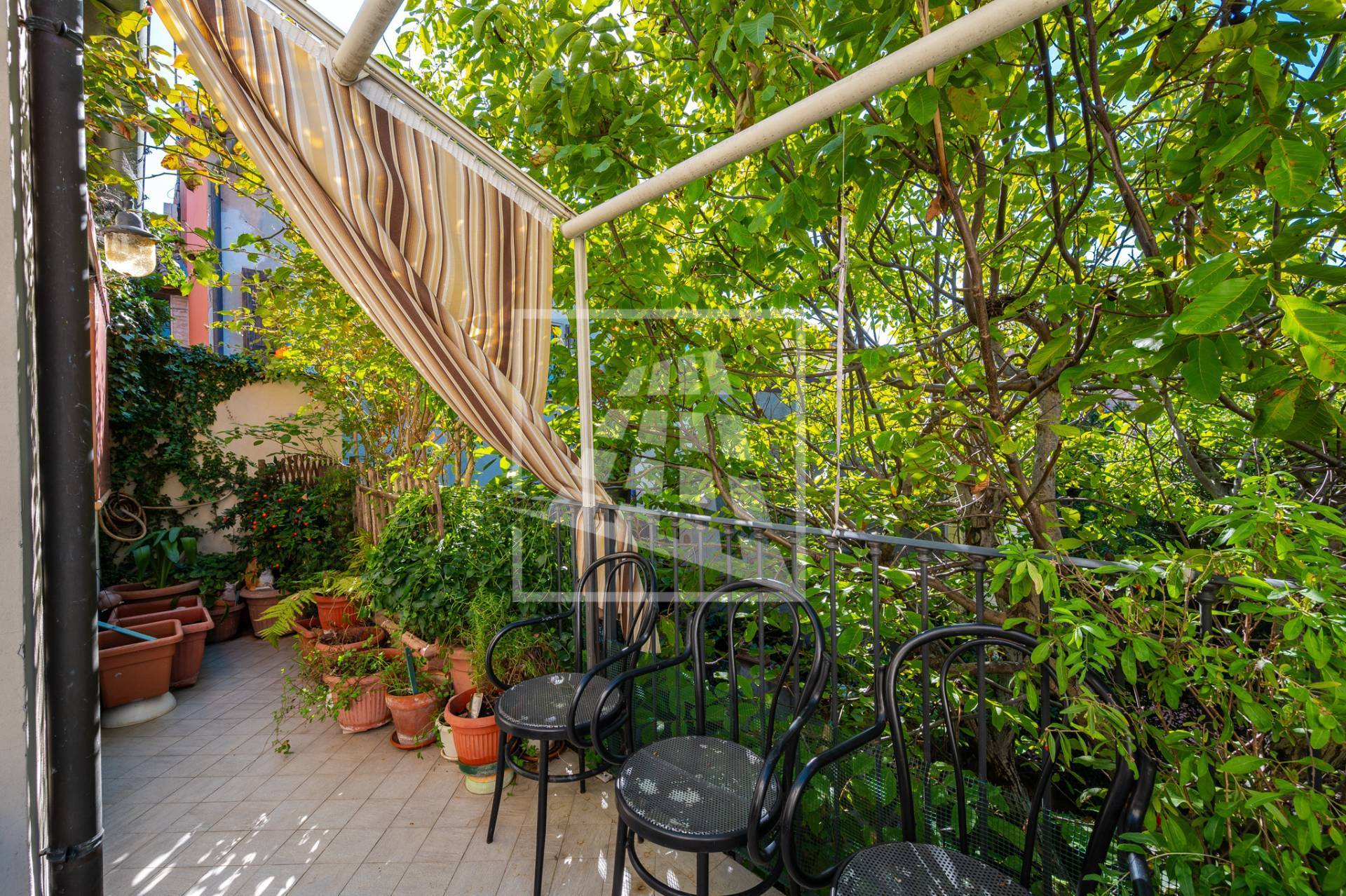 Internamente è composto da ingresso con arco e colonne in pietra originali, ampio soggiorno caratterizzato da travi in legno a vista, soffitti alti 3.20 m e dettagli preziosi come il pavimento storico in mosaico seminato veneziano, elementi che donano forte personalità agli ambienti; la cucina è invece moderna, dal design lineare e funzionale, ma arricchita da un camino in pietra e pavimenti originali, esternamente si trova poi un terrazzo angolare riservato e ombreggiato da tende solari bioclimatiche con chiusura elettrica, uno spazio ideale per momenti di relax all’aperto.
