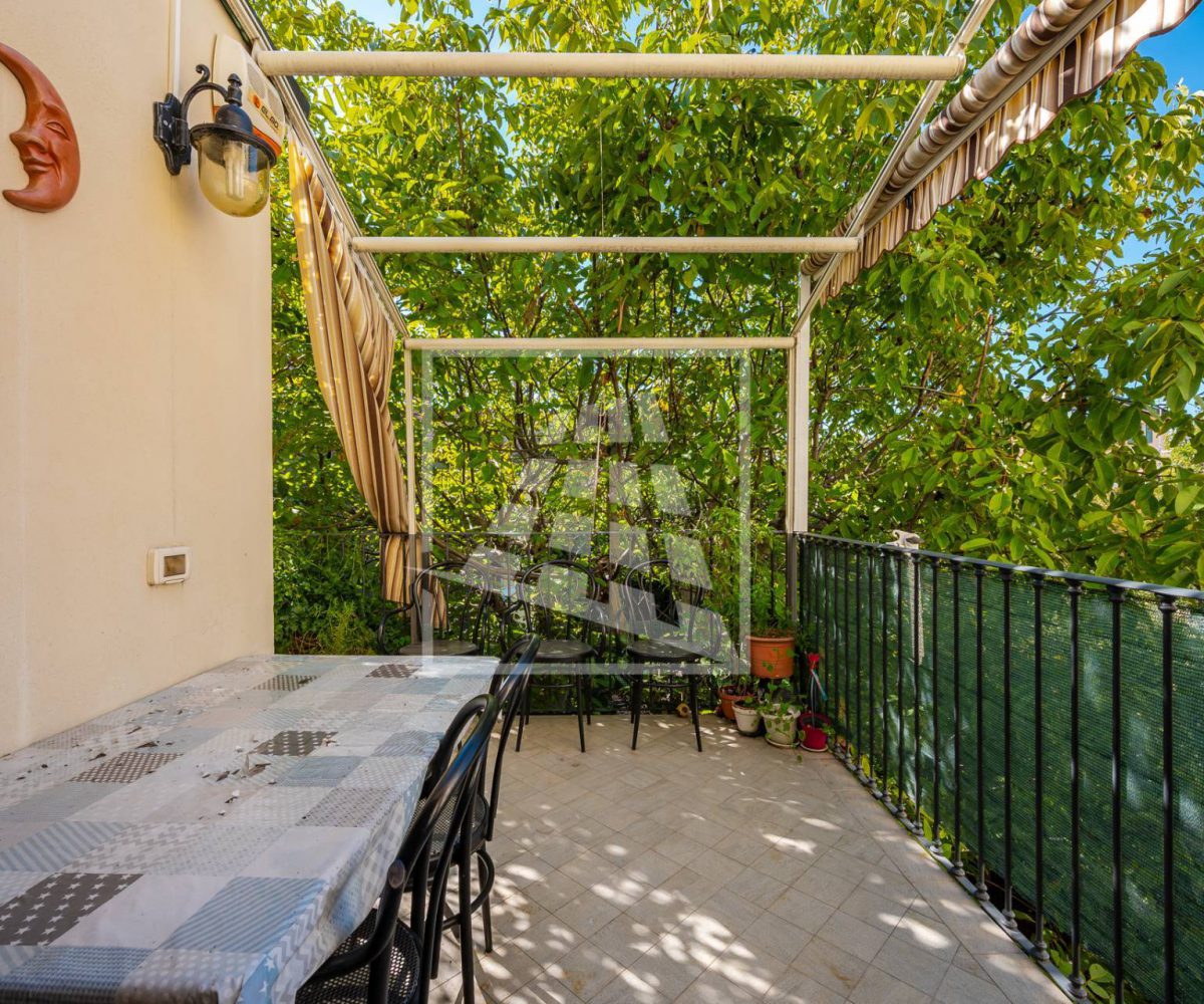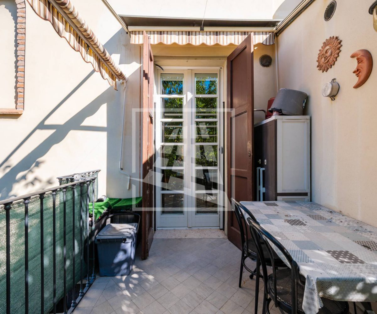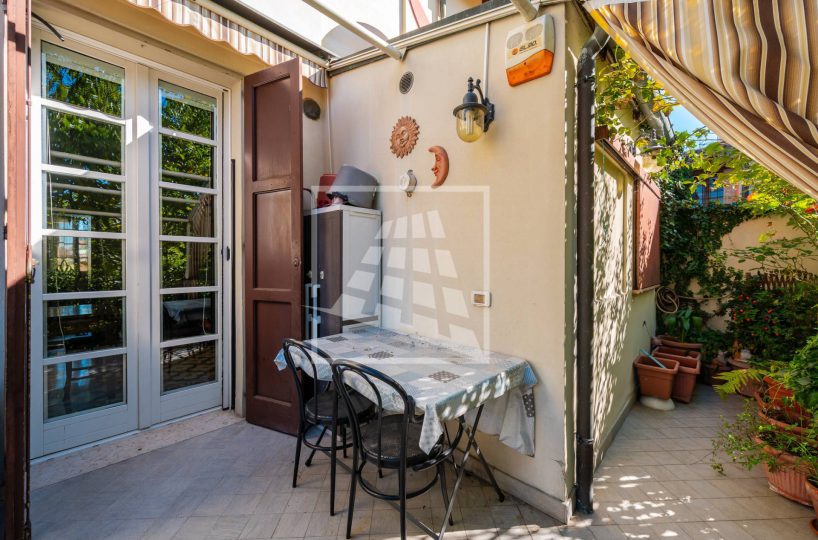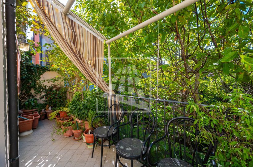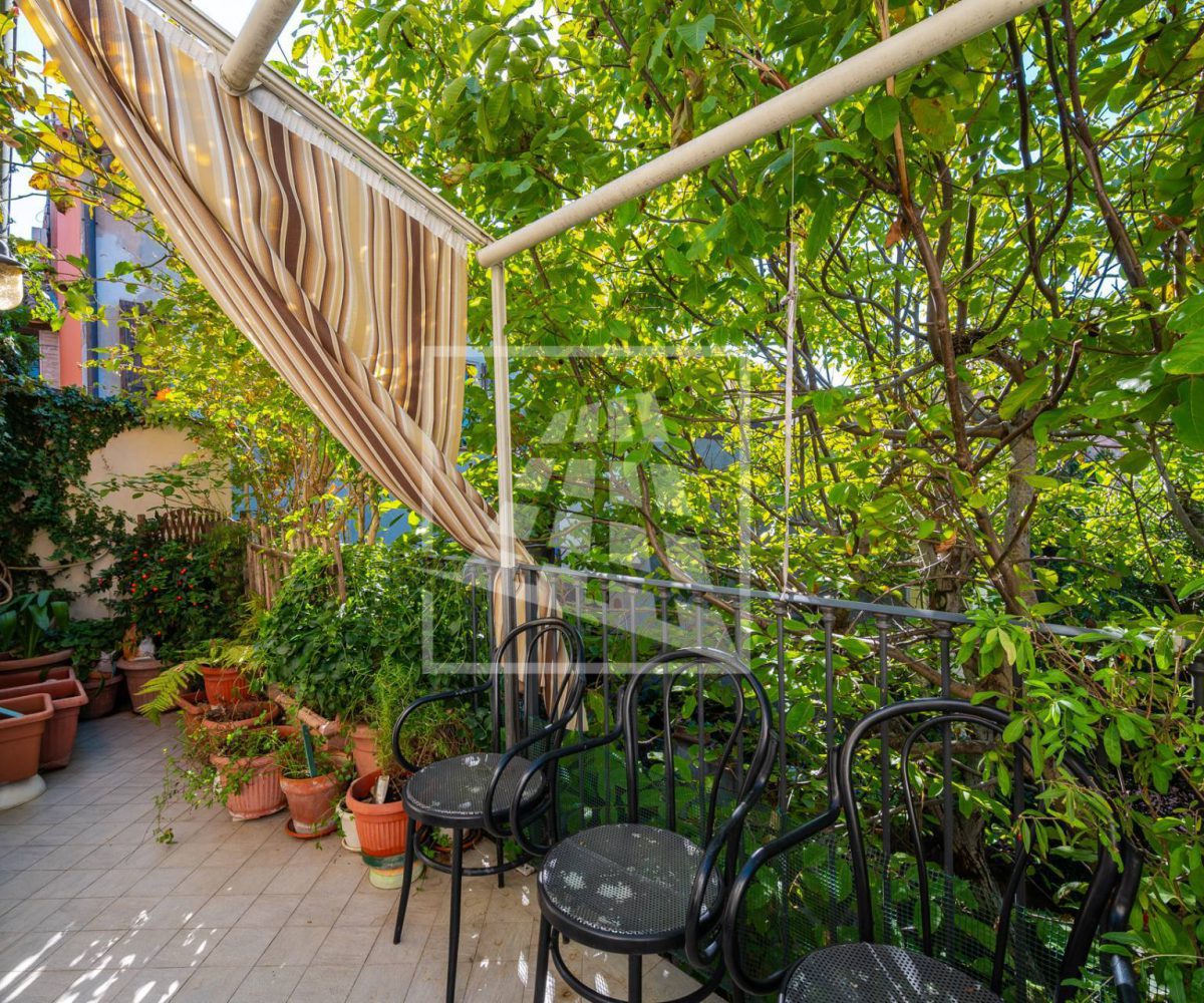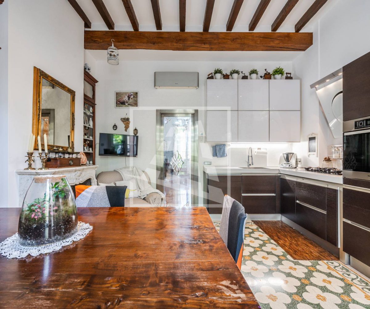 Internamente è composto da ingresso con arco e colonne in pietra originali, ampio soggiorno caratterizzato da travi in legno a vista, soffitti alti 3.20 m e dettagli preziosi come il pavimento storico in mosaico seminato veneziano, elementi che donano forte personalità agli ambienti; la cucina è invece moderna, dal design lineare e funzionale, ma arricchita da un camino in pietra e pavimenti originali, esternamente si trova poi un terrazzo angolare riservato e ombreggiato da tende solari bioclimatiche con chiusura elettrica, uno spazio ideale per momenti di relax all’aperto.
