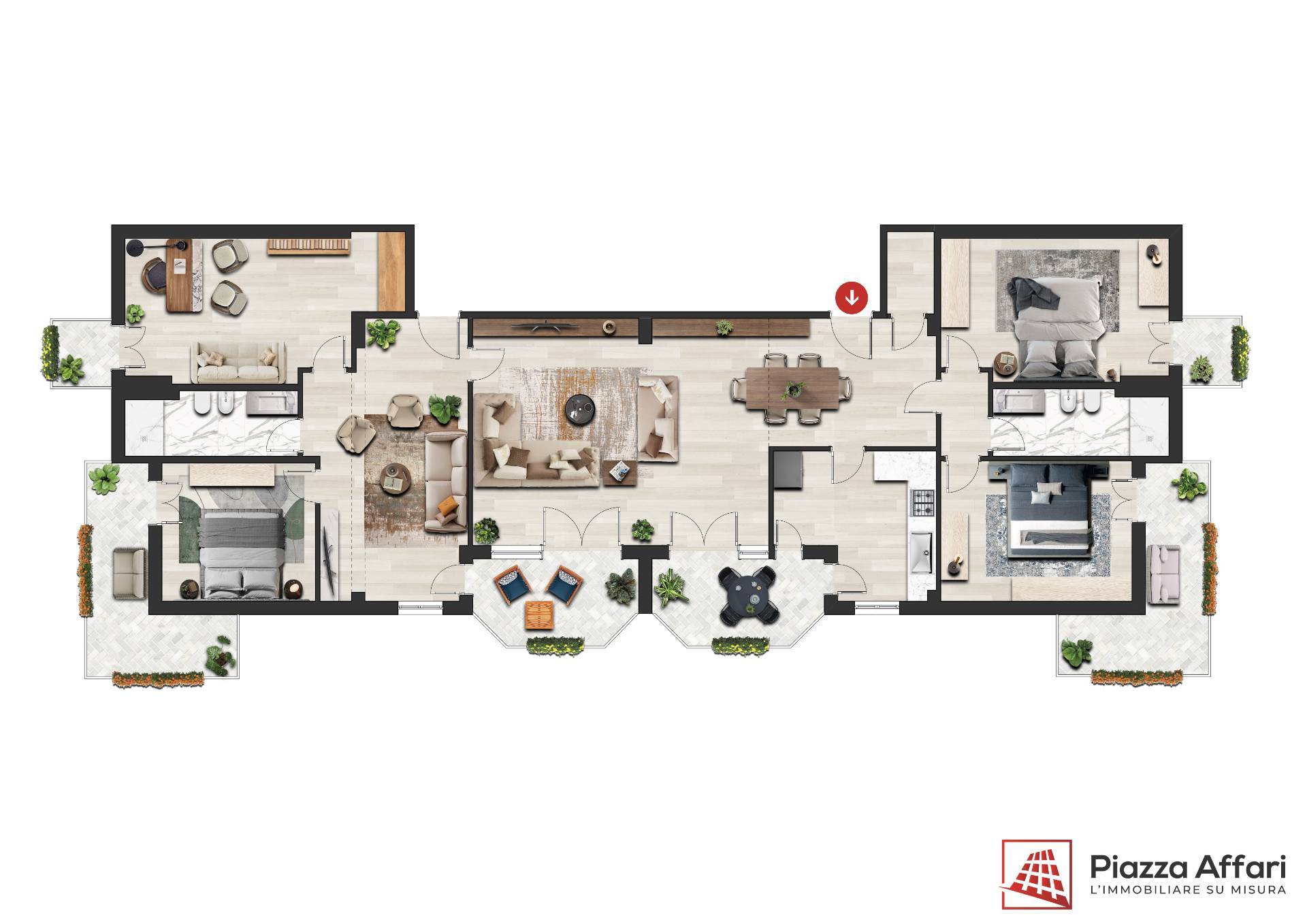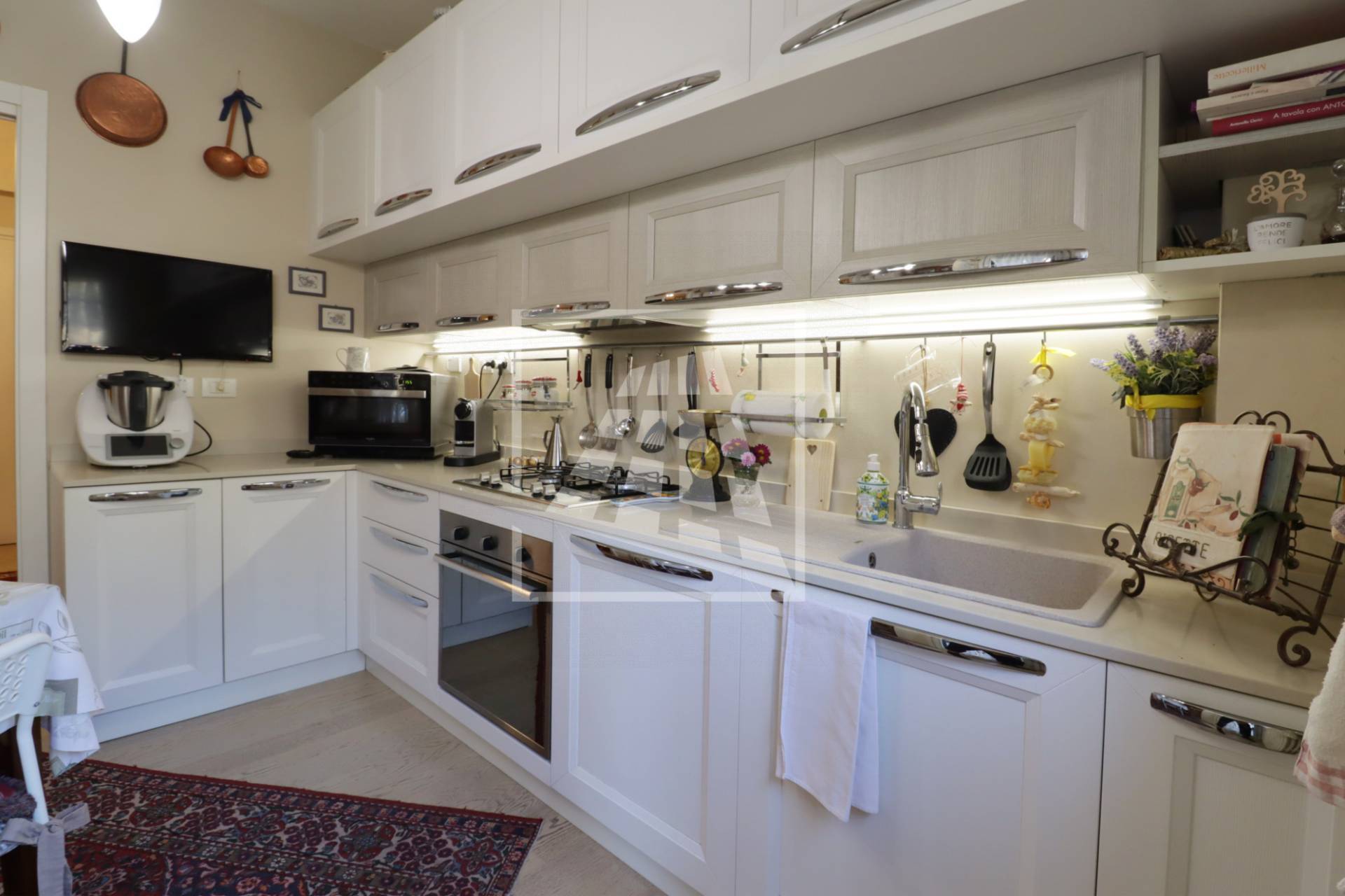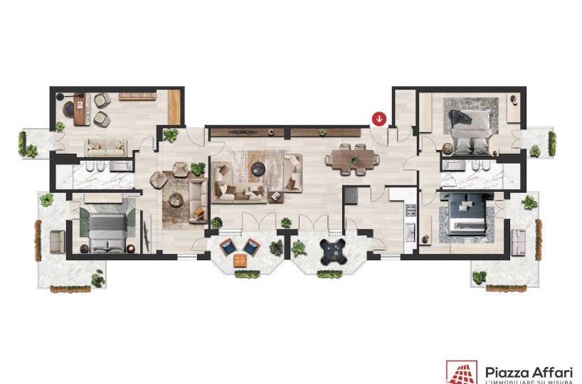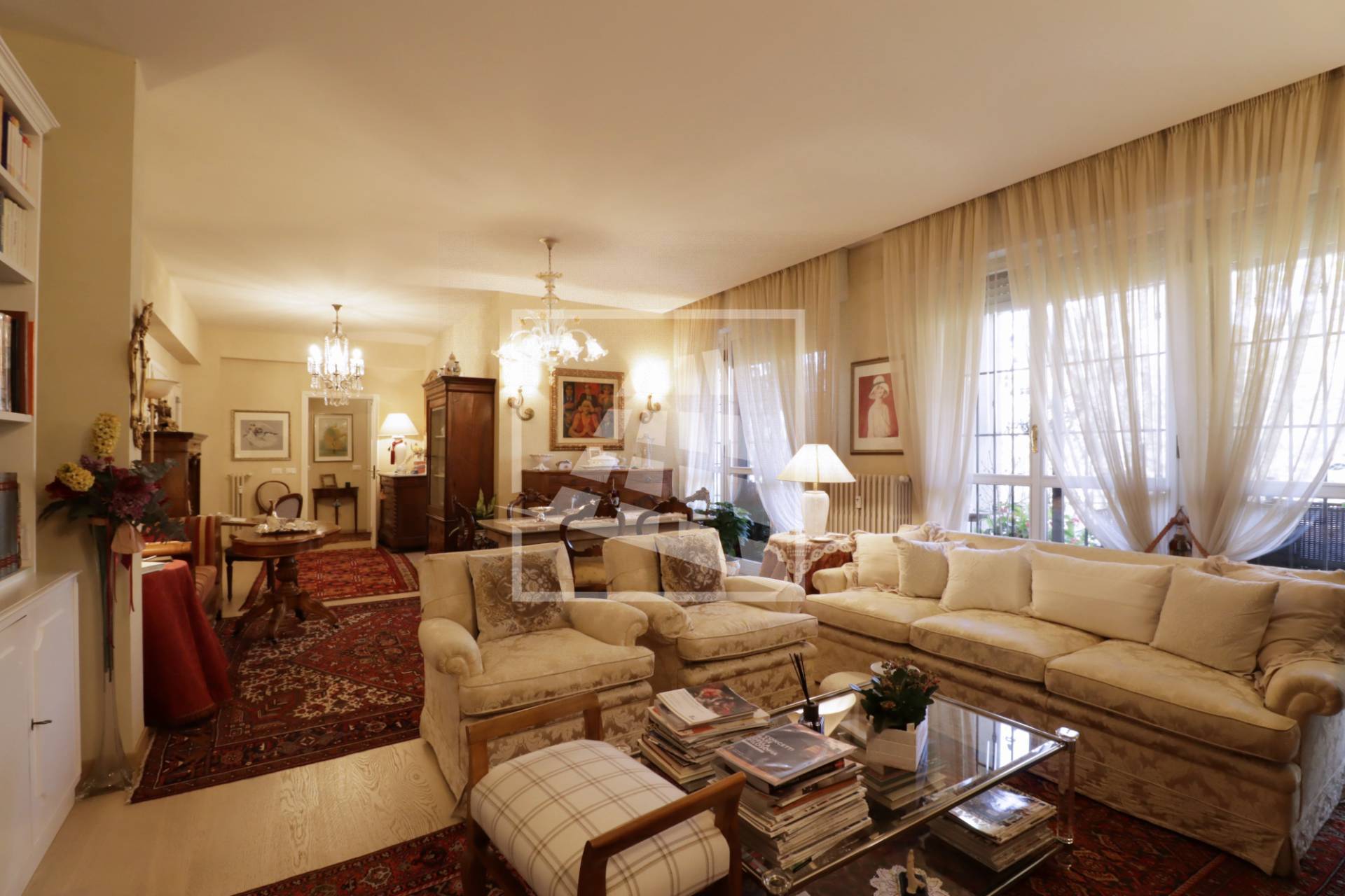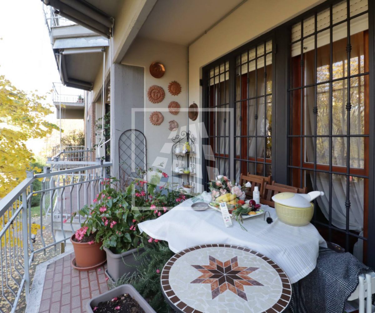 Appartamento di 175 mq, arricchito da quasi 30 mq di aree scoperte che affacciano sul verde circostante.