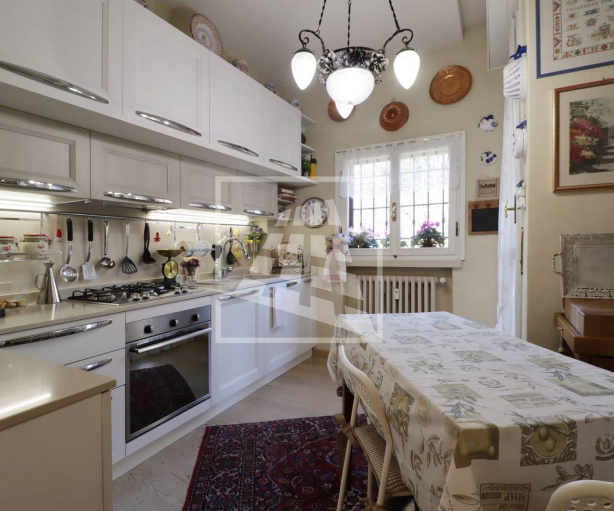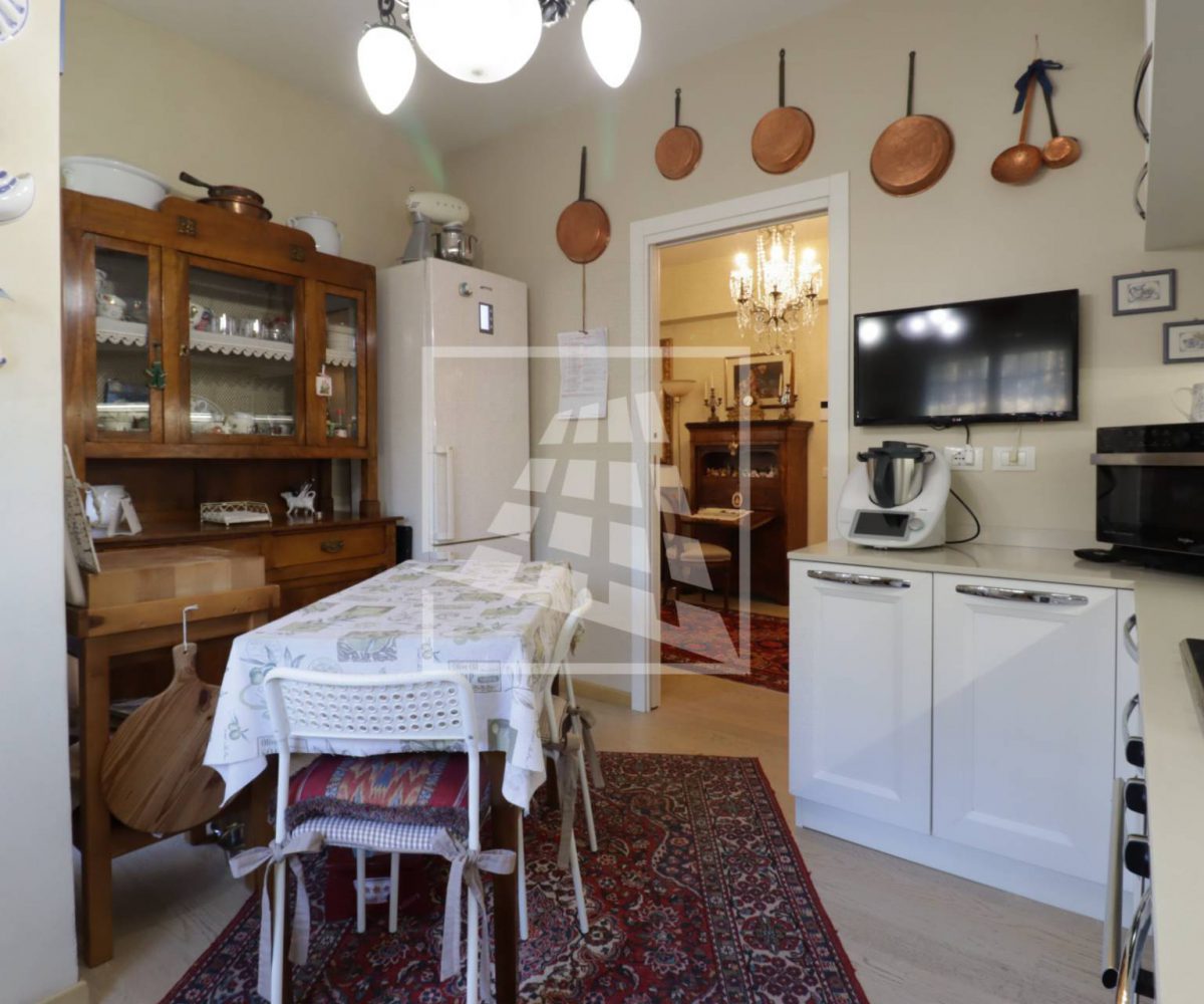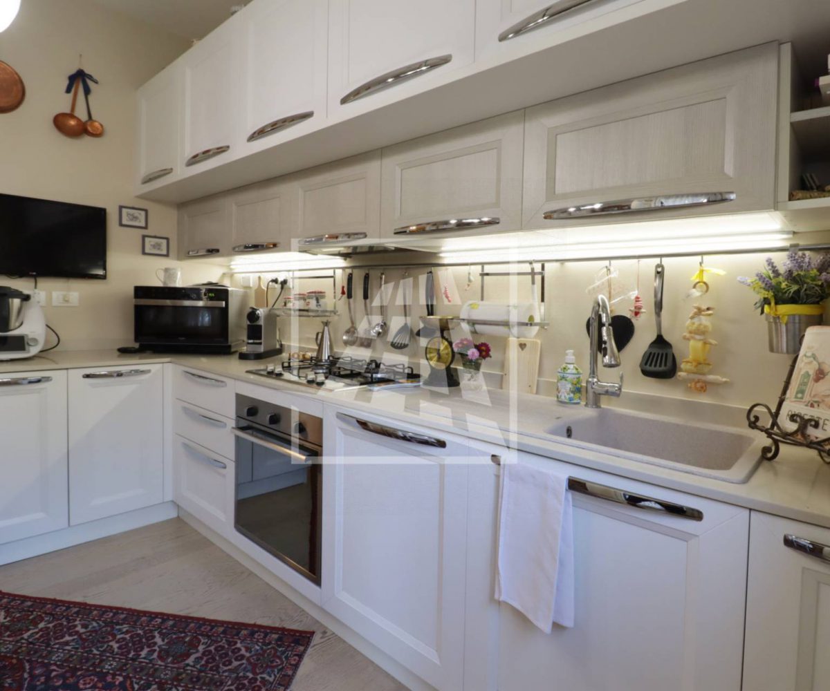 La zona giorno ospita un doppio soggiorno con affaccio su due balconi, una cucina abitabile anch’essa con sfogo esterno e un comodo ripostiglio.
