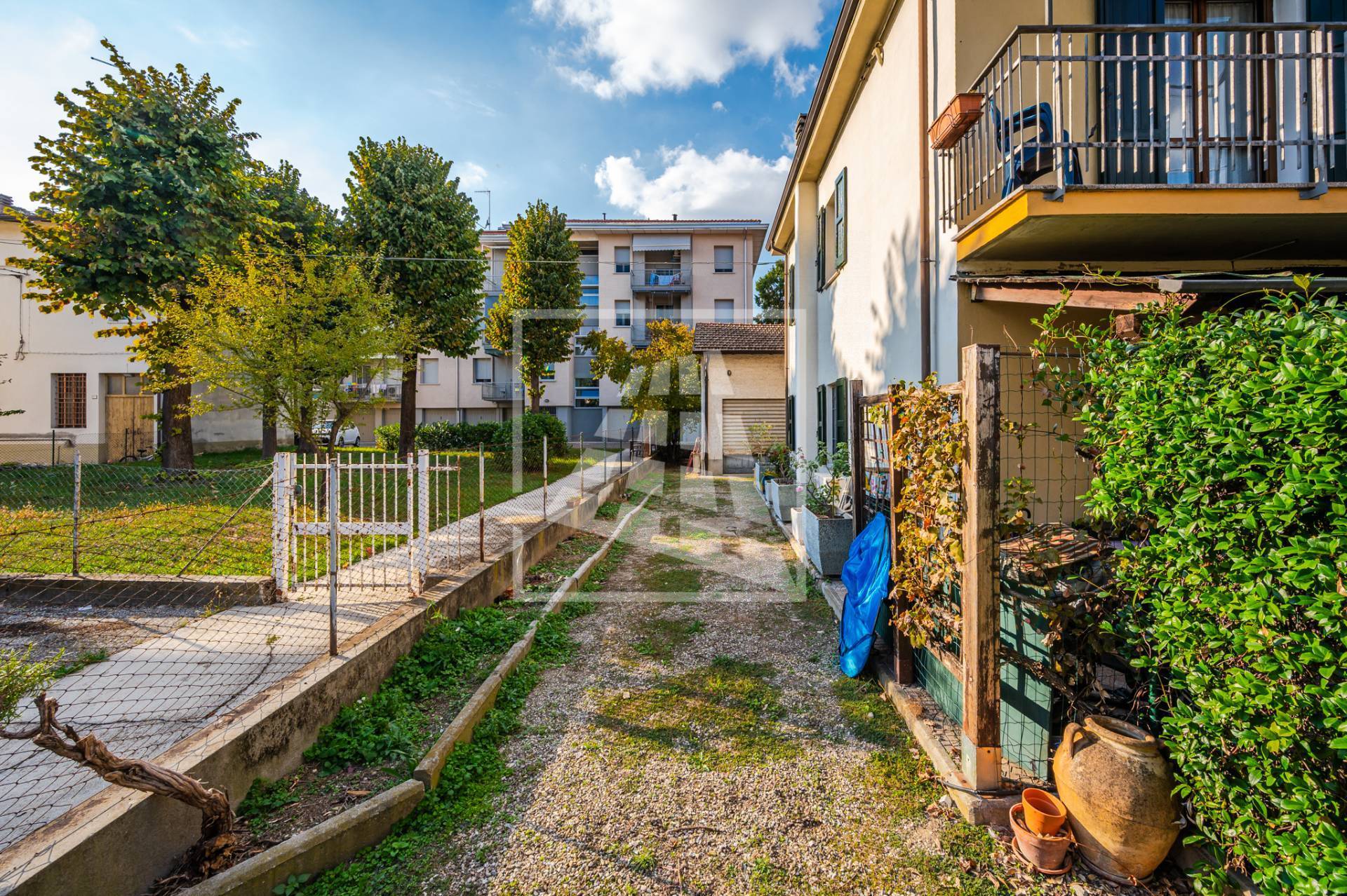 Esternamente, la proprietà include un cortile privato frontale con posto auto e accesso a un garage di 13 mq.
