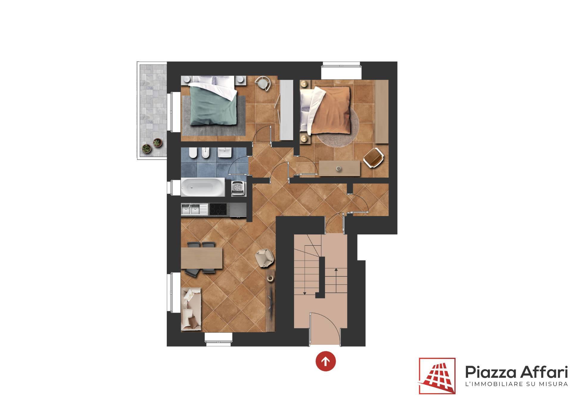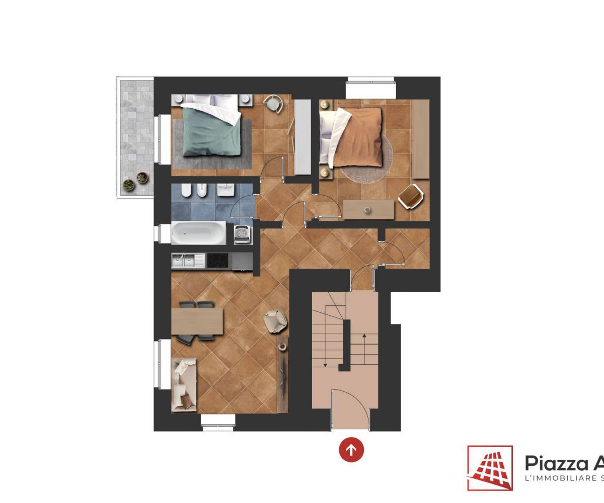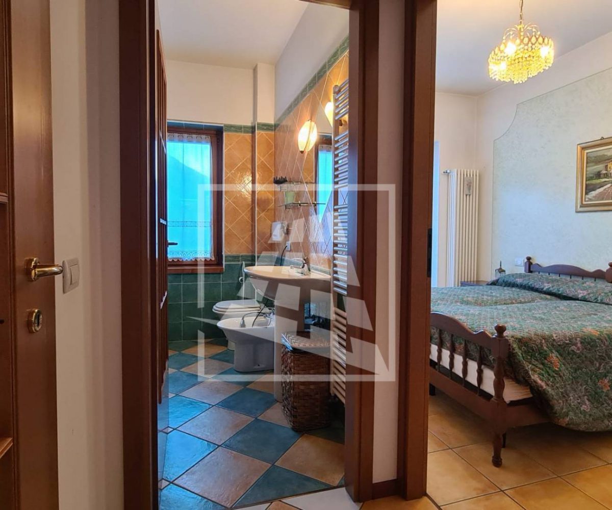 La zona notte, separata da un disimpegno, ospita un bagno finestrato e due camere da letto, di cui una con balconcino che accede al cortile privato.