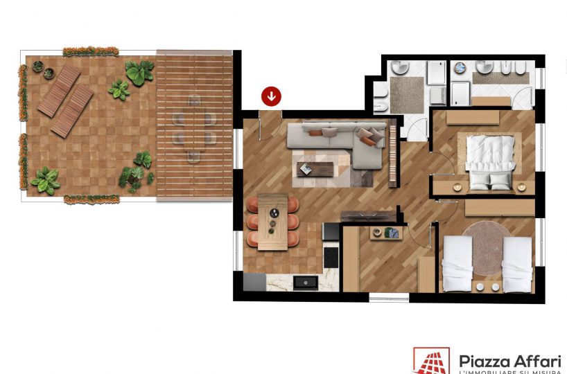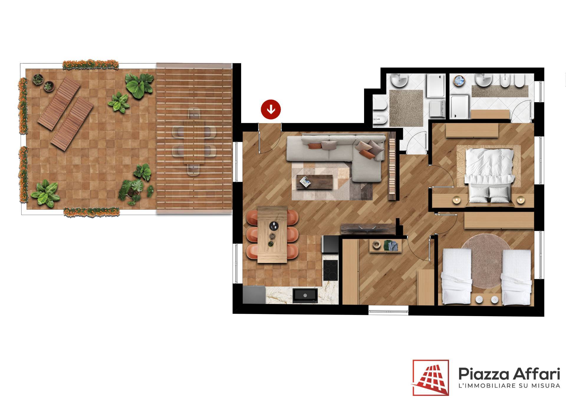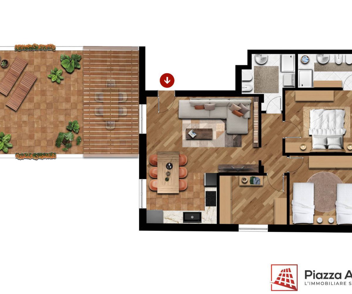 L’ingresso si apre su un ampio soggiorno open space con cucina a vista e affaccio su una spaziosa terrazza vivibile di oltre 30 mq.