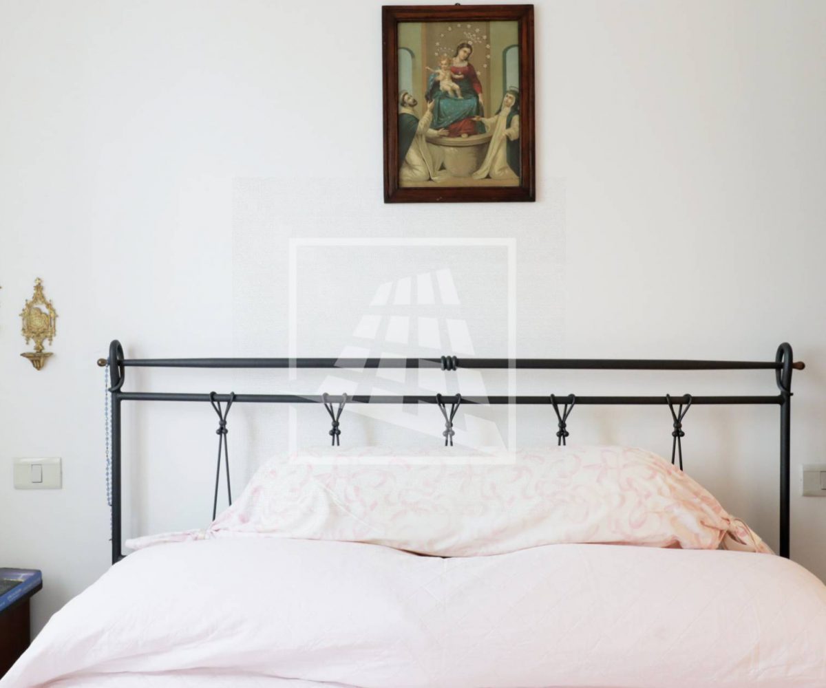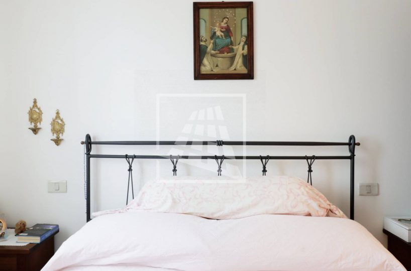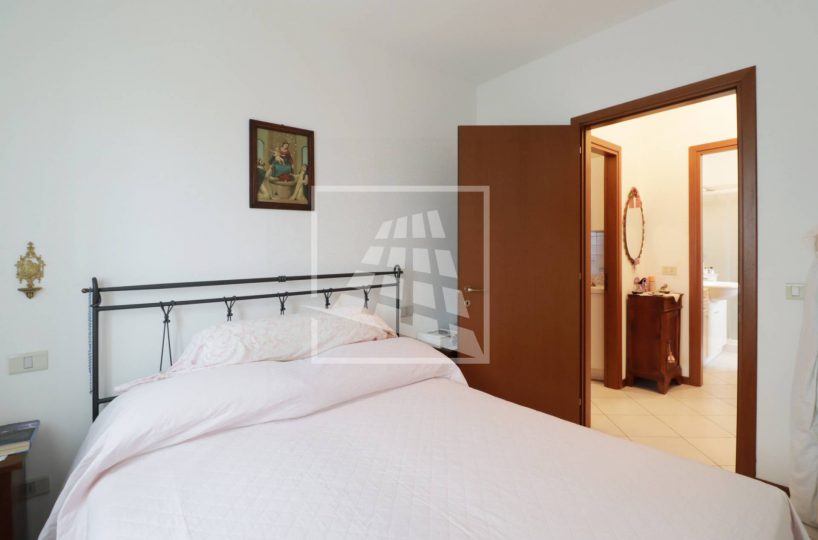 Un piccolo disimpegno, con armadiatura a muro, separa la zona notte ospitando una camera da letto matrimoniale e un bagno finestrato con box doccia.