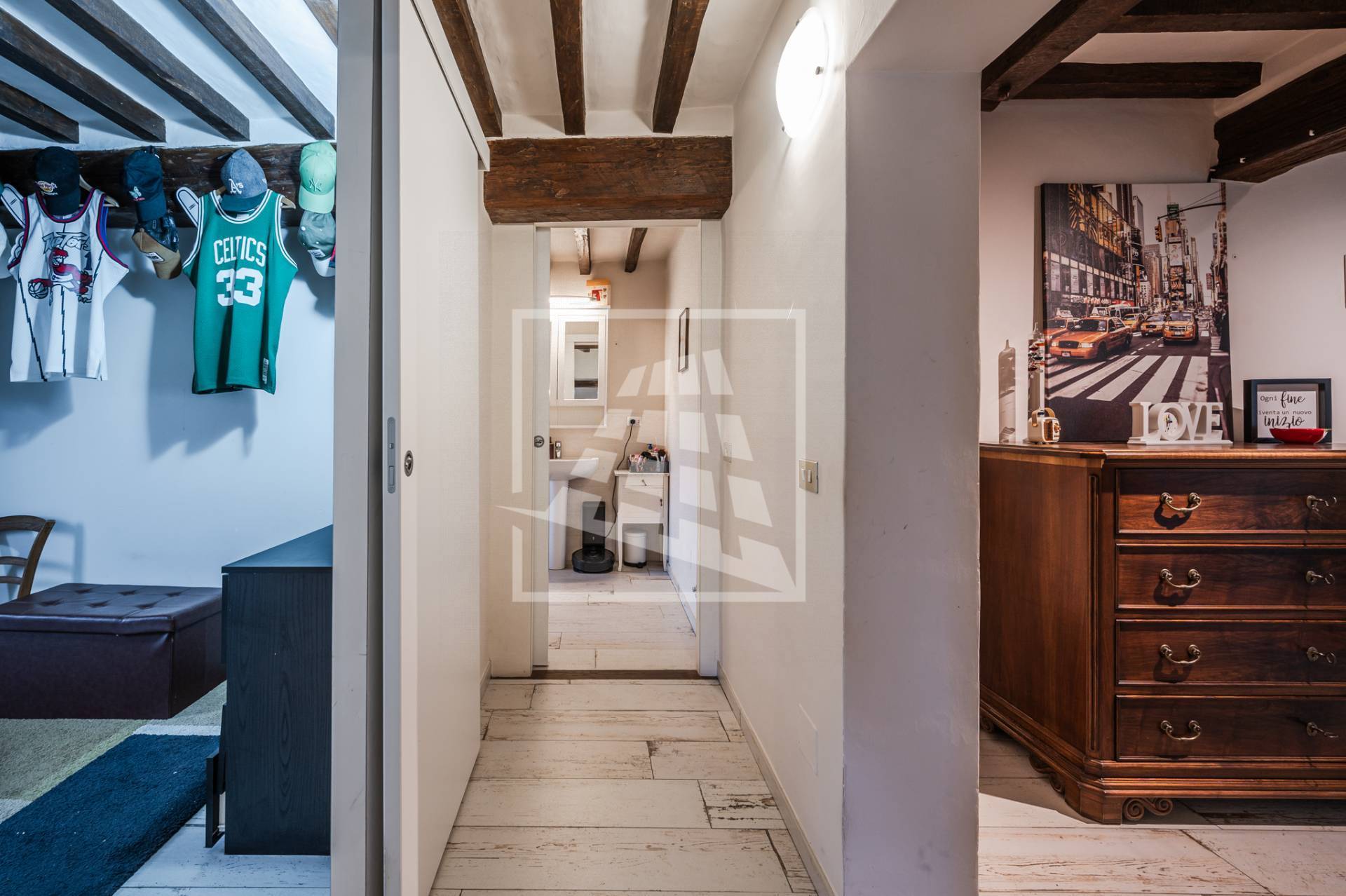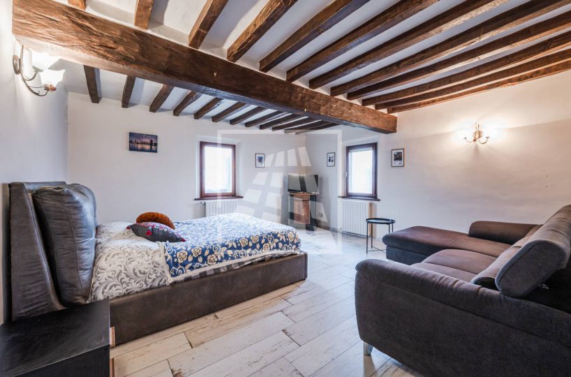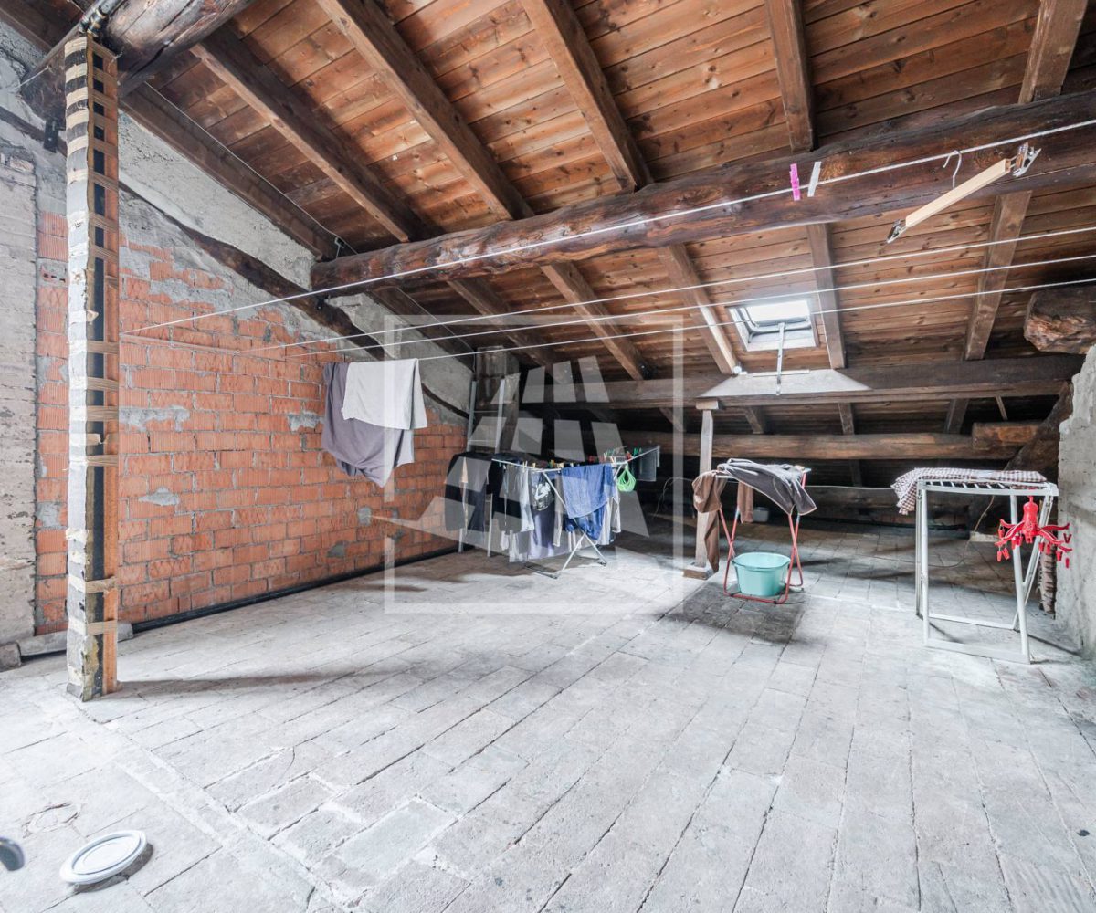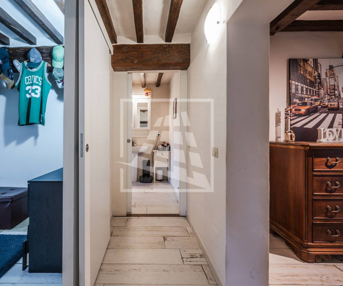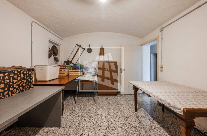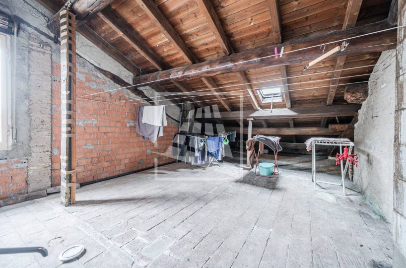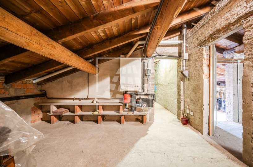 L’abitazione si apre su un luminoso salone di circa 82 mq, caratterizzato da un suggestivo soffitto in legno con travi a vista alto 5 metri e un accogliente pedana rialzata, attualmente dedicata alla zona living, completano la zona giorno una cucina abitabile in muratura, un antibagno e bagno finestrato.