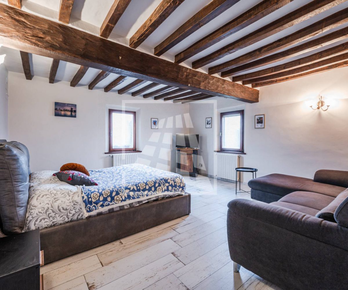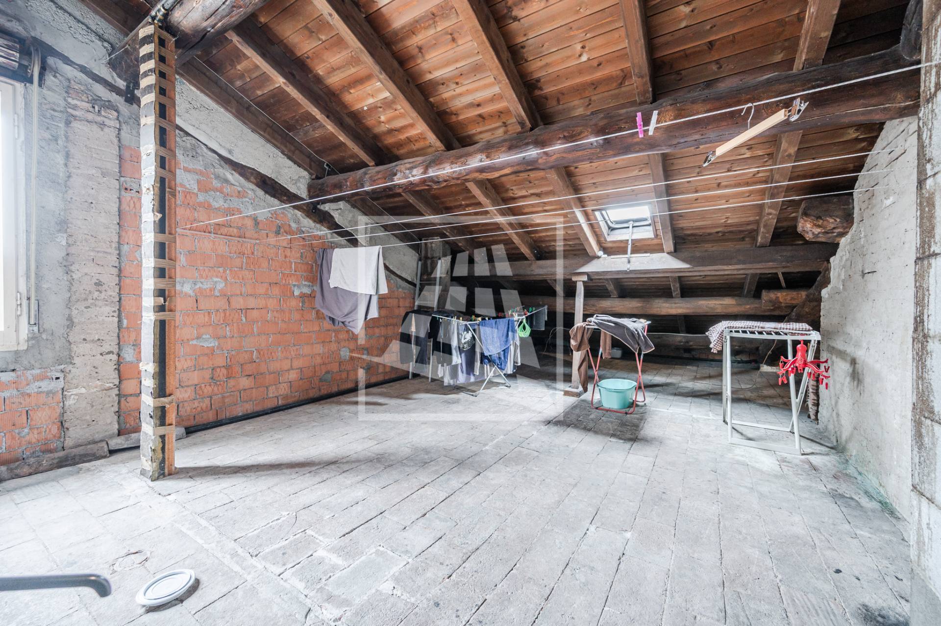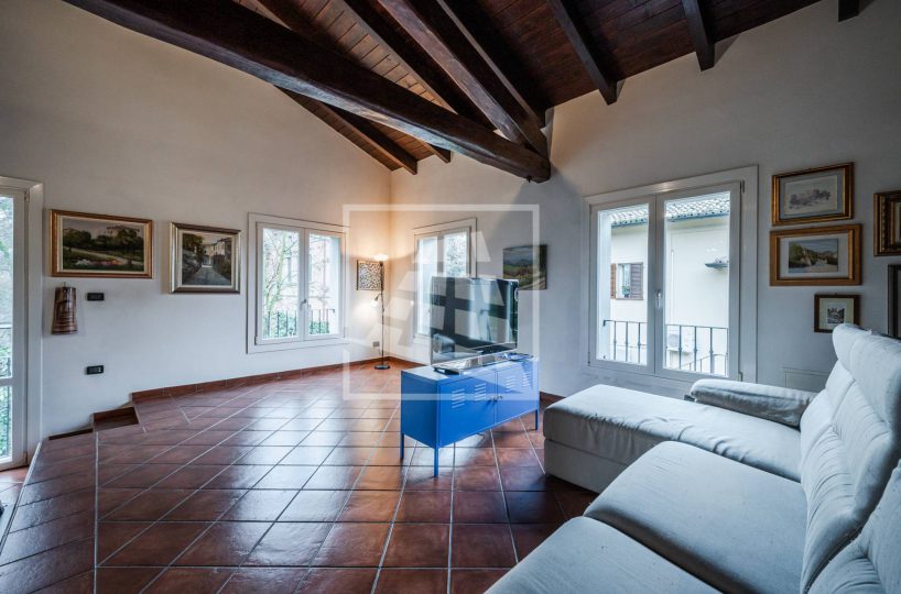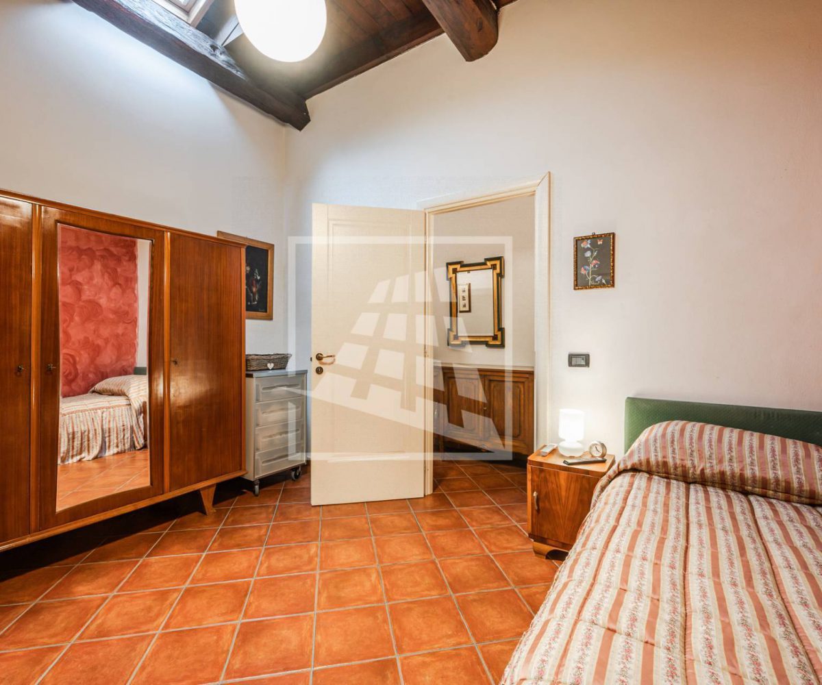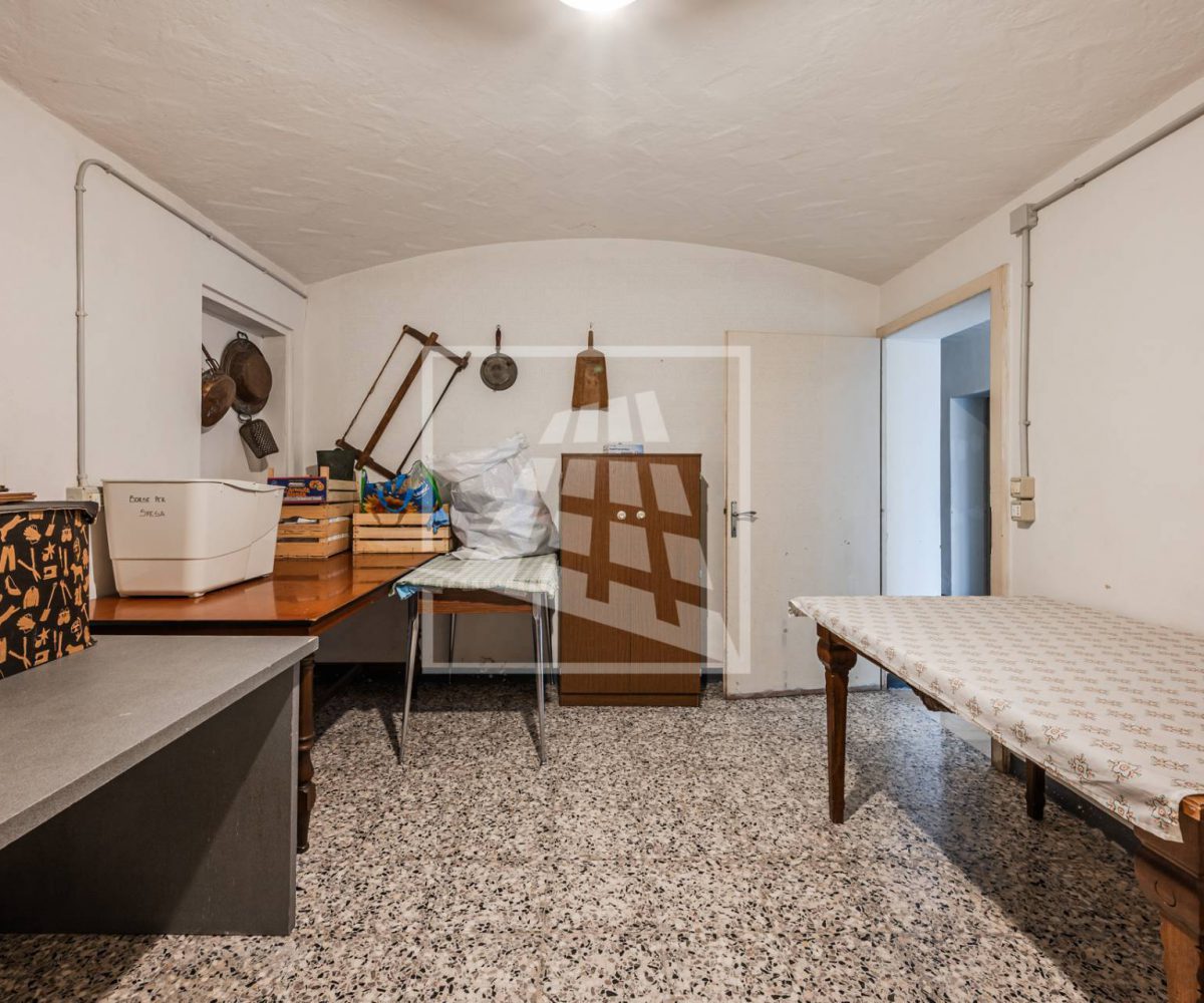 L’abitazione si apre su un luminoso salone di circa 82 mq, caratterizzato da un suggestivo soffitto in legno con travi a vista alto 5 metri e un accogliente pedana rialzata, attualmente dedicata alla zona living, completano la zona giorno una cucina abitabile in muratura, un antibagno e bagno finestrato.