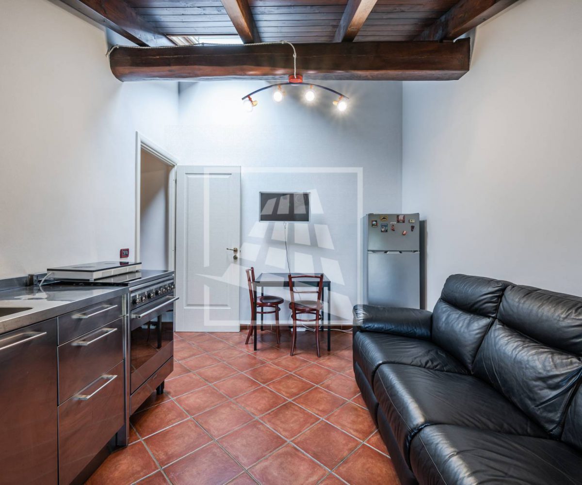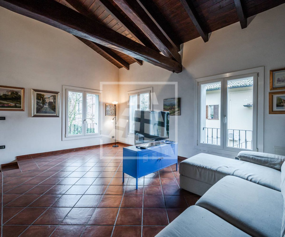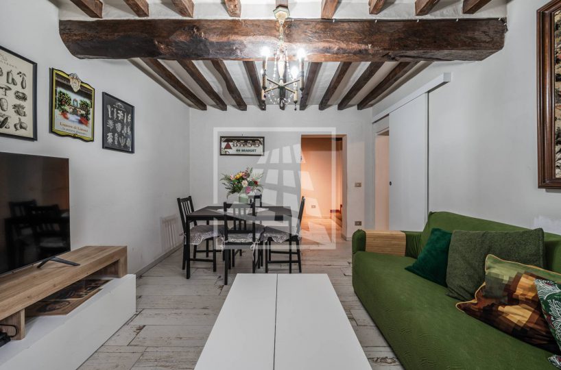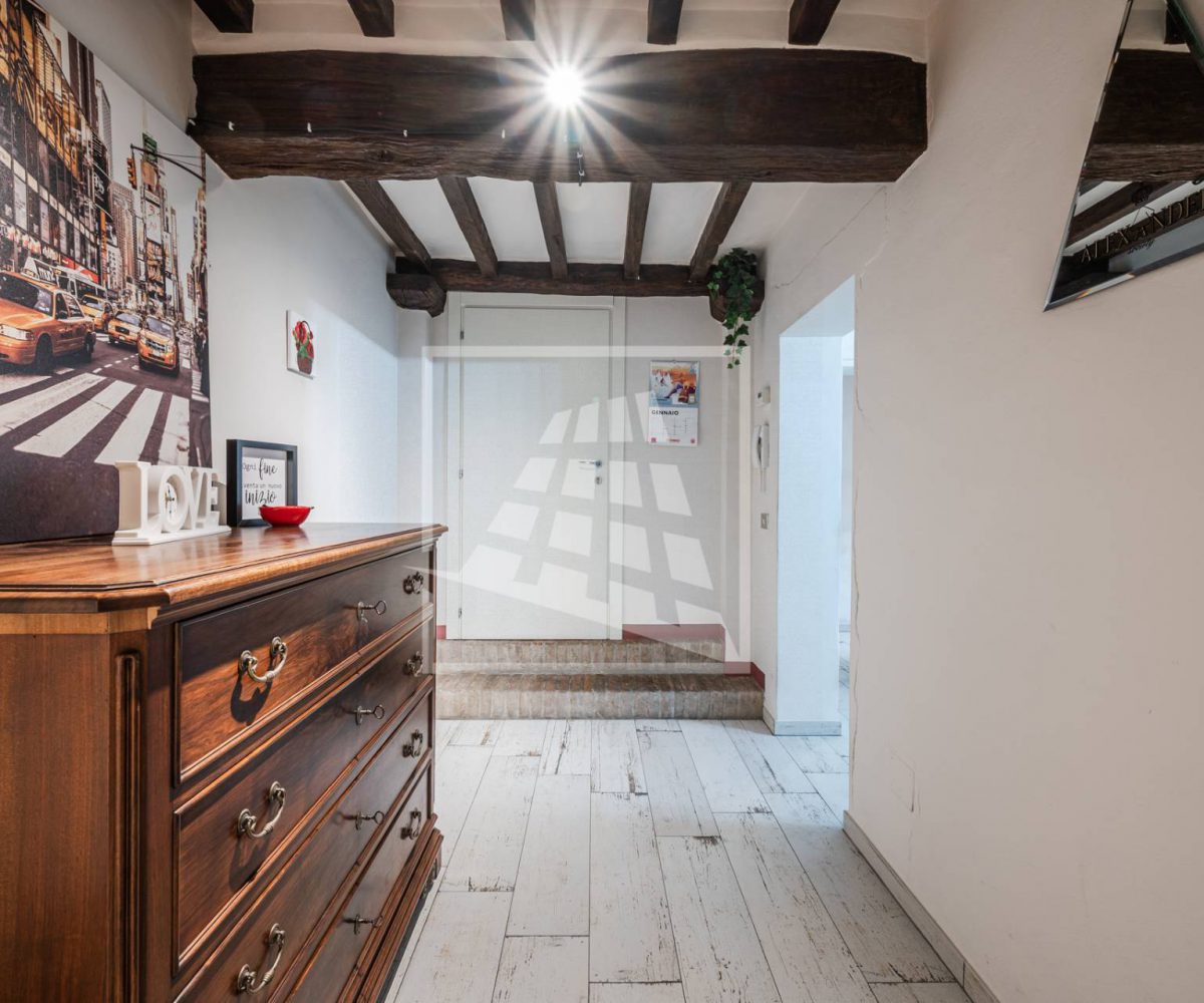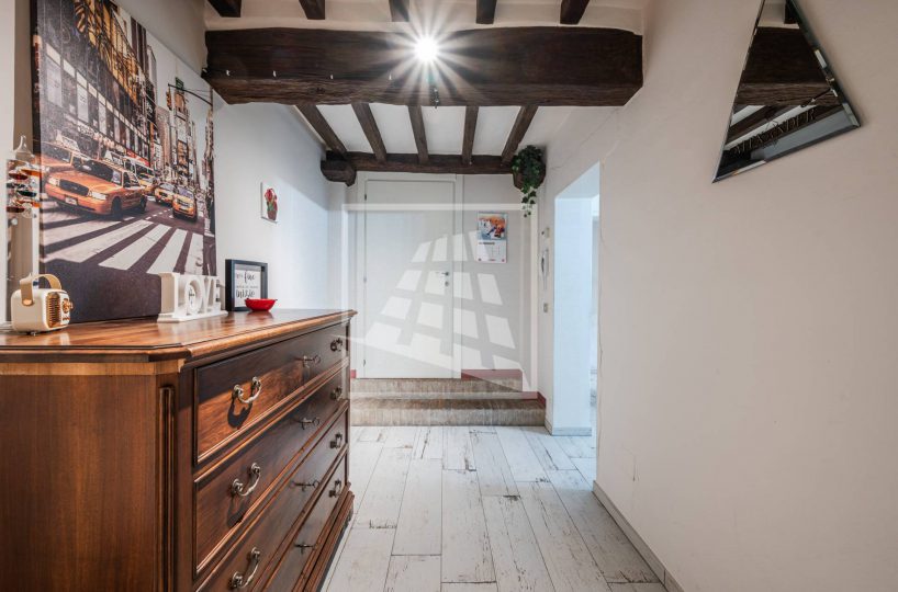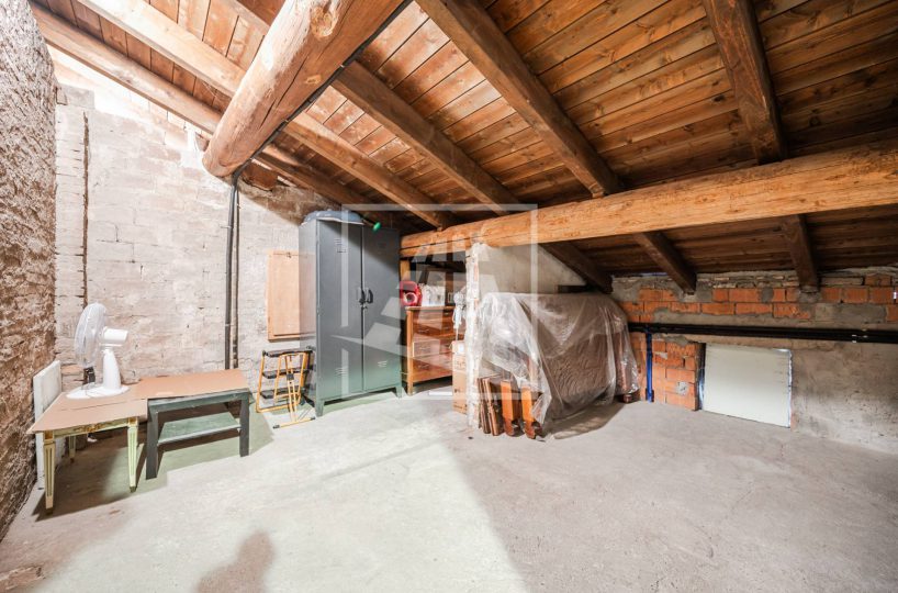 L’abitazione si apre su un luminoso salone di circa 82 mq, caratterizzato da un suggestivo soffitto in legno con travi a vista alto 5 metri e un accogliente pedana rialzata, attualmente dedicata alla zona living, completano la zona giorno una cucina abitabile in muratura, un antibagno e bagno finestrato.