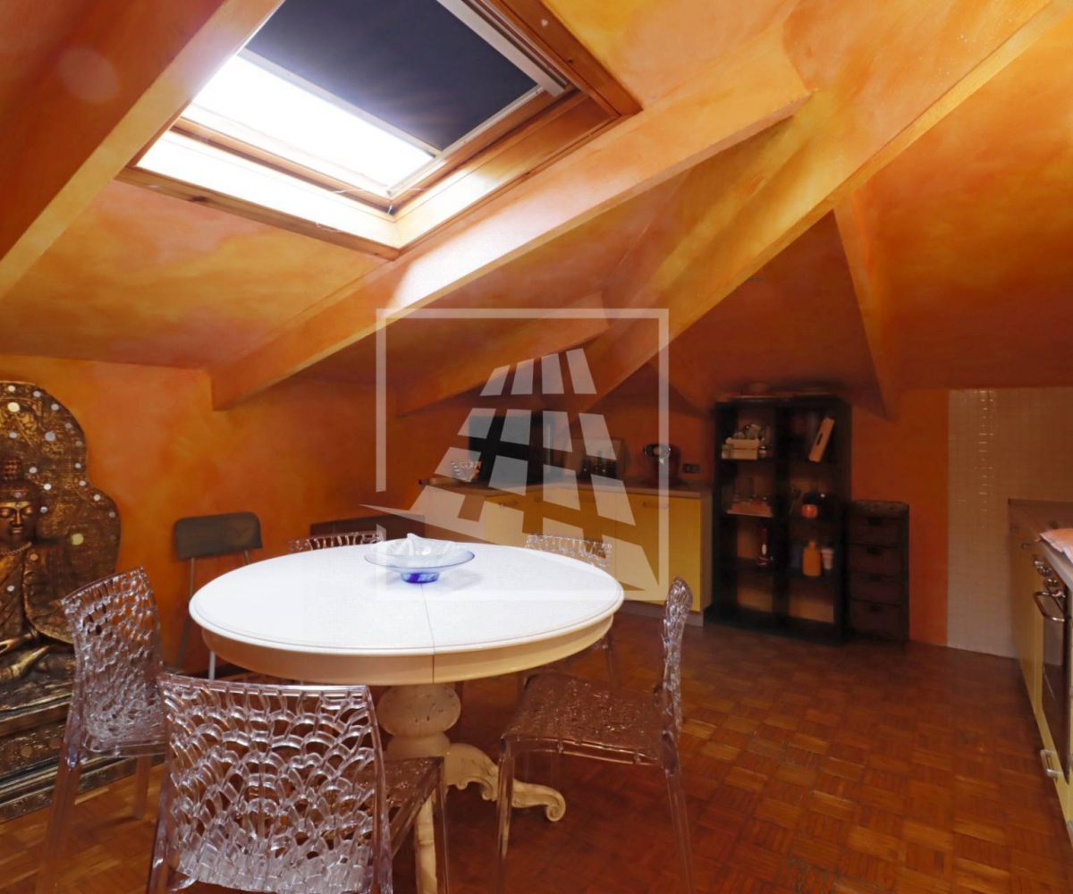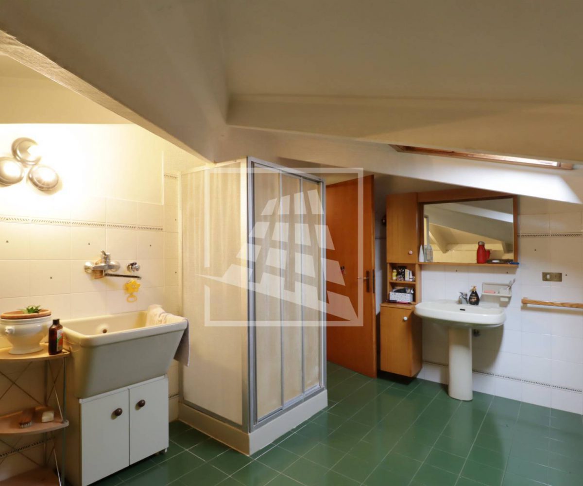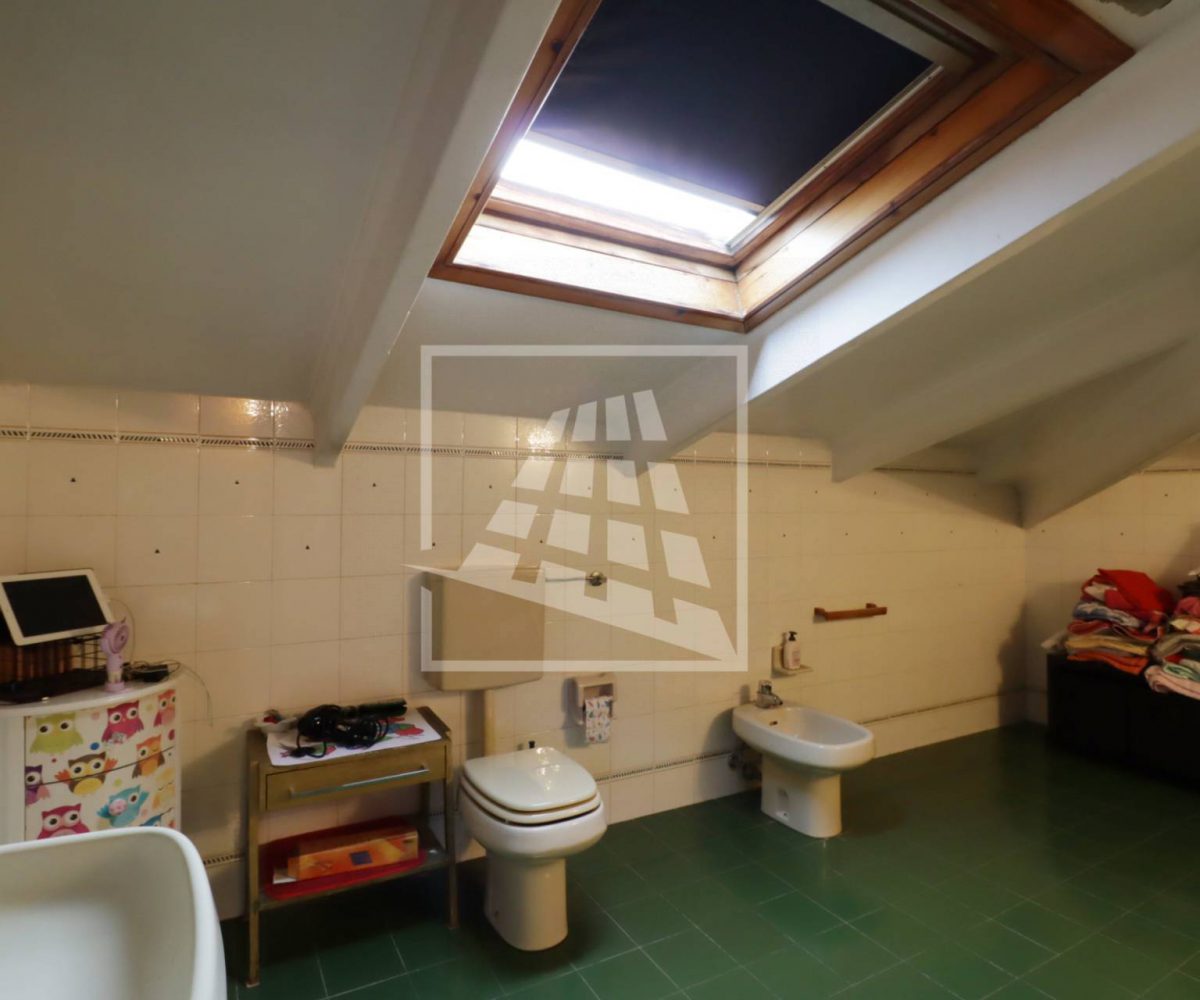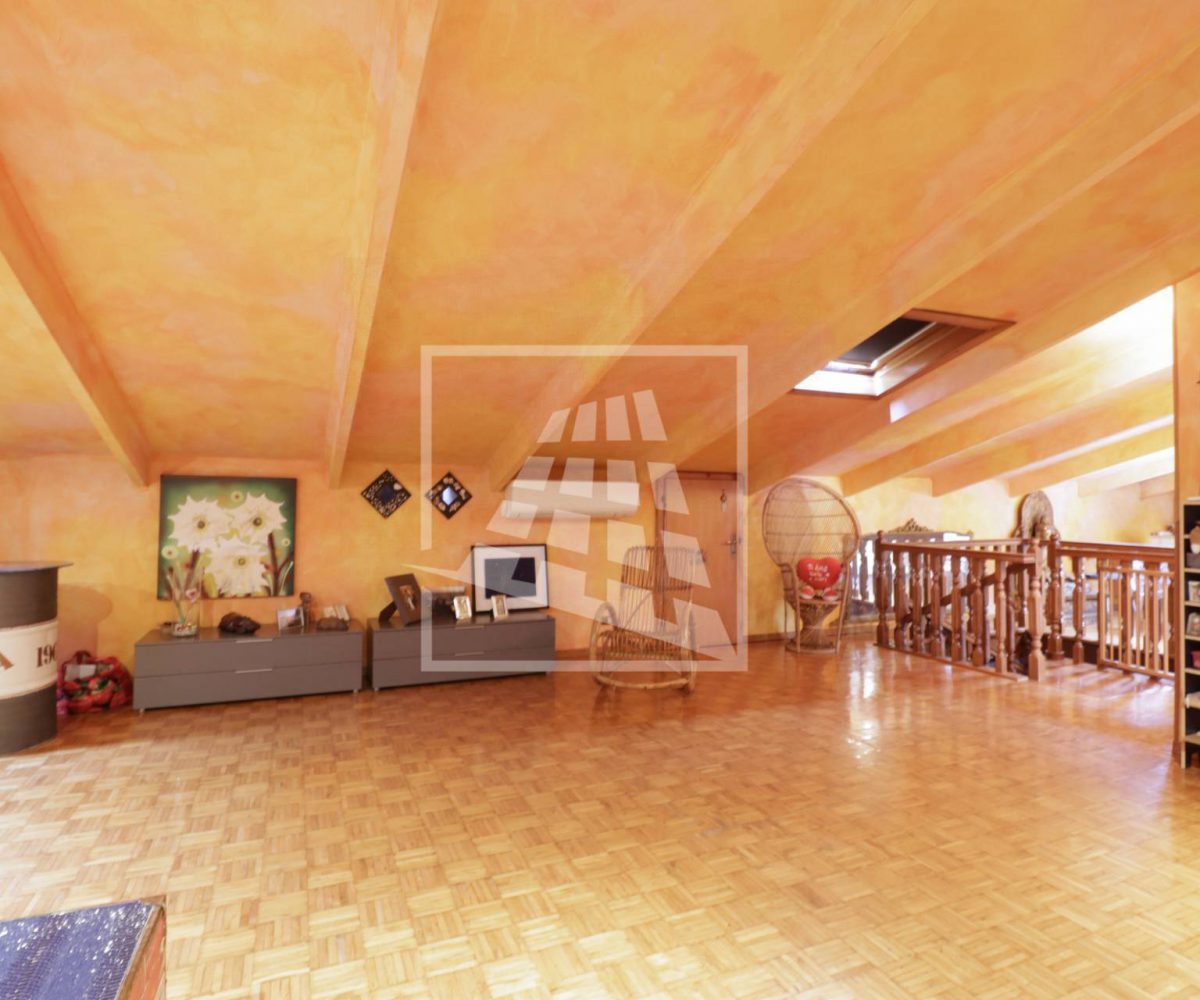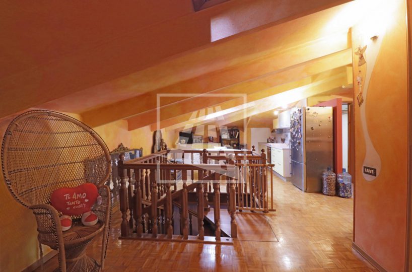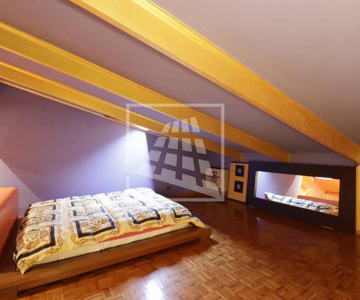 Attraverso una scala in legno si accede al piano superiore, una mansarda di 140 mq composta da tre ampi locali e un bagno di servizio.