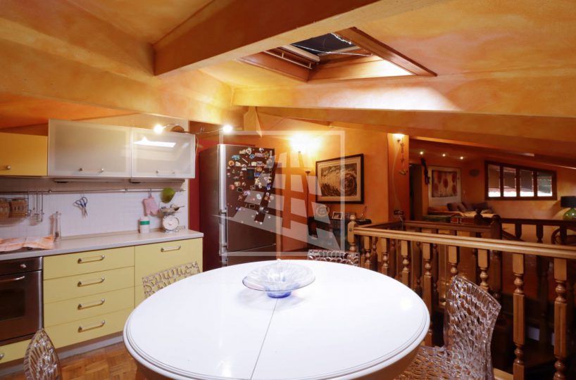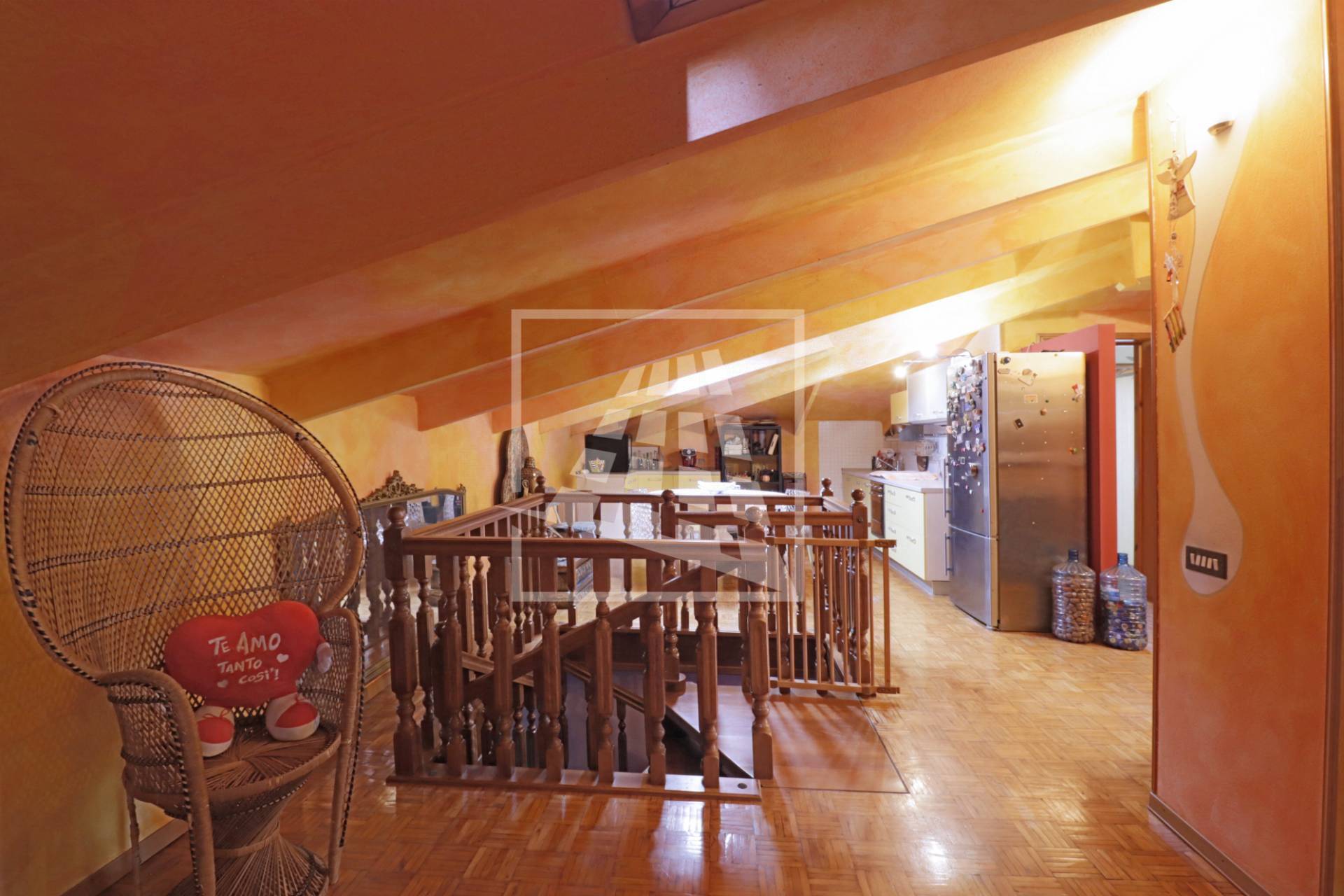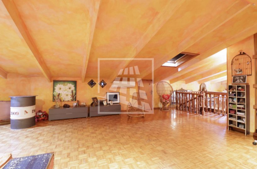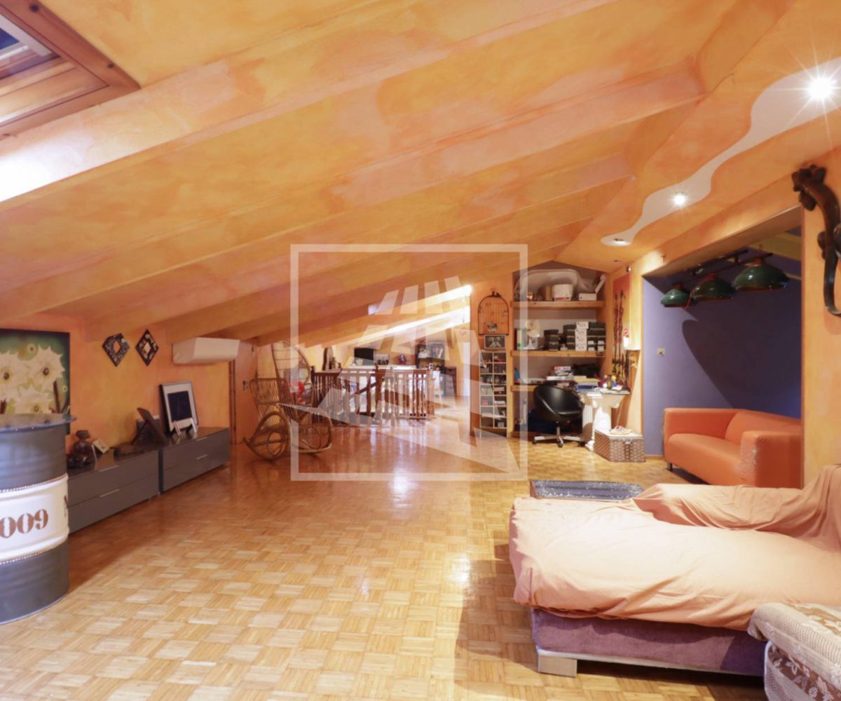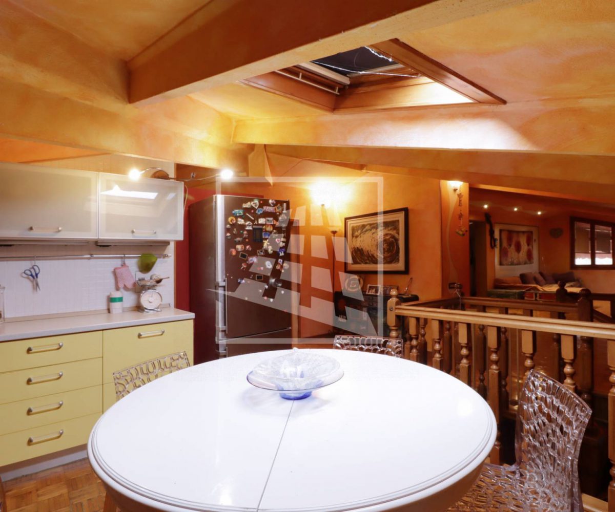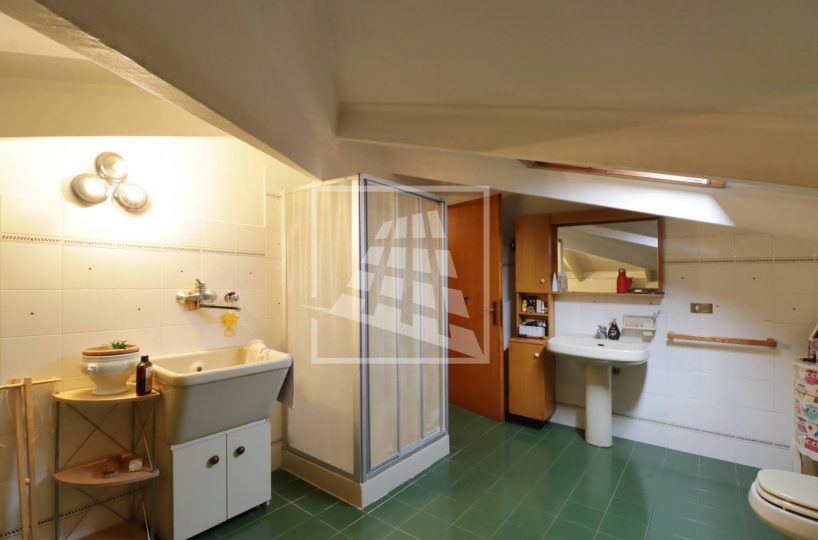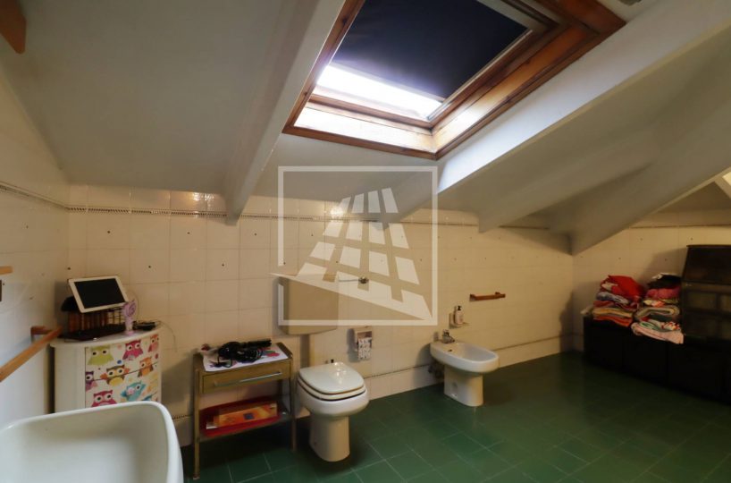 Attraverso una scala in legno si accede al piano superiore, una mansarda di 140 mq composta da tre ampi locali e un bagno di servizio.