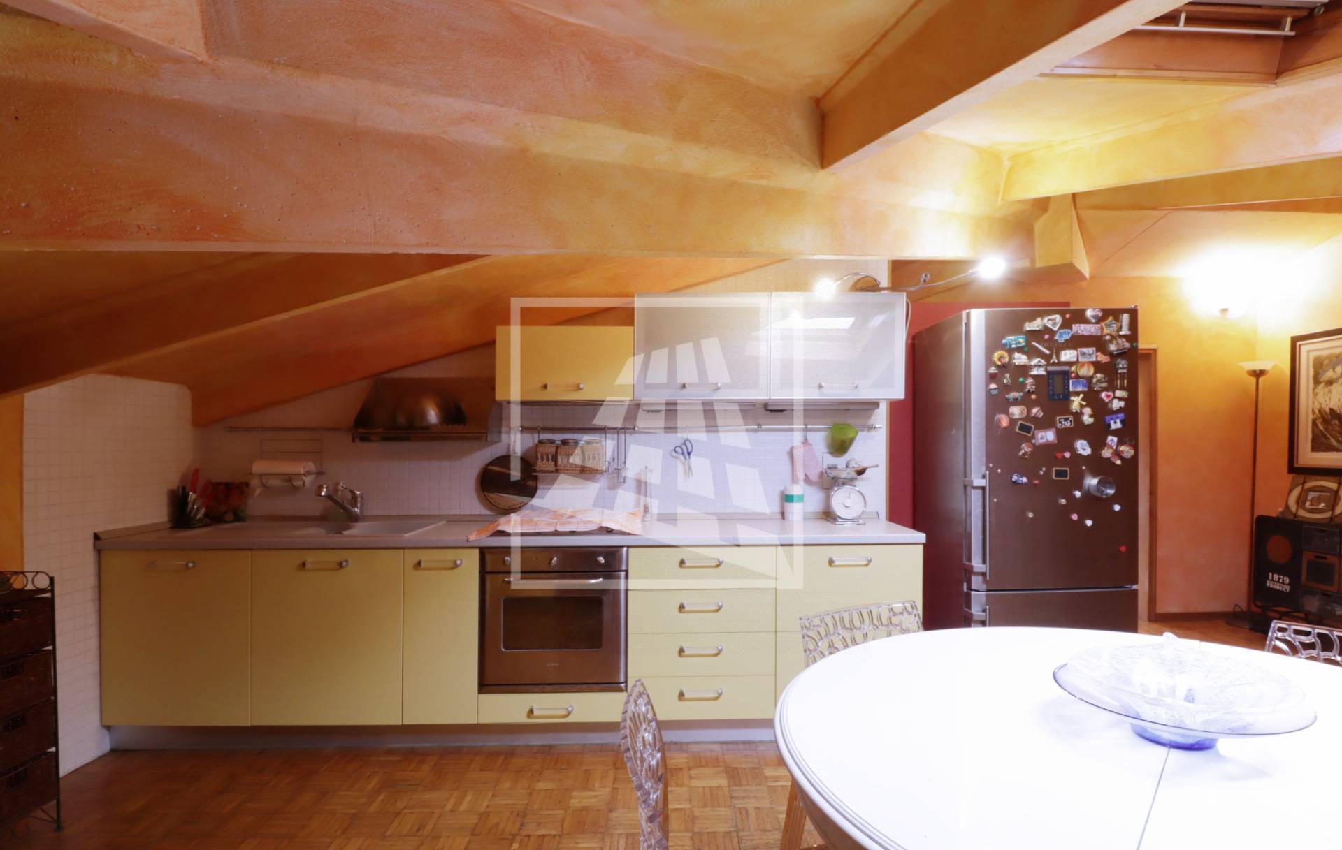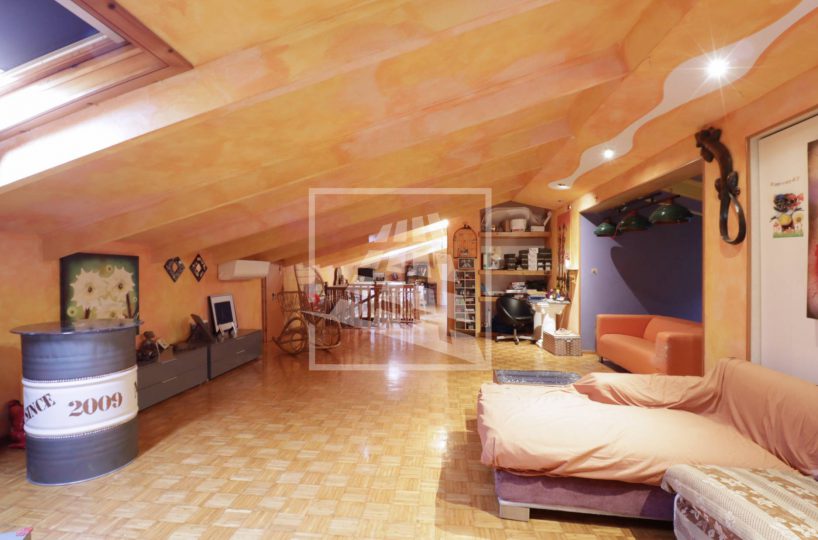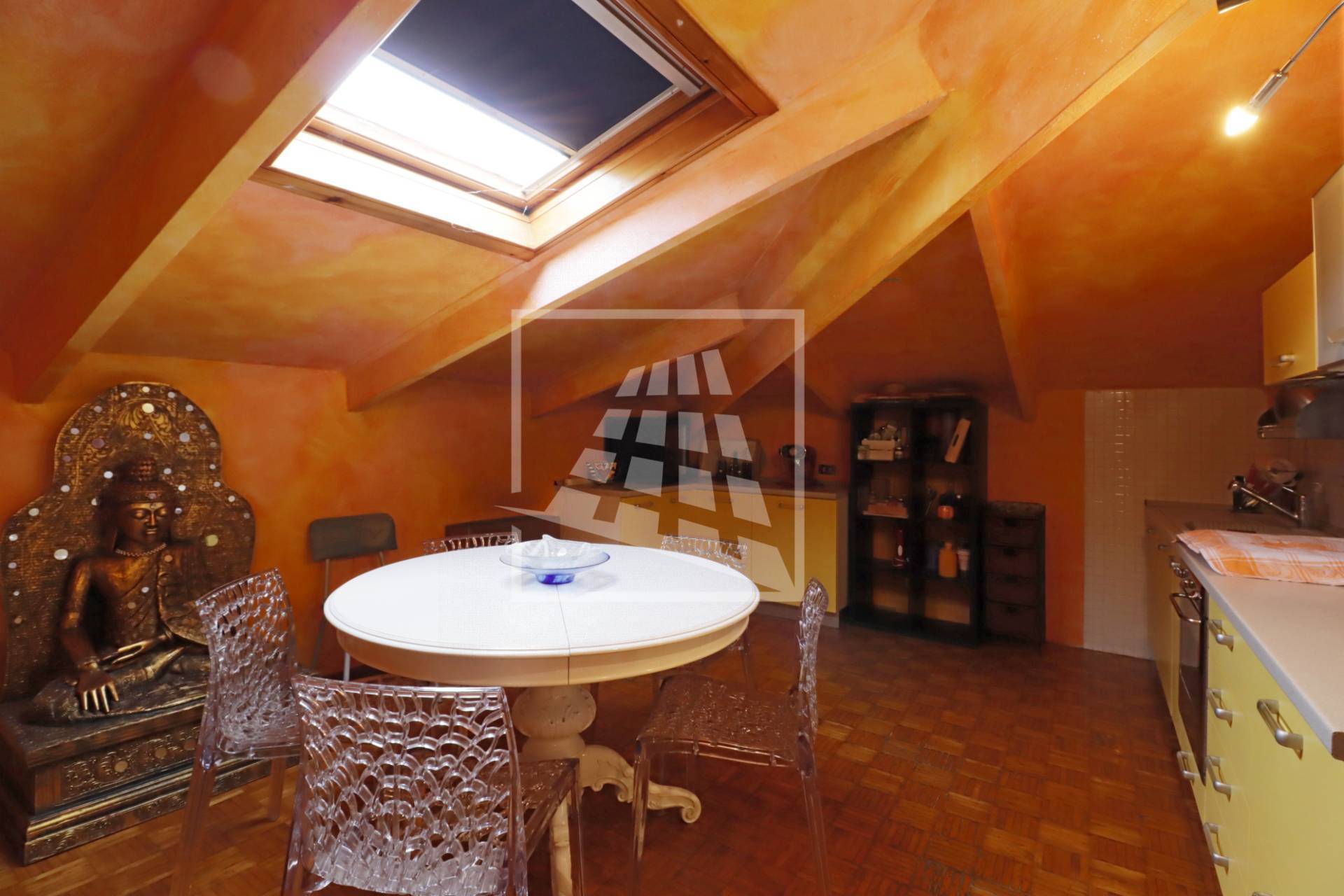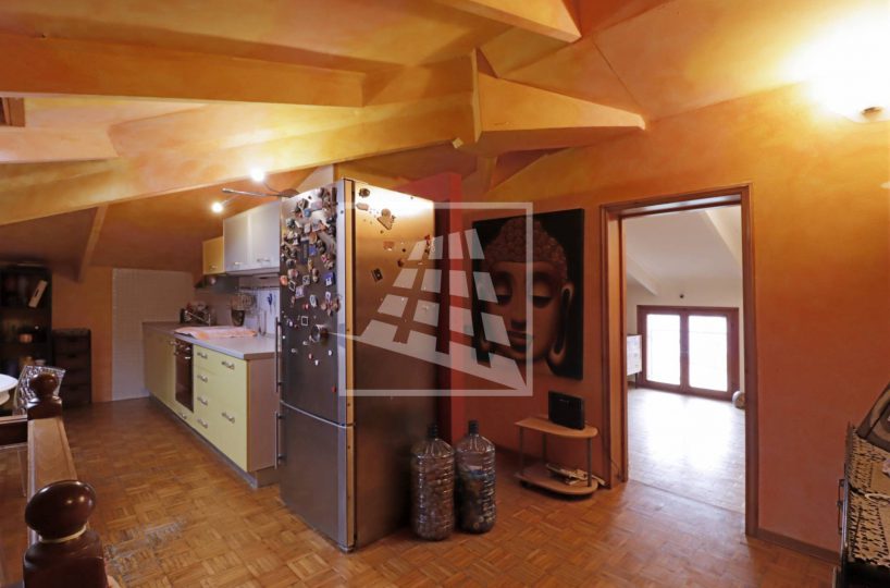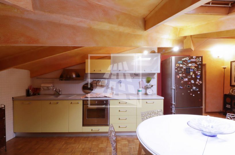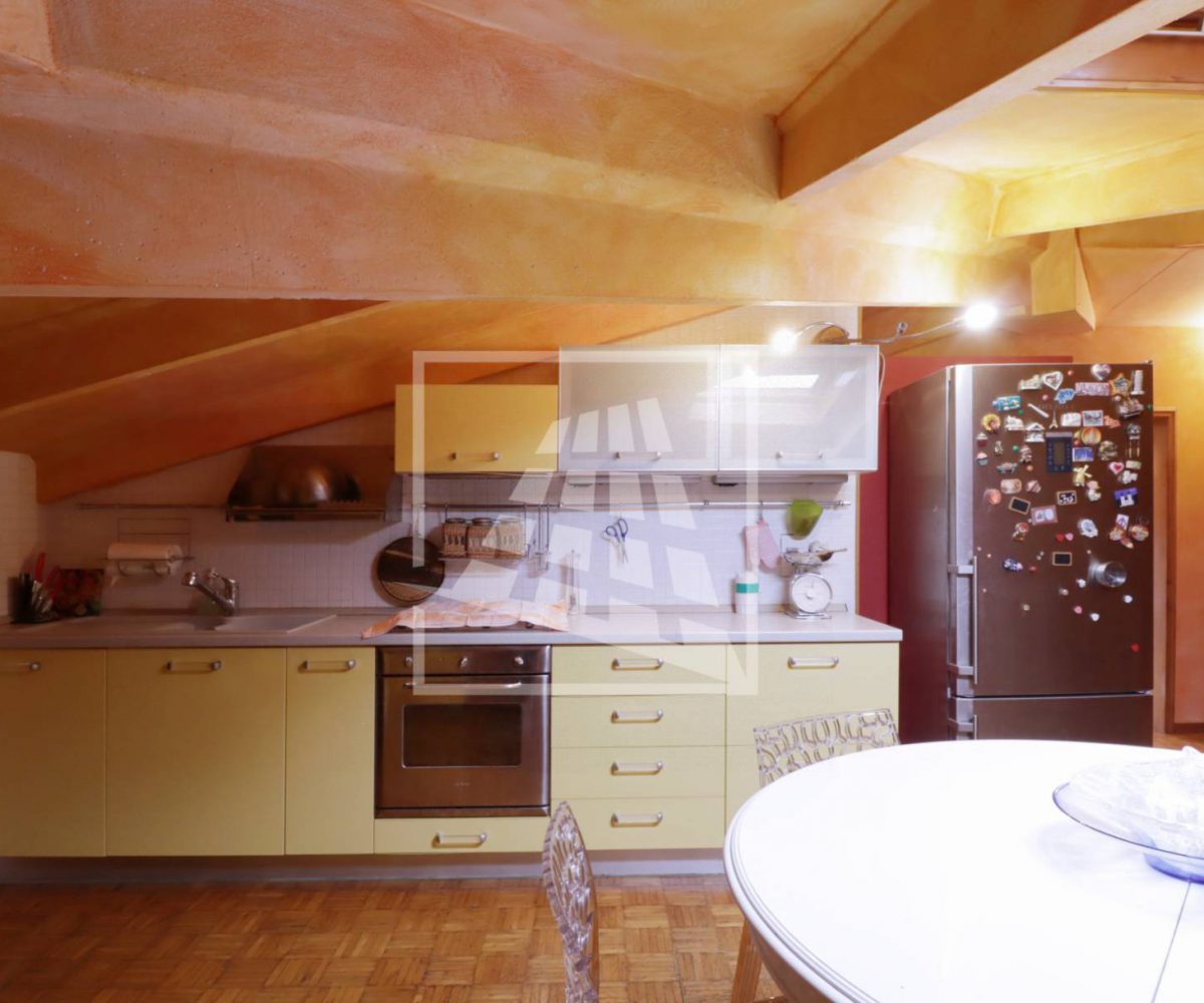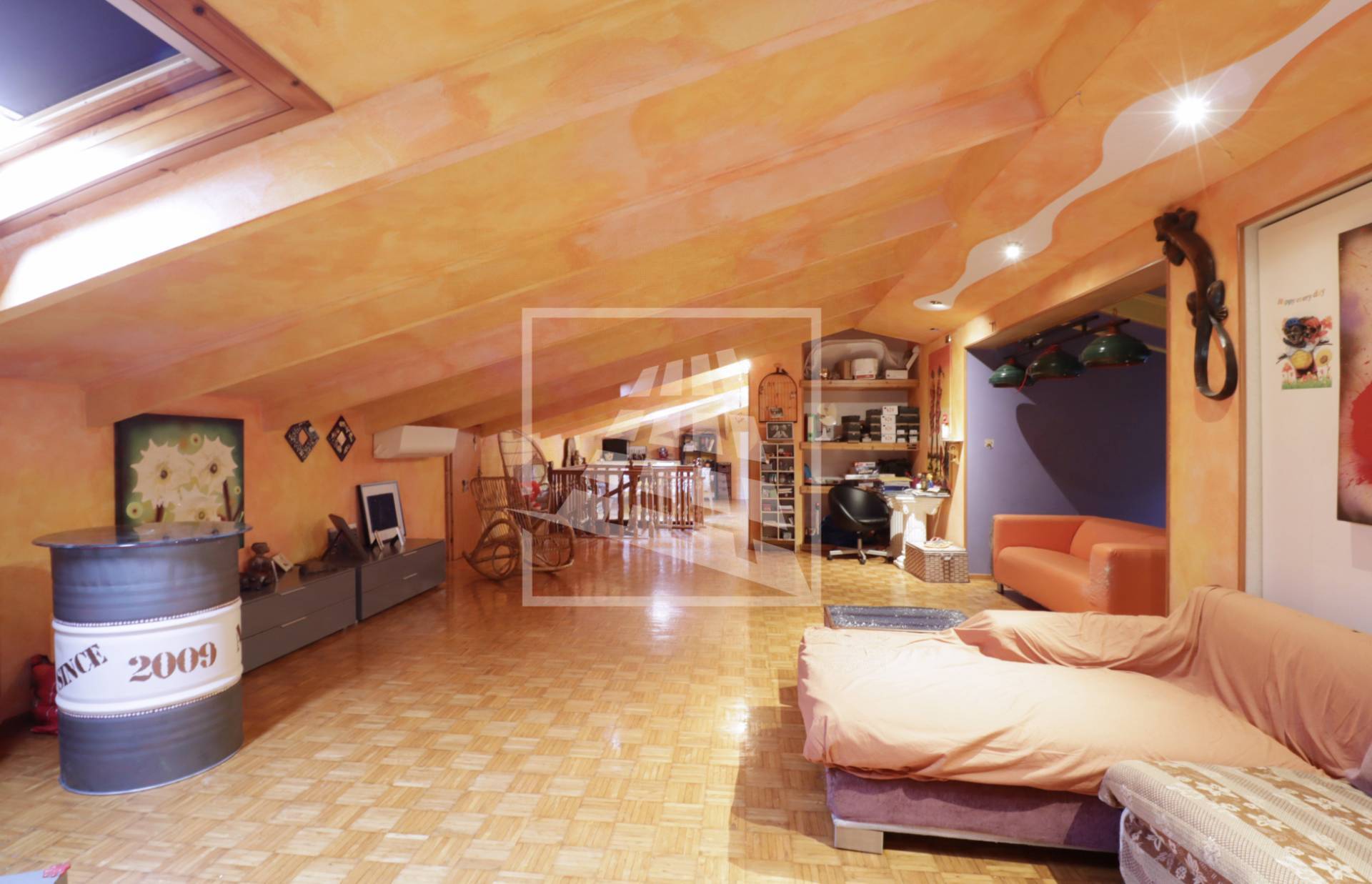 Attraverso una scala in legno si accede al piano superiore, una mansarda di 140 mq composta da tre ampi locali e un bagno di servizio.