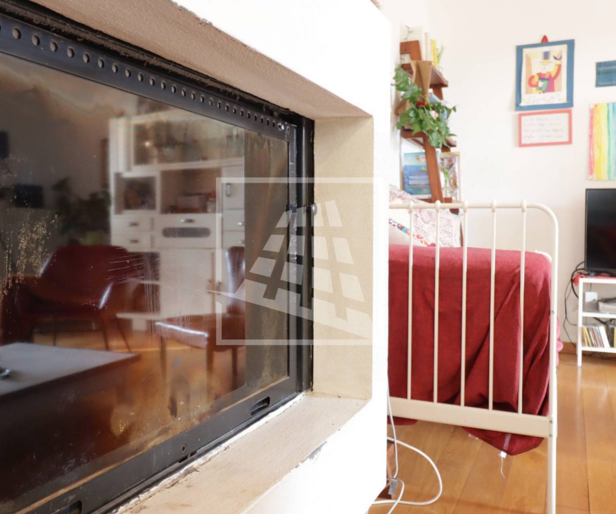 L’abitazione, accessibile tramite una scala esterna che conduce al porticato del primo piano, ospita un’ampia zona living con camino e cucina a vista.
