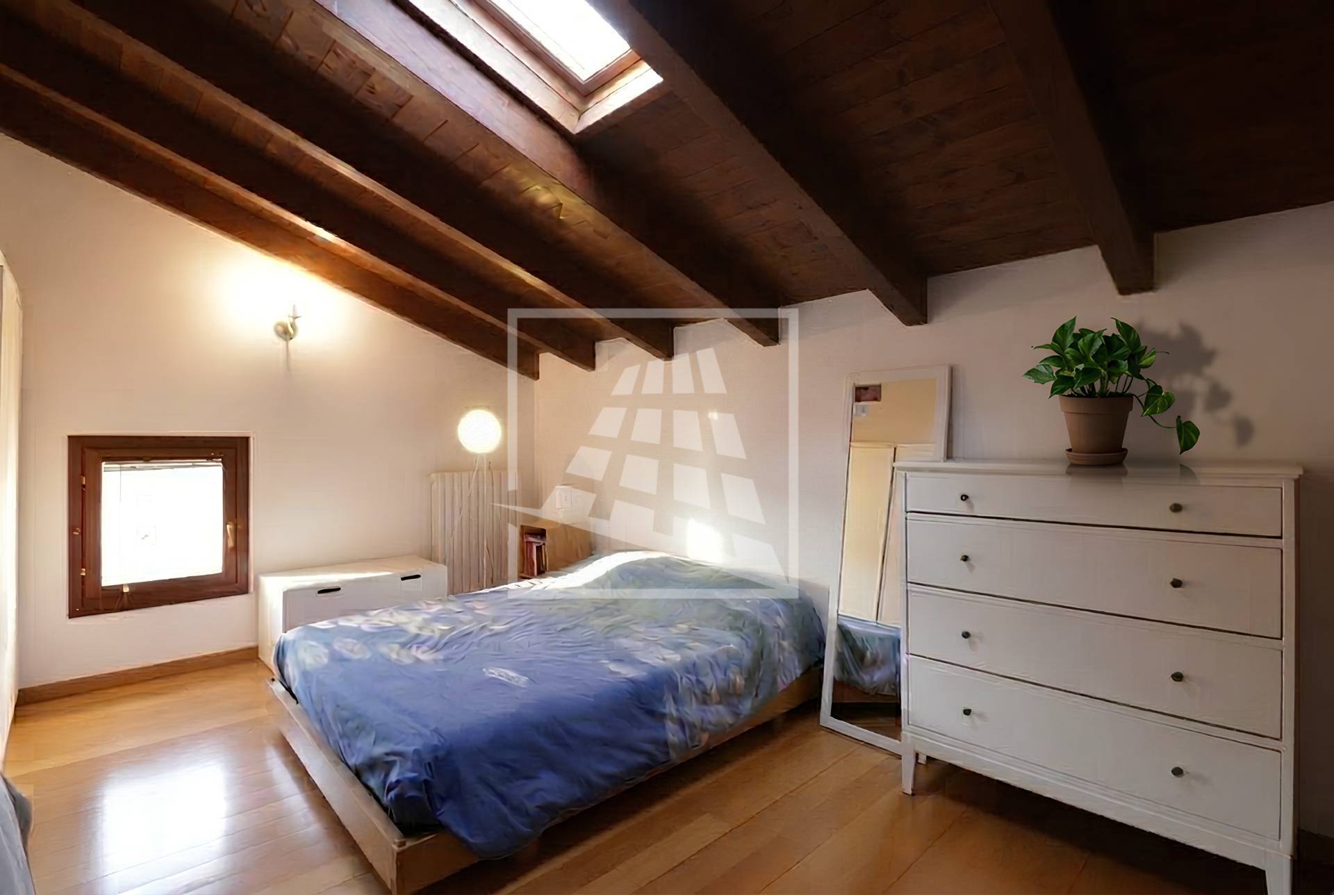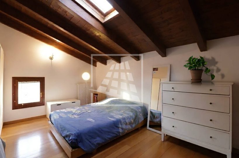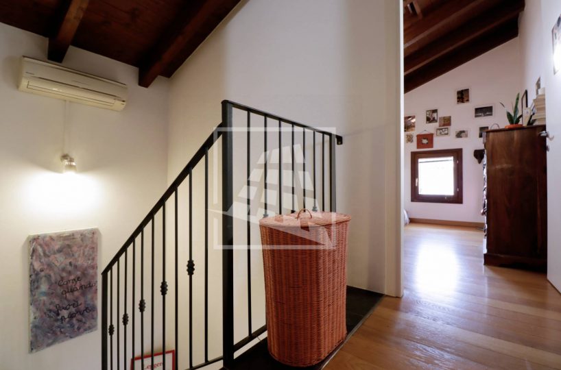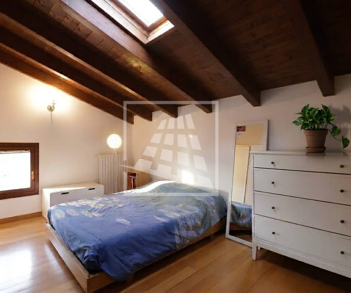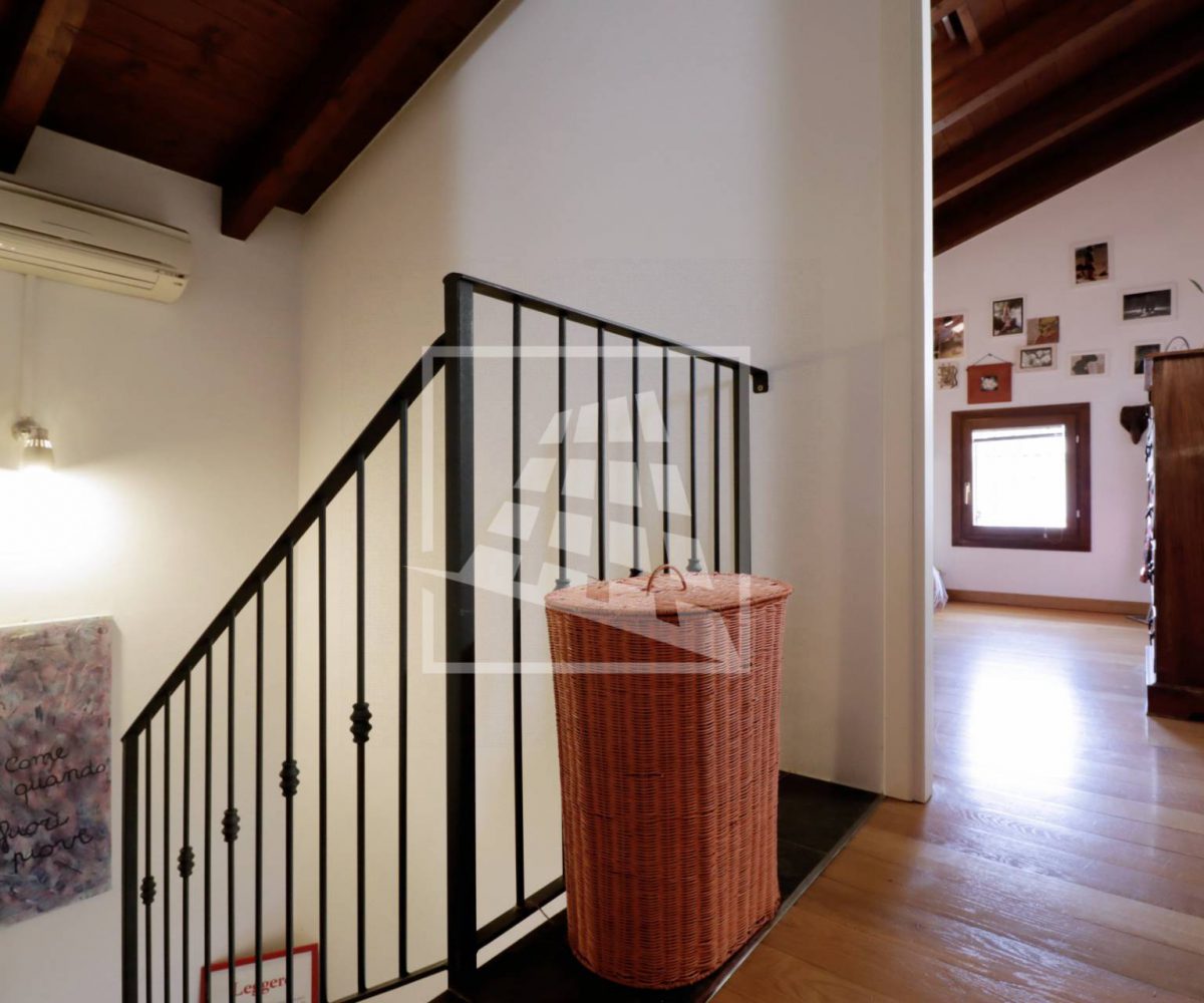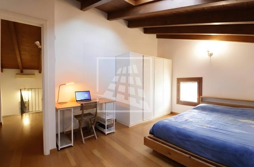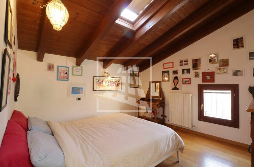 Una scala interna conduce al piano superiore, interamente dedicato alla zona notte mansardata, dove le suggestive travi in legno a vista donano calore e carattere agli ambienti.
