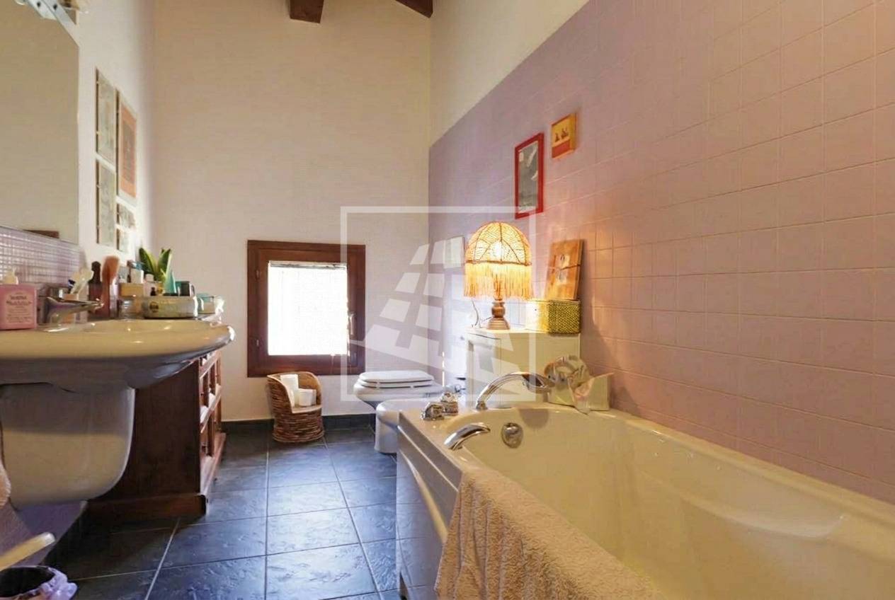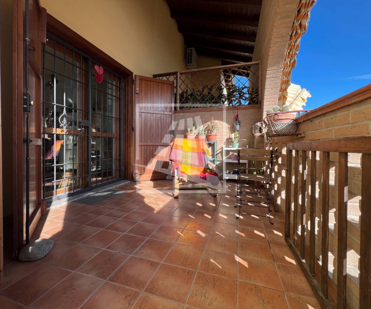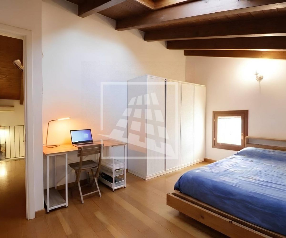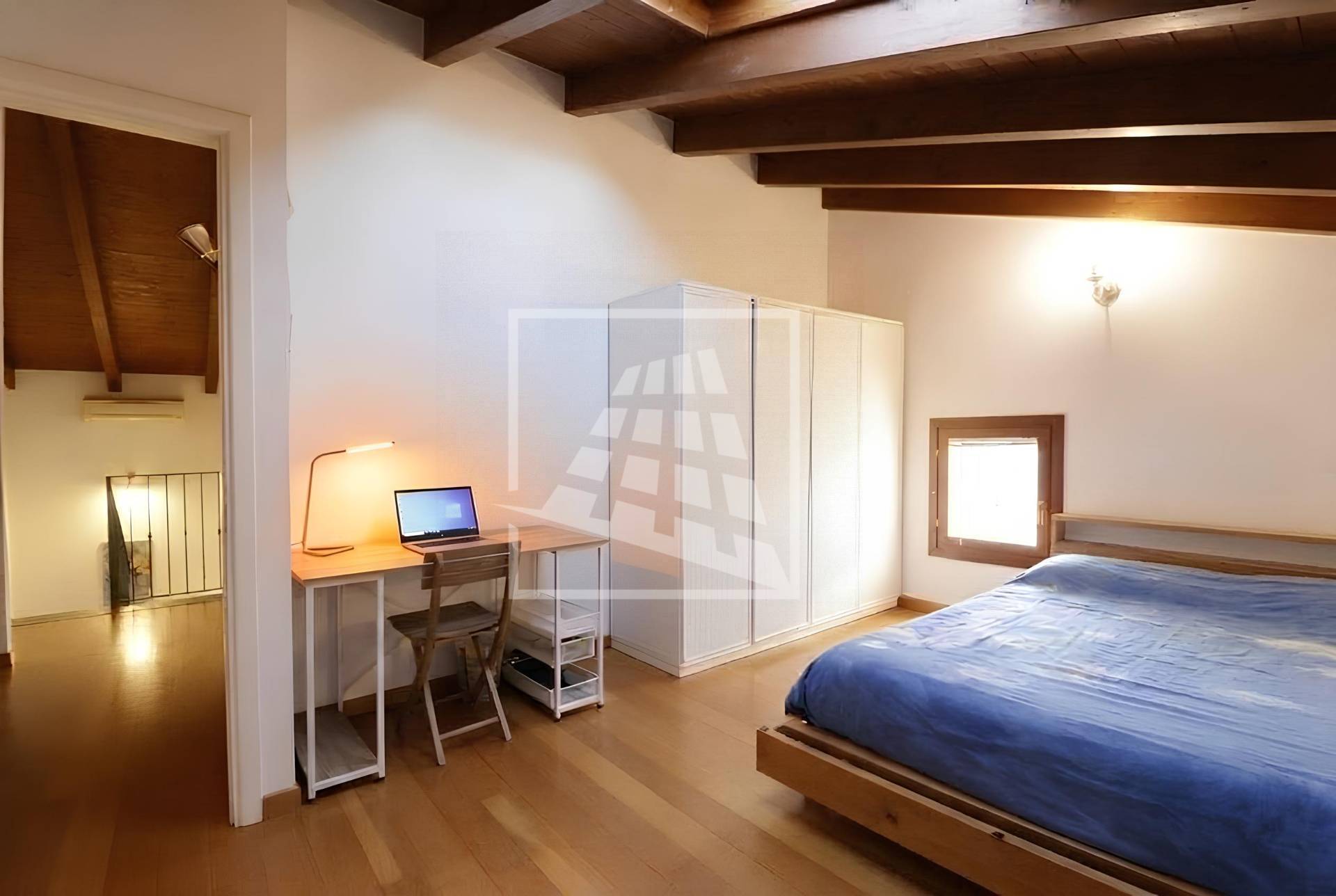 Una scala interna conduce al piano superiore, interamente dedicato alla zona notte mansardata, dove le suggestive travi in legno a vista donano calore e carattere agli ambienti.