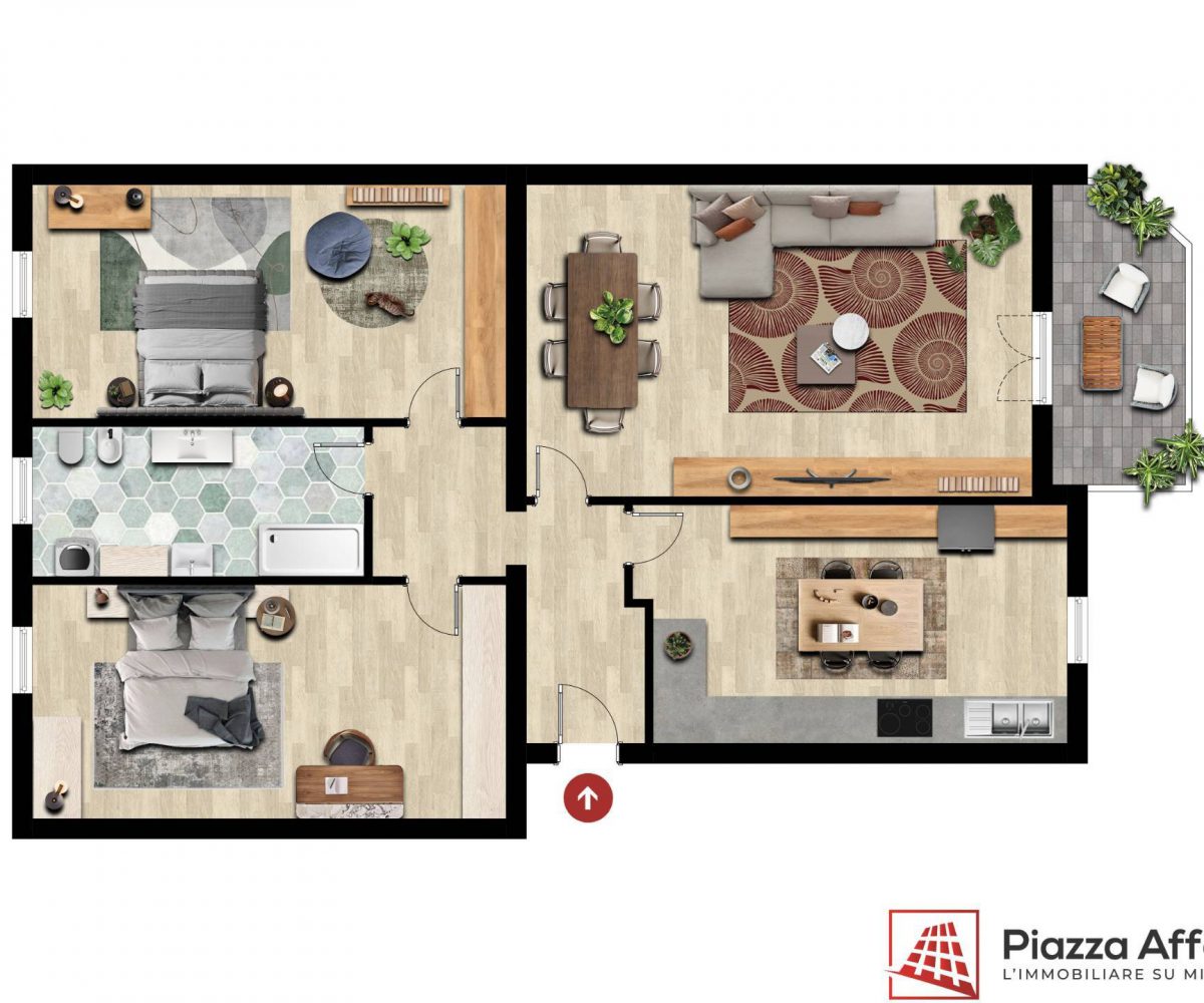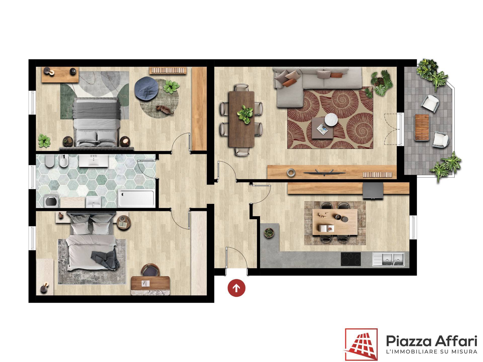 L’immobile è composto da ingresso su corridoio facilmente arredabile, soggiorno luminoso con accesso a piccolo balcone, cucina abitabile e zona notte con due camere da letto matrimoniali e bagno finestrato completo di angolo lavanderia.