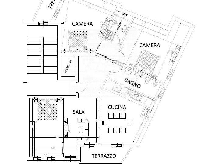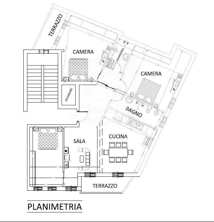 -realizzazione di un appartamento con ingresso, ampia sala, cucina abitabile con terrazzo, 2 camere da letto (una delle quali con terrazzo) bagno e lavanderia,