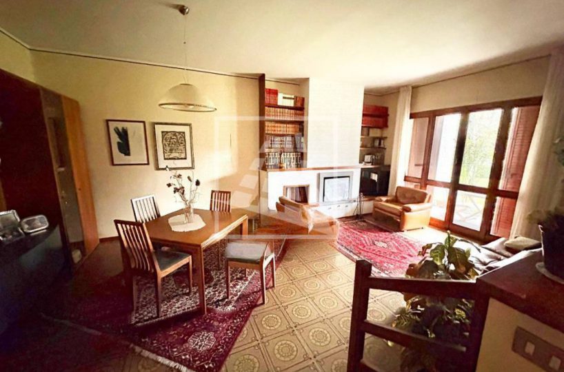 La zona giorno, situata al piano terra, accoglie gli ospiti in un luminoso soggiorno impreziosito da un camino, dove un’ampia vetrata crea un dialogo costante con il giardino privato.