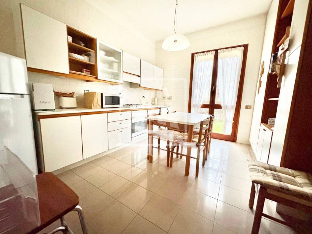 La cucina, abitabile e funzionale, dispone di un secondo accesso al giardino di proprietà , il piano è completato da una comoda camera matrimoniale, un bagno e un ripostiglio.
