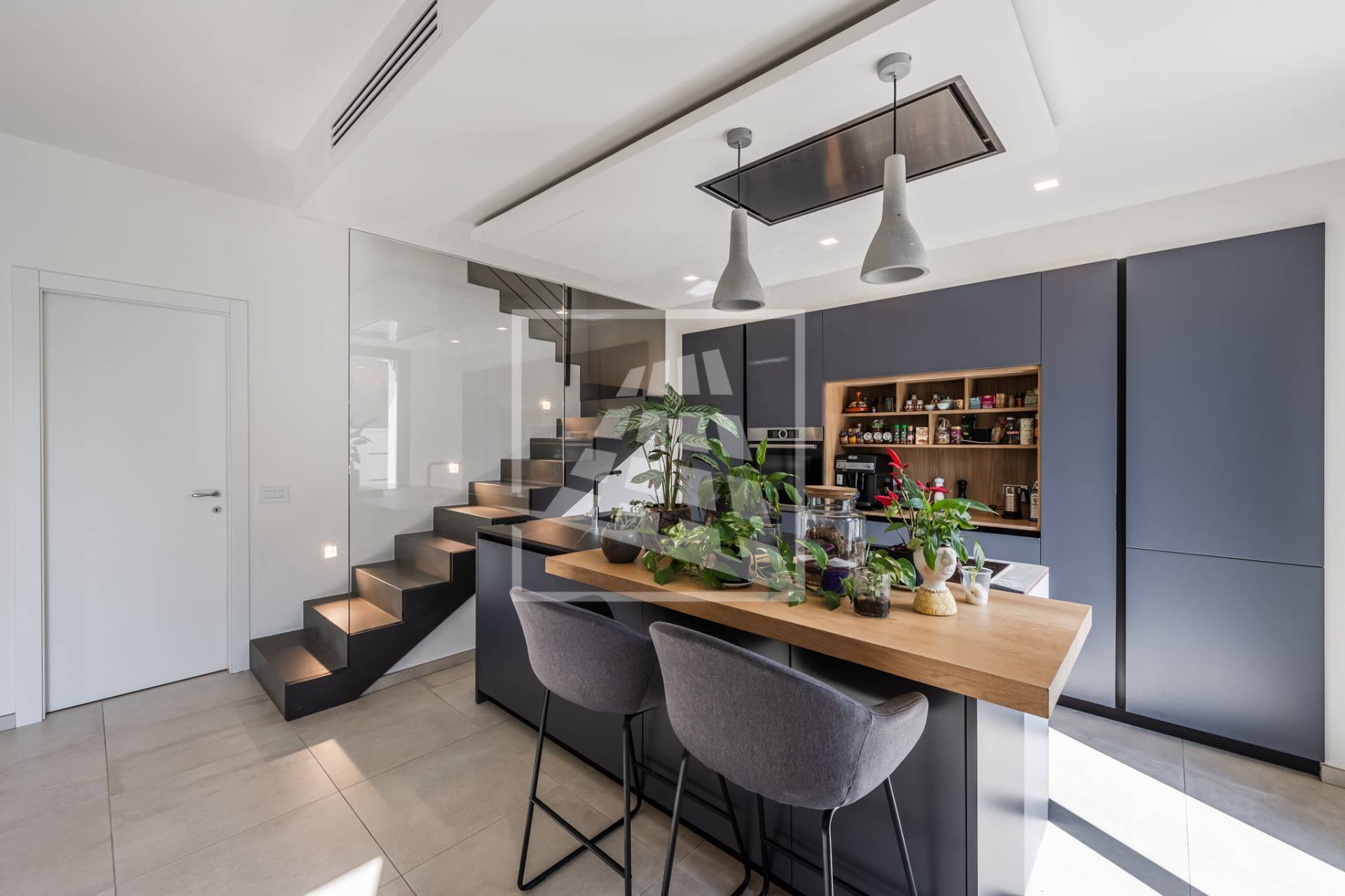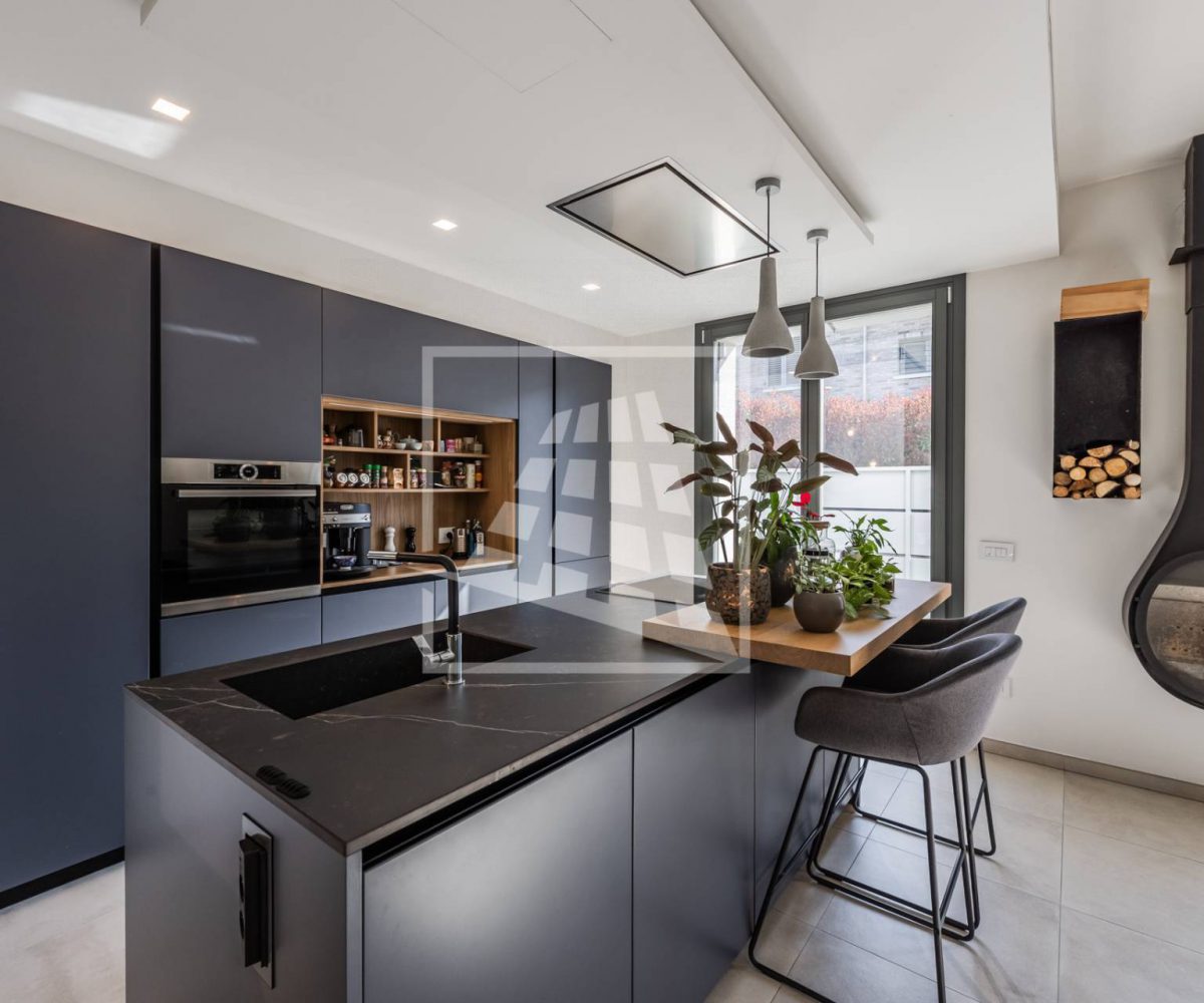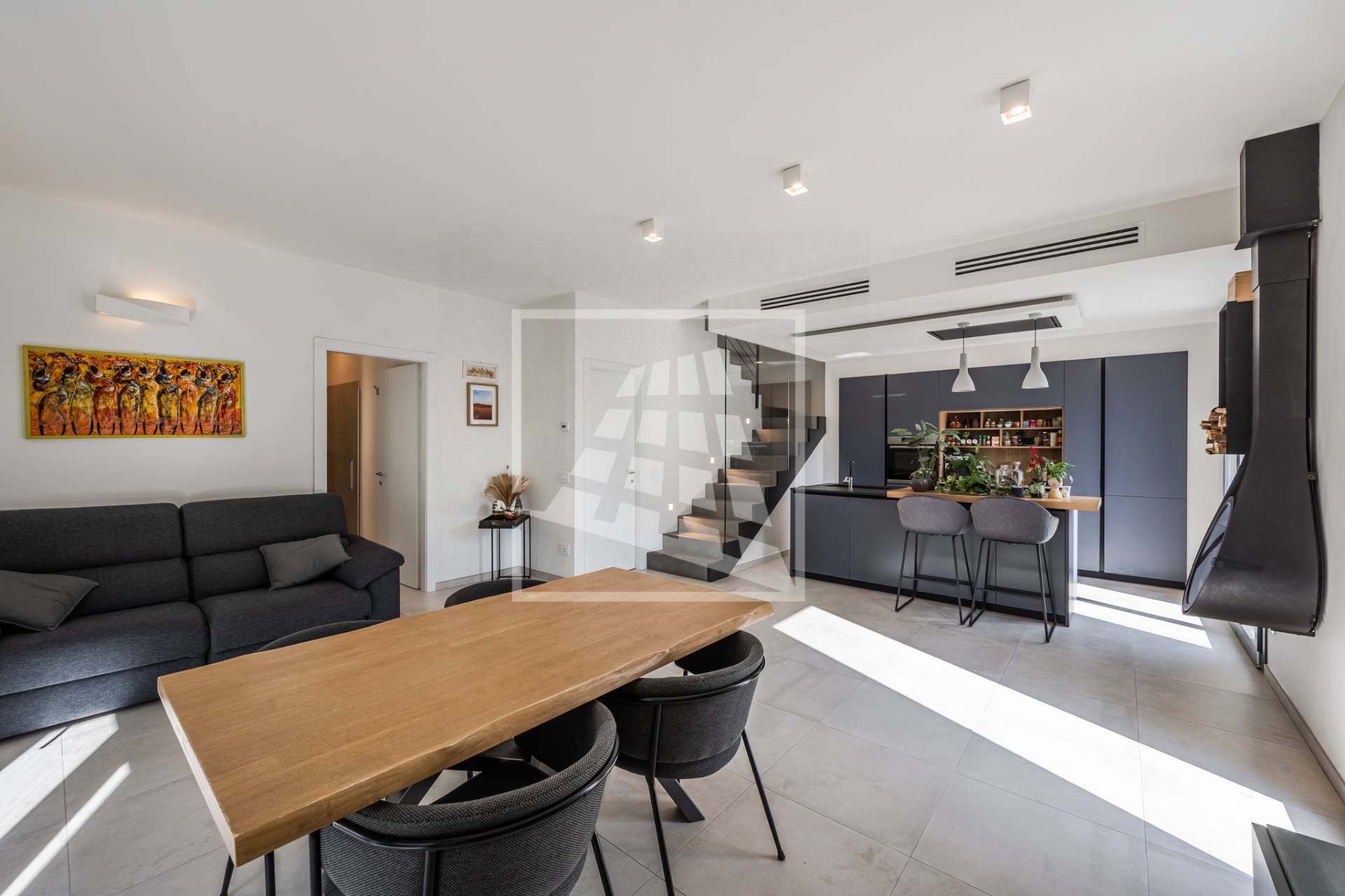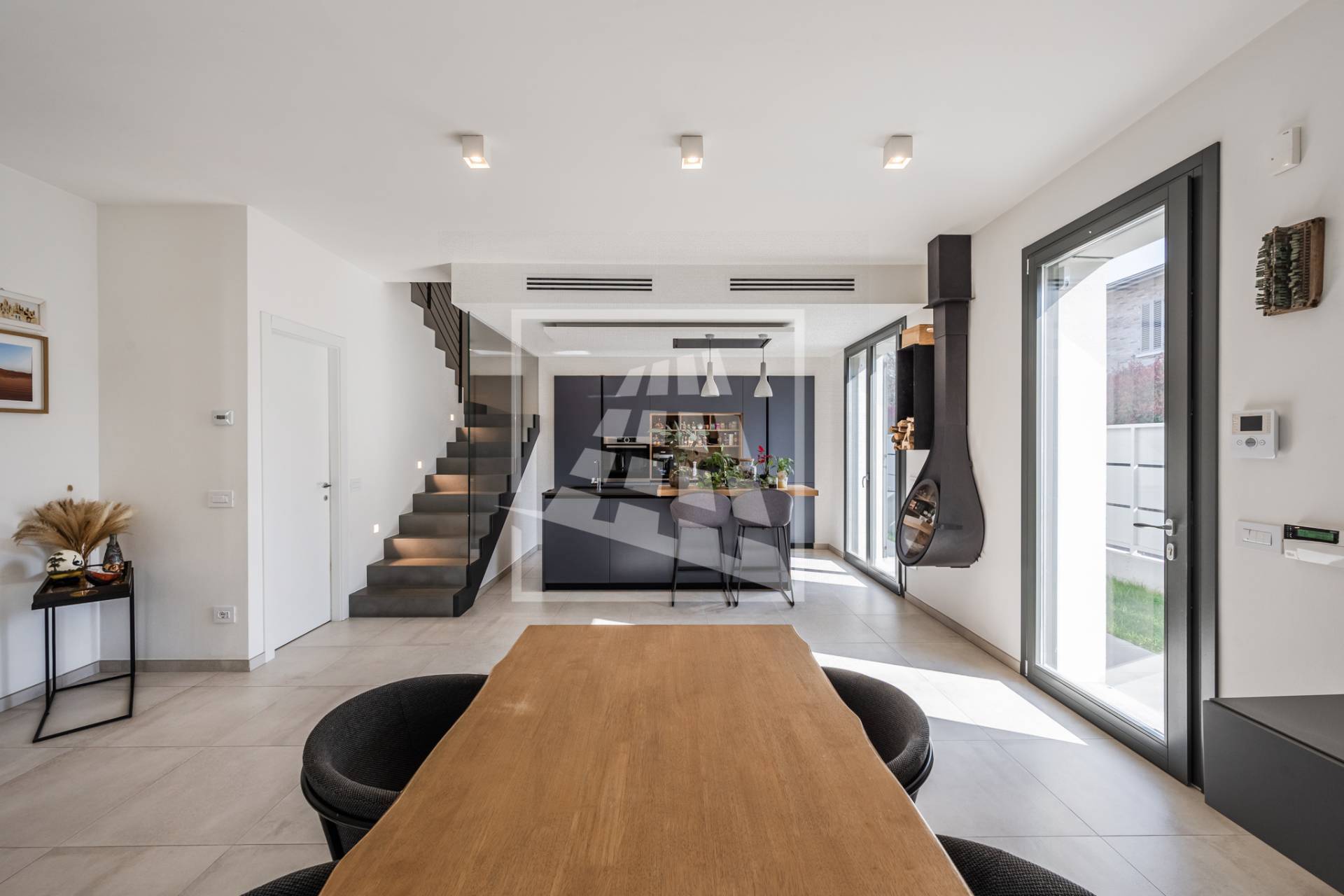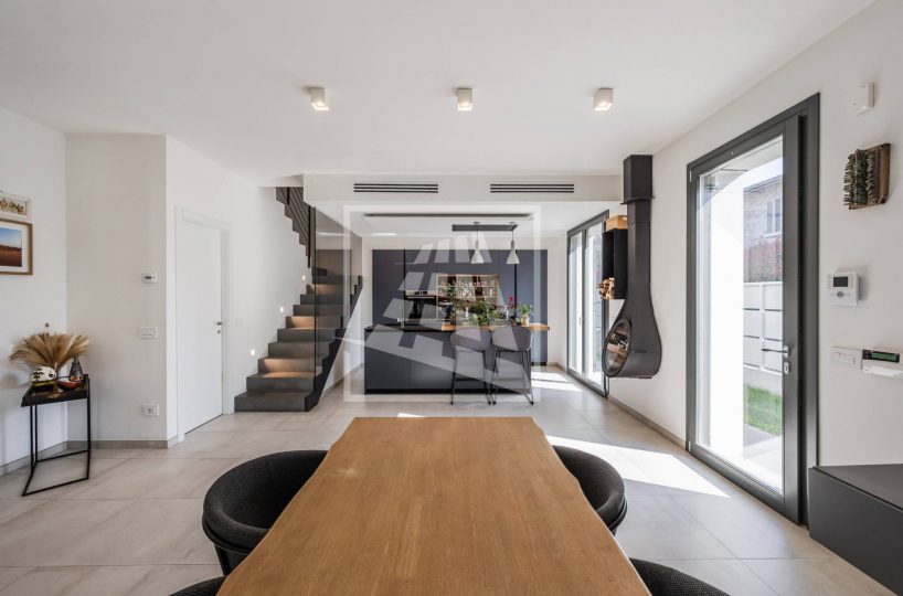 L’ingresso al piano terra apre su un ampio living con zona pranzo, dominato da una moderna cucina a vista con isola (marca Doimo) e un camino a legna di design, che conferisce carattere e calore all’ambiente.