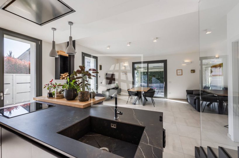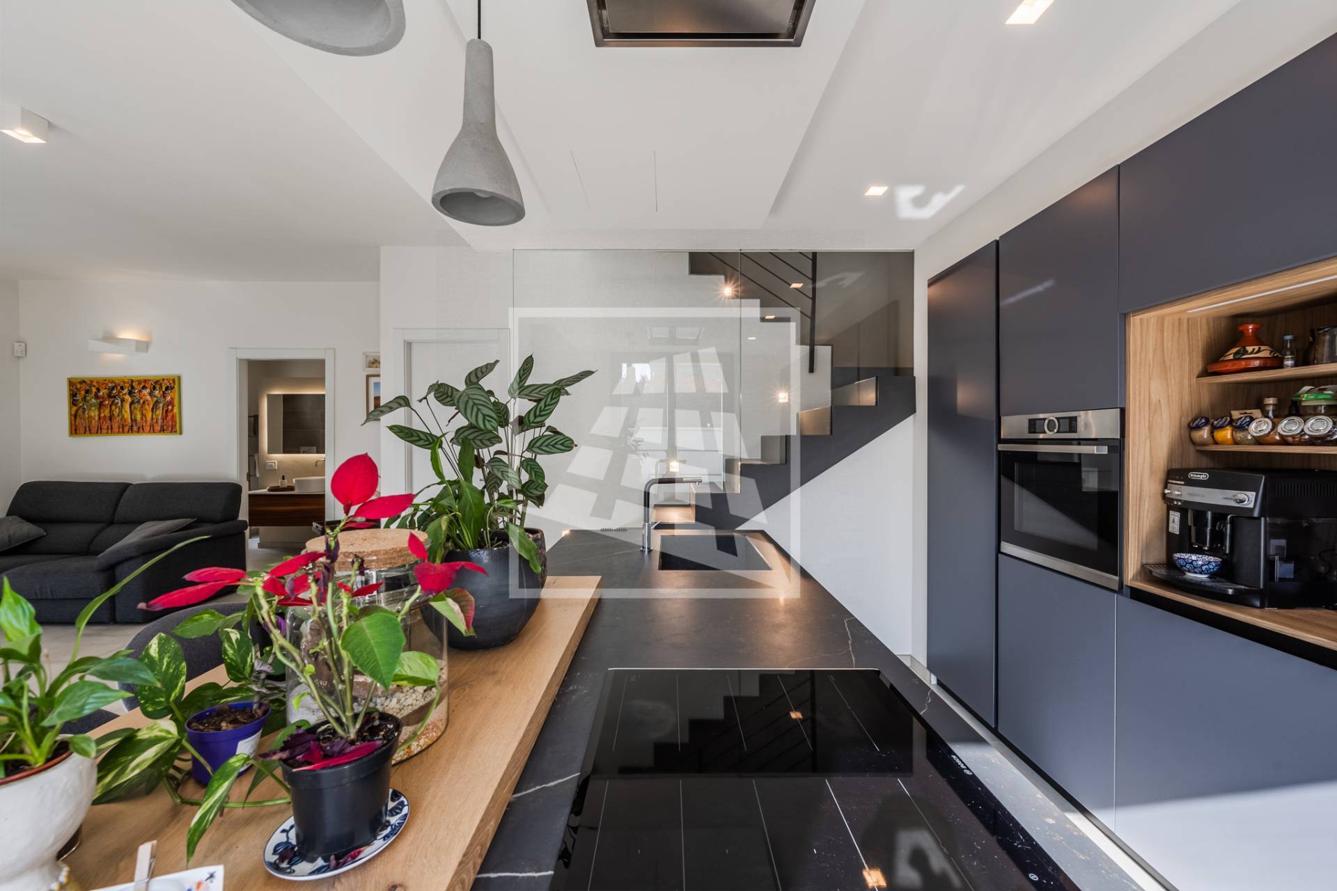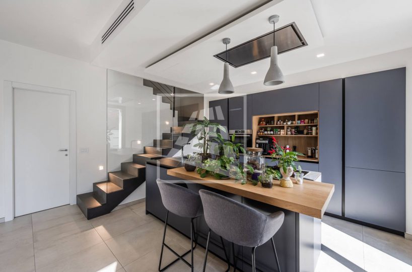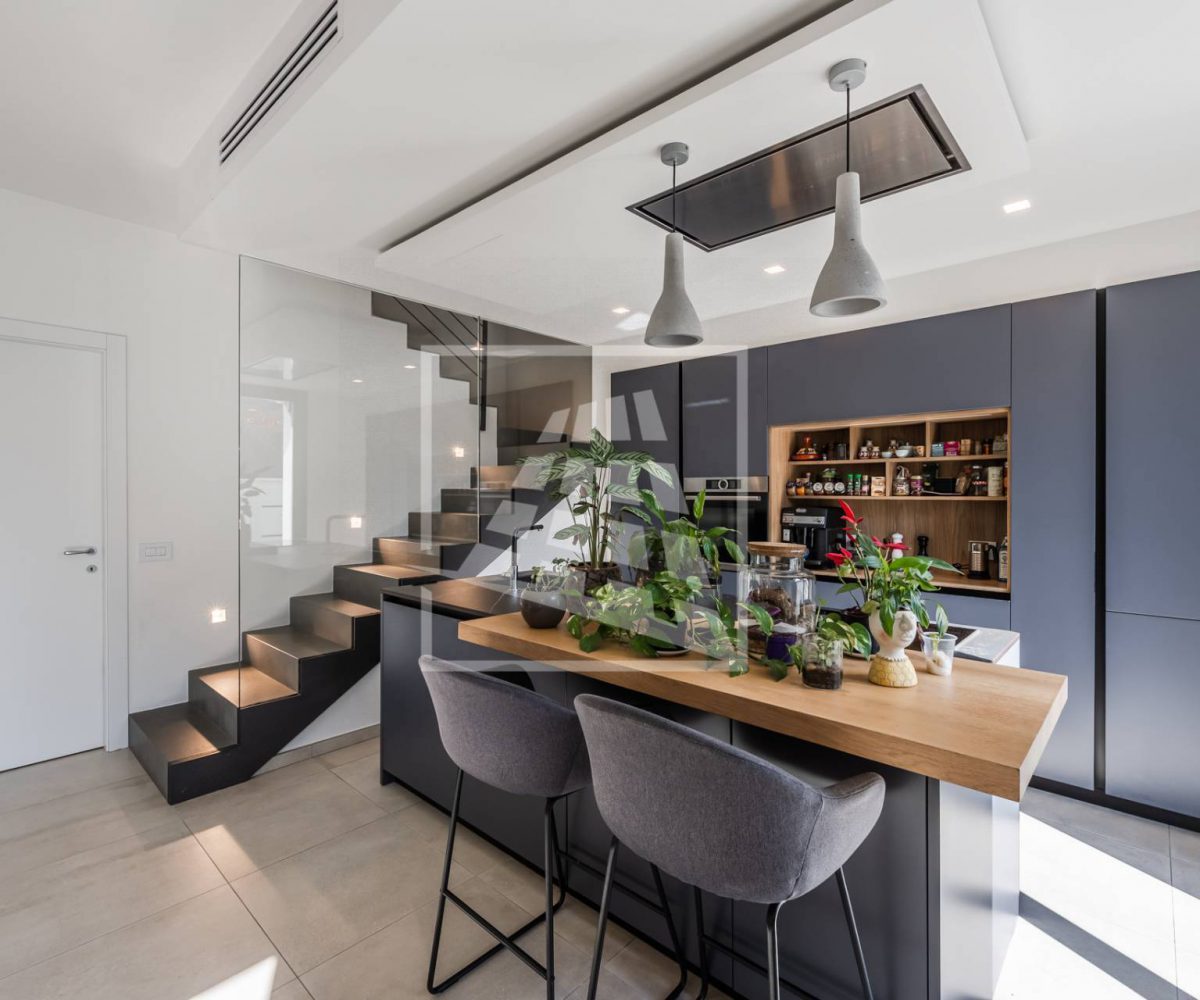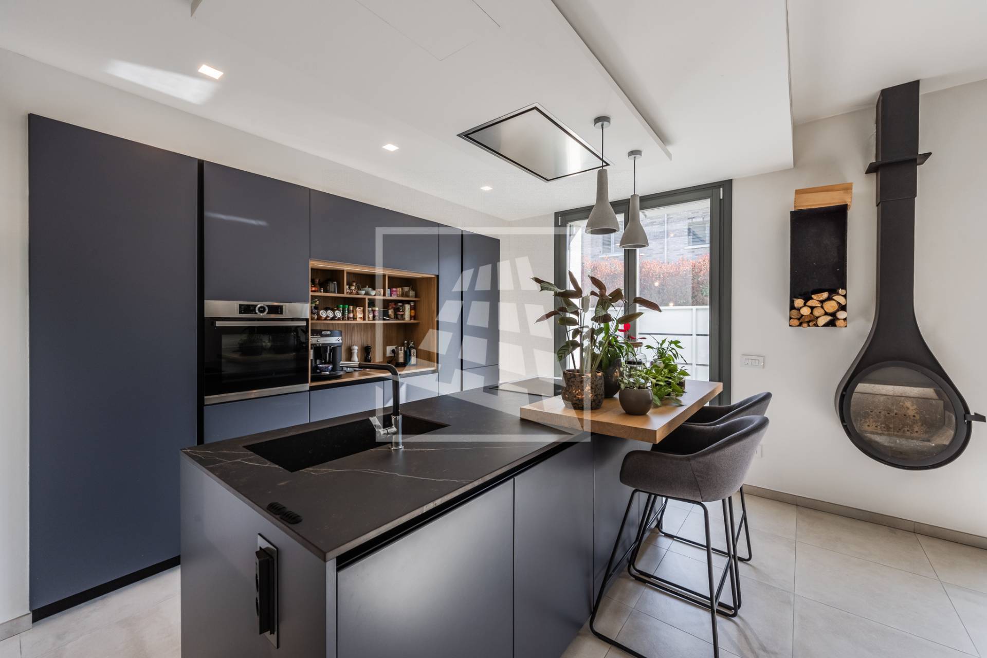 L’ingresso al piano terra apre su un ampio living con zona pranzo, dominato da una moderna cucina a vista con isola (marca Doimo) e un camino a legna di design, che conferisce carattere e calore all’ambiente.