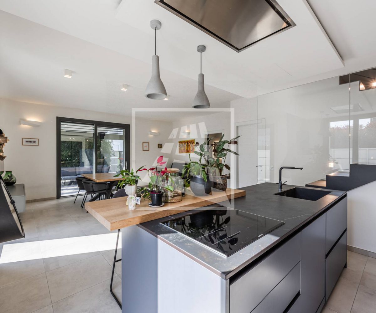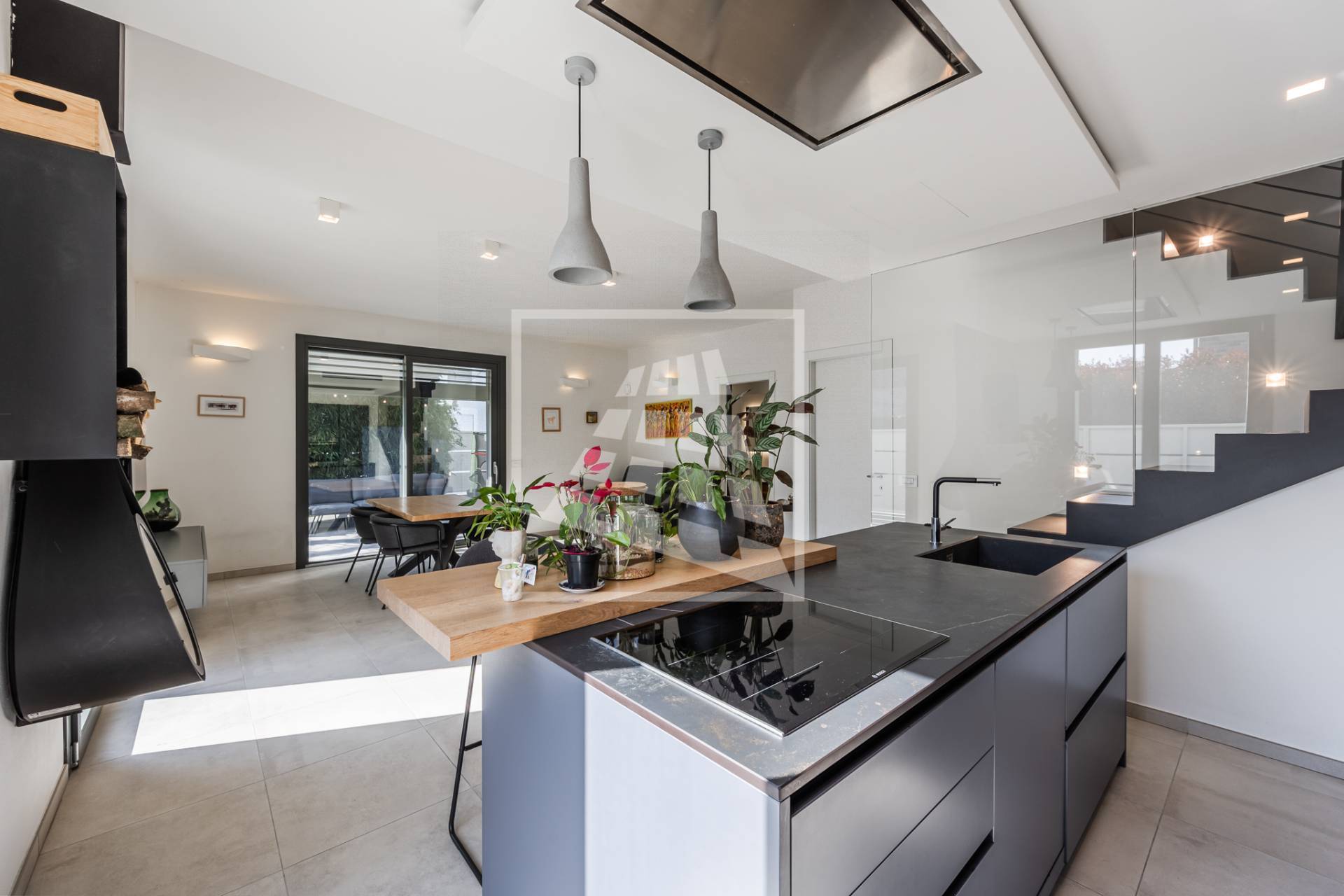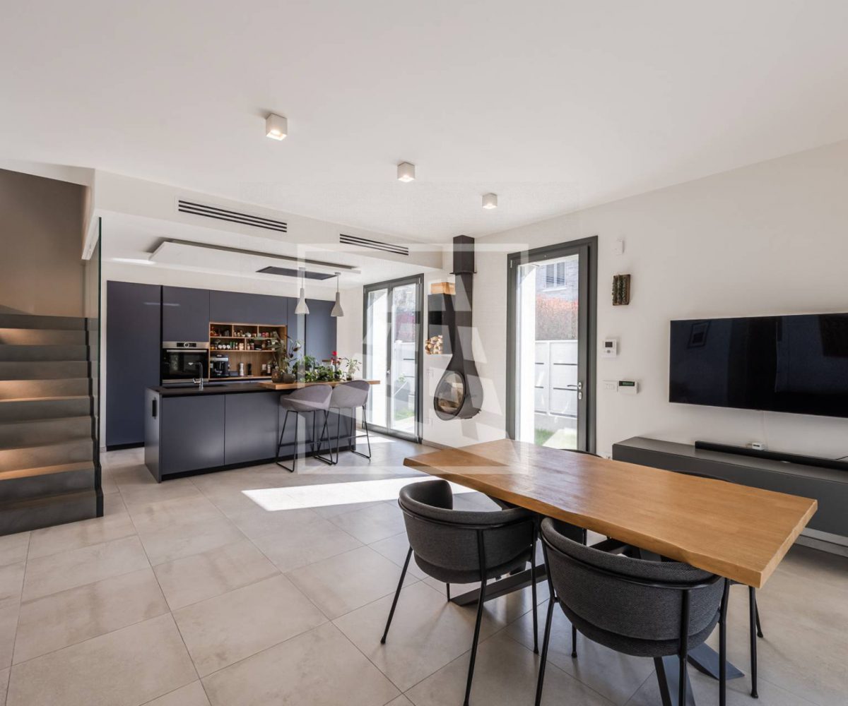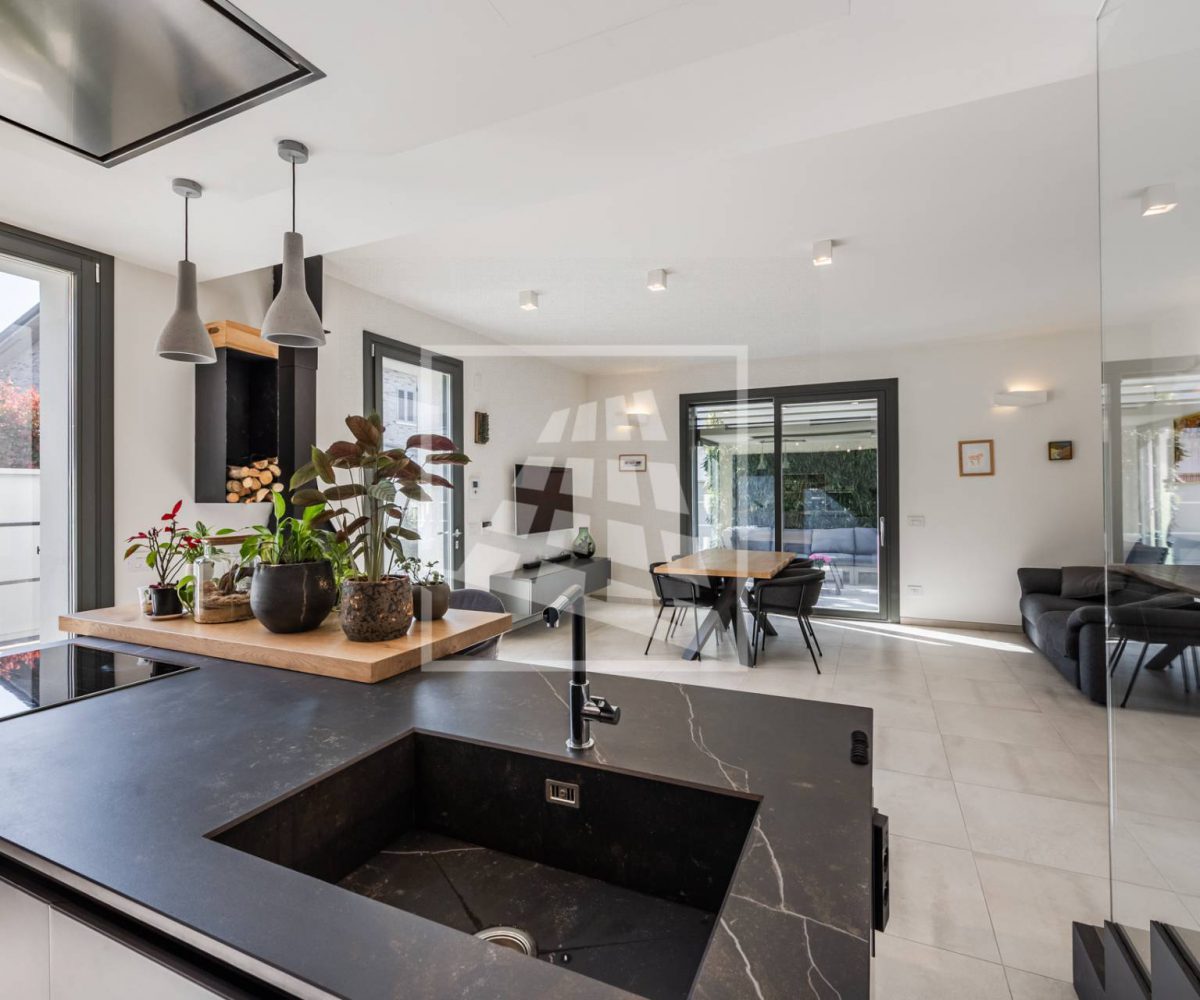 L’ingresso al piano terra apre su un ampio living con zona pranzo, dominato da una moderna cucina a vista con isola (marca Doimo) e un camino a legna di design, che conferisce carattere e calore all’ambiente.